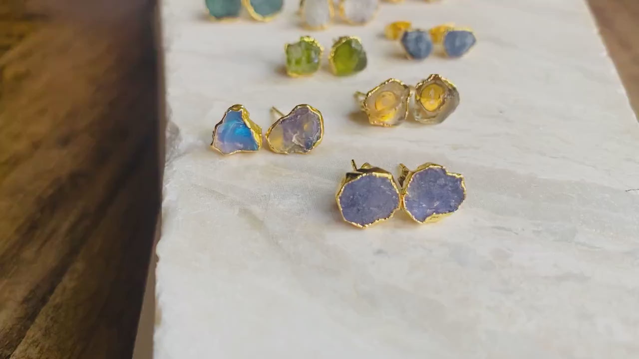 Each of the stones we use to create these special earrings were formed by nature over millions of years. Each one is unique and beautiful just like nature itself. They will vary one to another, just like Mother Nature intended. We don't treat our stones in any way and accept their rough and "imperfect" beauty and try to highlight their uniqueness in our plating process. We don't polish away "flaws" in the stones but rather leave them in their natural state. The pair you receive will be what nature intended that stone to be and may be lighter or darker, clear or more opaque, smooth or rough, rounded or angular. Just like people, each stone has special characteristics unique to itself and in that lies the beauty.