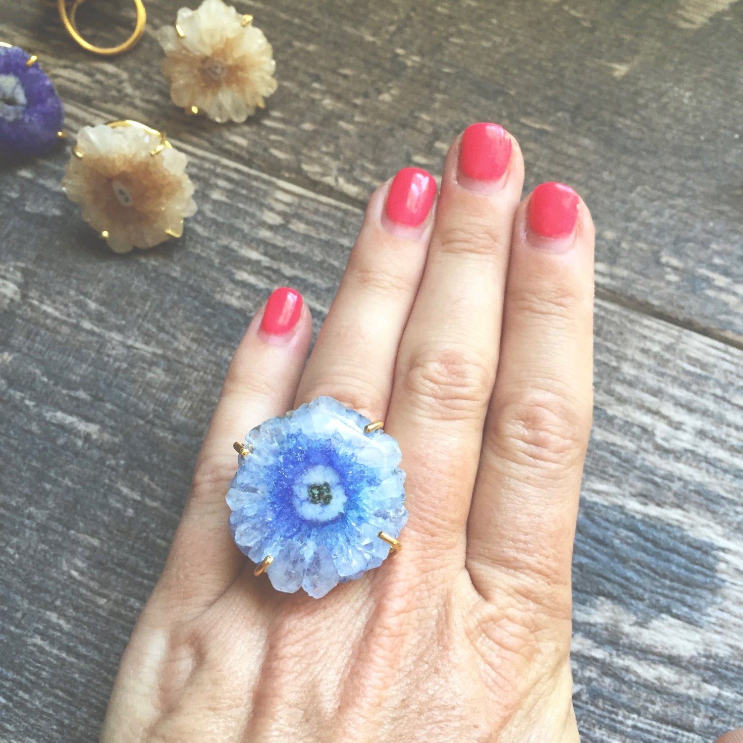 Make a statement with this oversized, adjustable raw solar quartz cigar ring. Solar quartz is cut from stalactites and is usually white, gray or colorless, here it's been color treated to a beautiful blue jean color. When it is cut, you can see concentric circles in a radiating pattern and the center may reveal druzy, small quartz crystals, or air bubbles. The stone has a 24k gold electroplated edge and is set on an adjustable gold-electroplated double ring band.