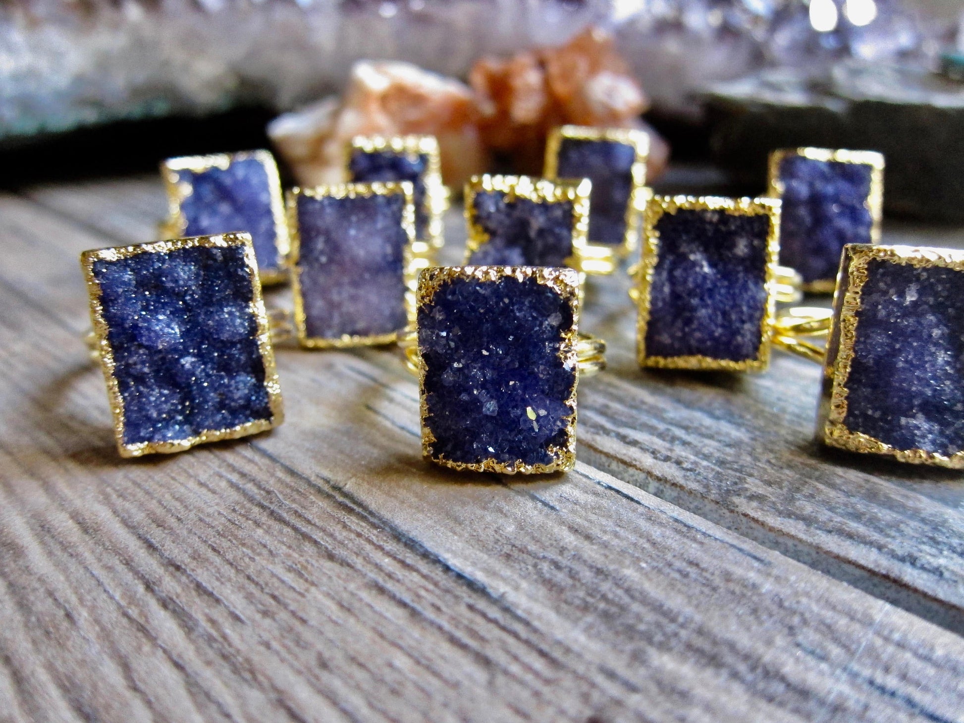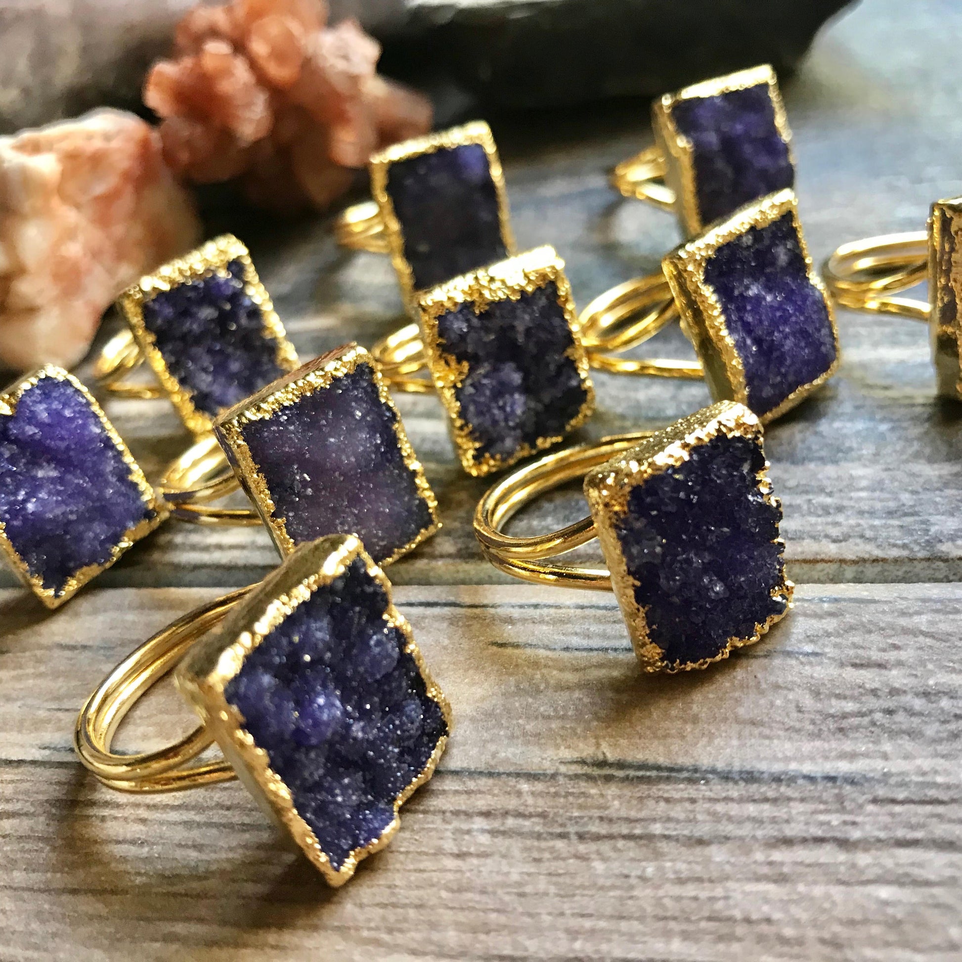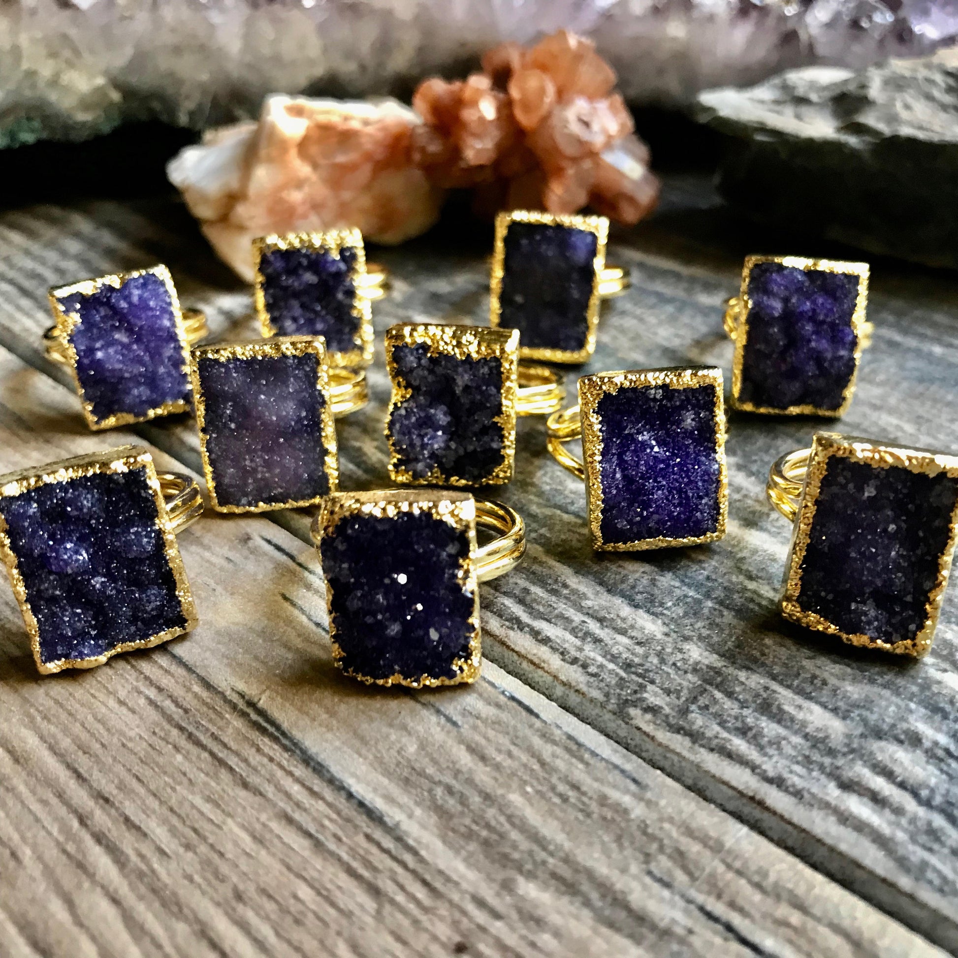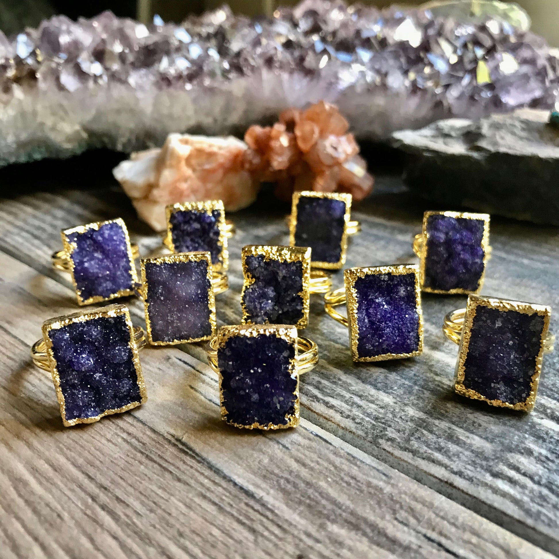 Make a statement with this oversized amethyst druzy gemstone ring. All the sparkle and dazzle that druzy has to offer, the crystals in these stones are large and in charge. Amethyst druzy crystal stones are electroplated in 14k gold over brass and feature an gold plated adjustable band.