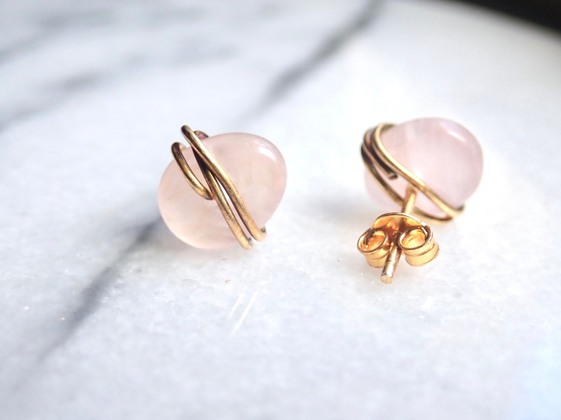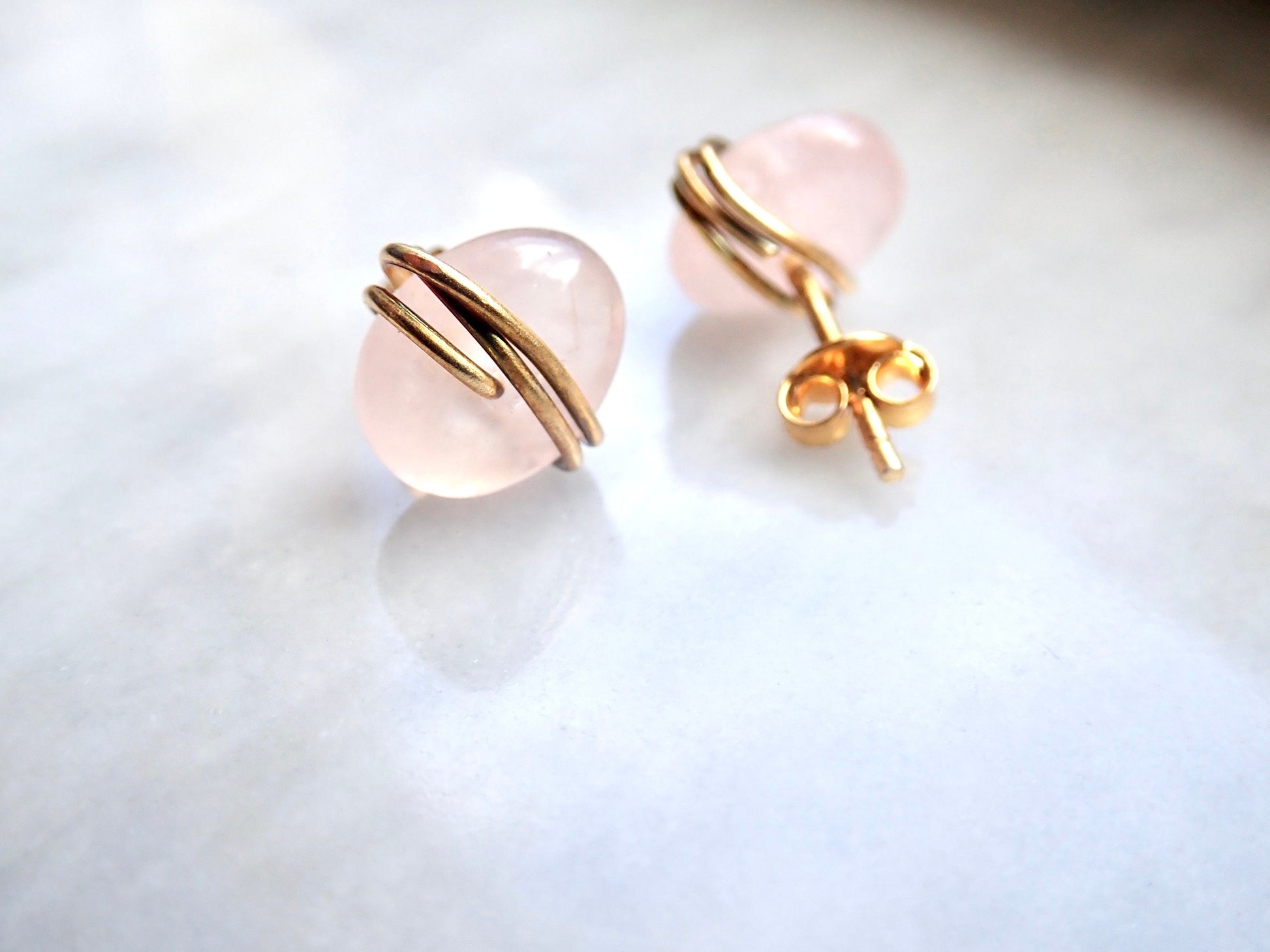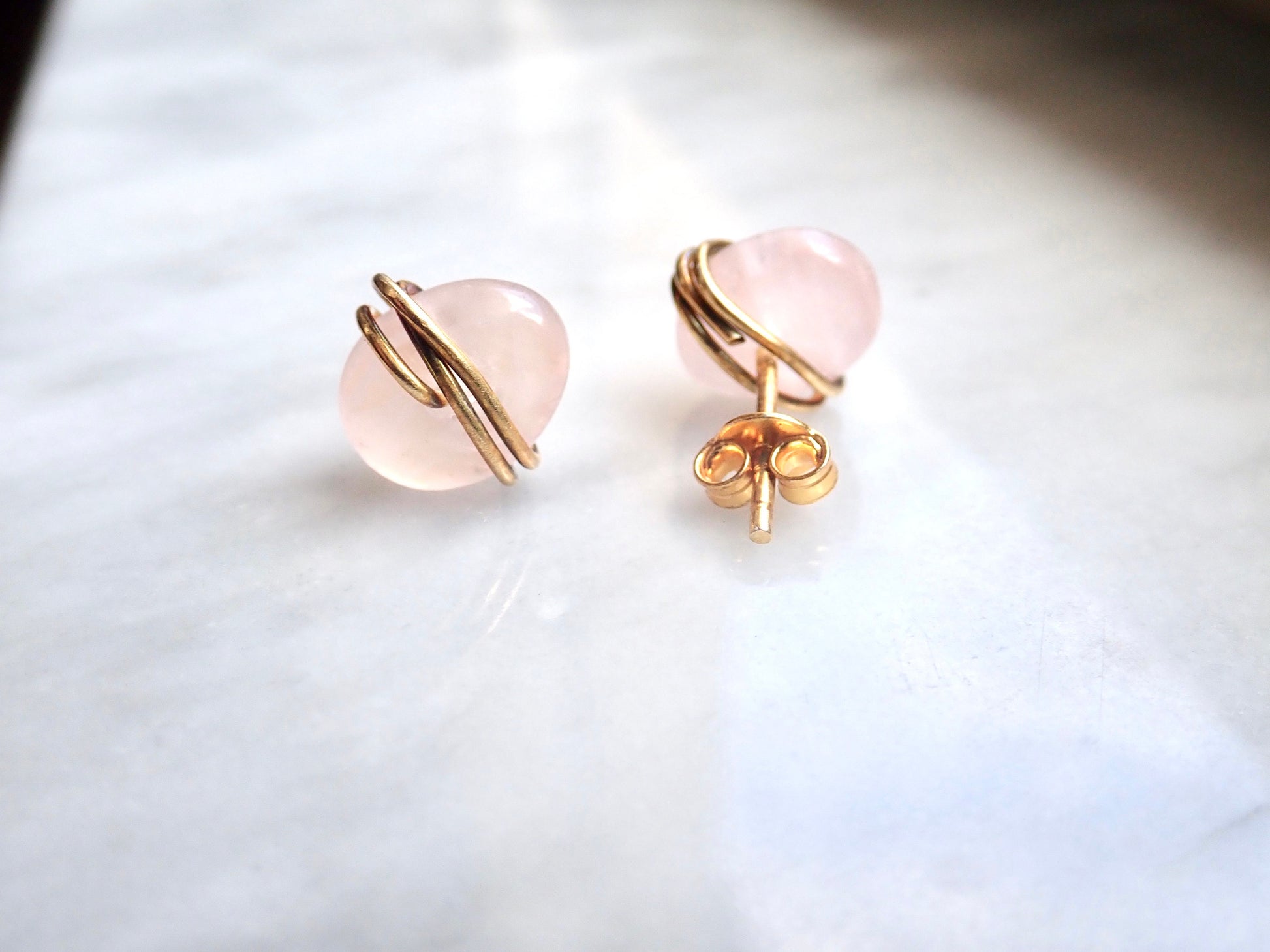 Smooth and polished rose quartz is hand wire-wrapped in these dainty and minimalist stud earrings. Wire and posts are genuine 14k gold over sterling silver so these are hypo-allergenic and safe for sensitive ears.