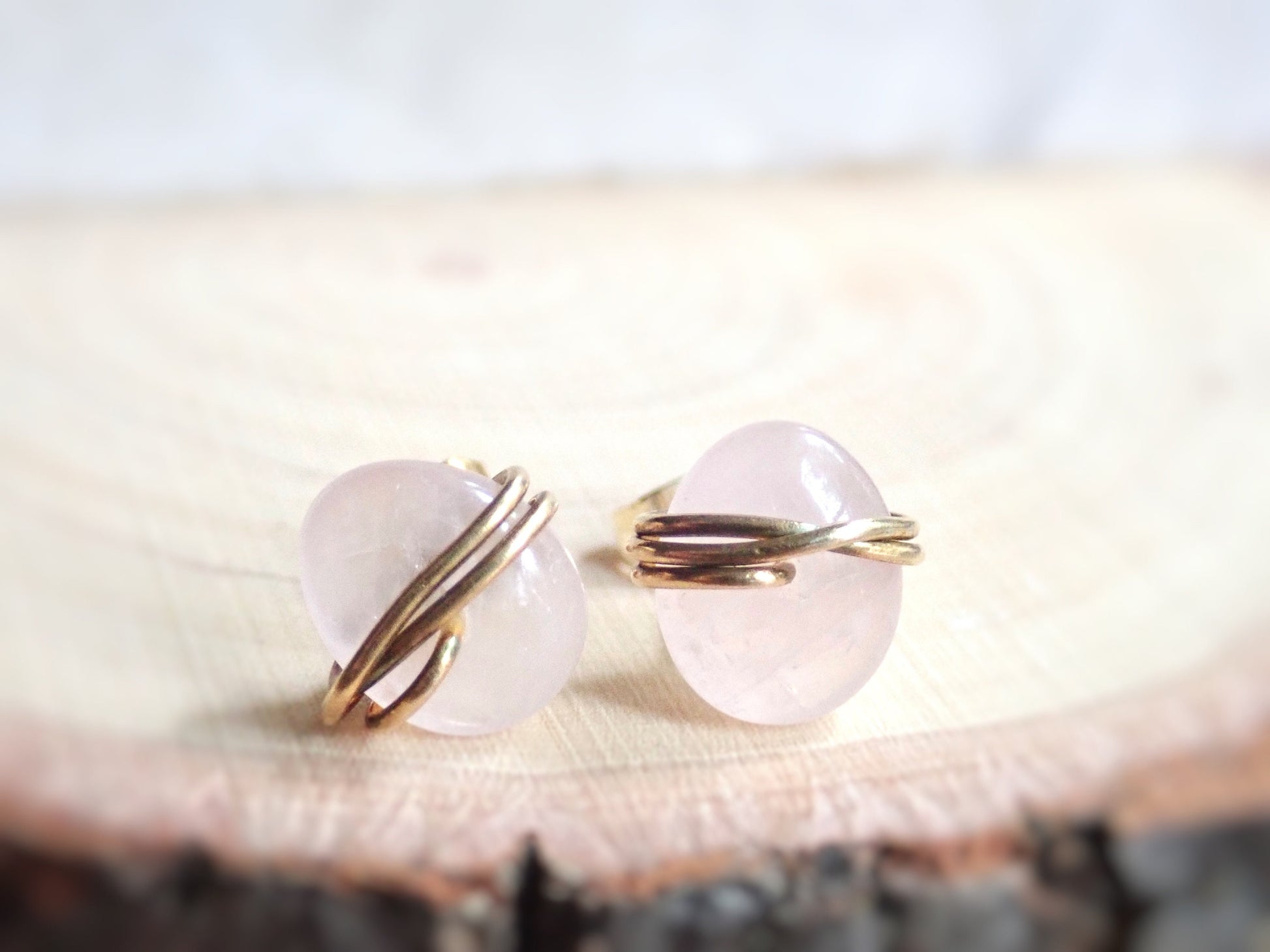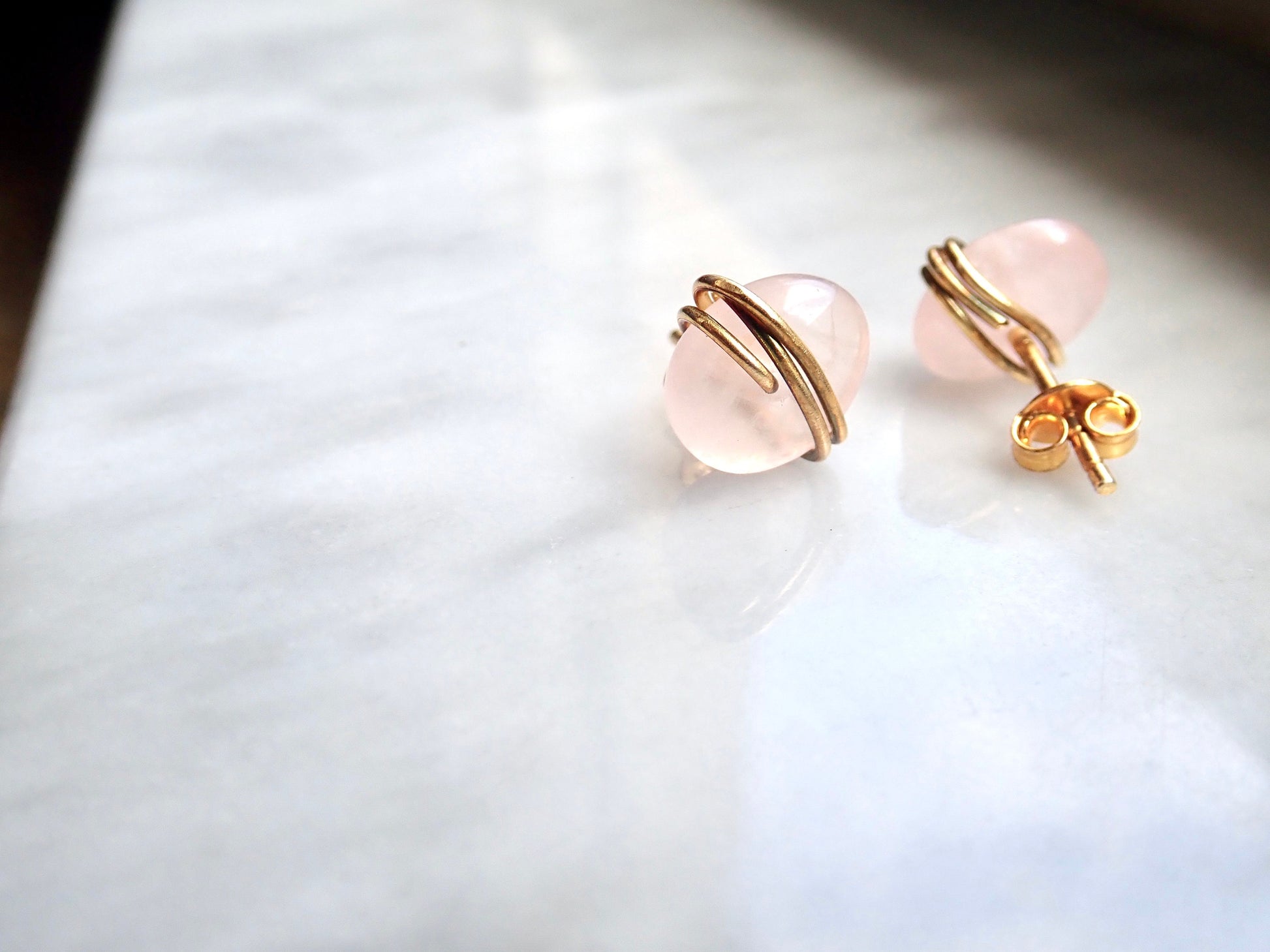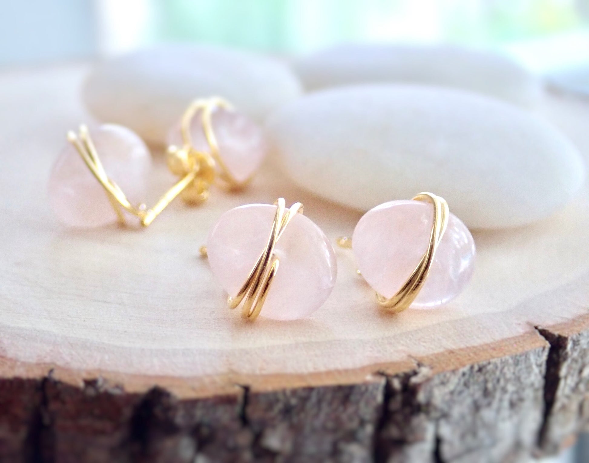 Smooth and polished rose quartz is hand wire-wrapped in these dainty and minimalist stud earrings. Wire and posts are genuine 14k gold over sterling silver so these are hypo-allergenic and safe for sensitive ears.