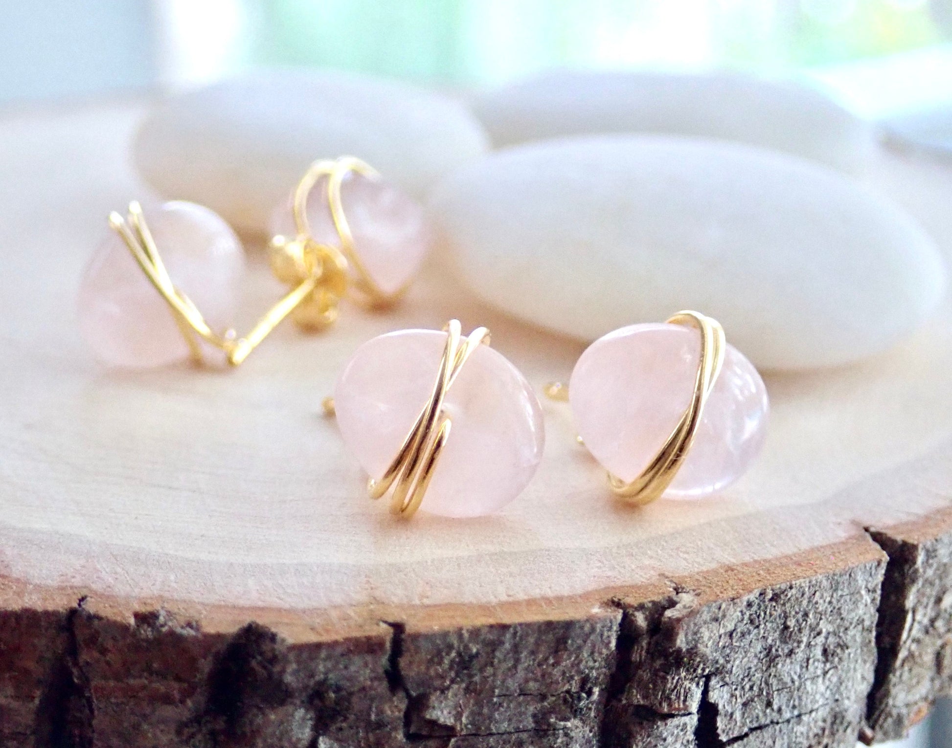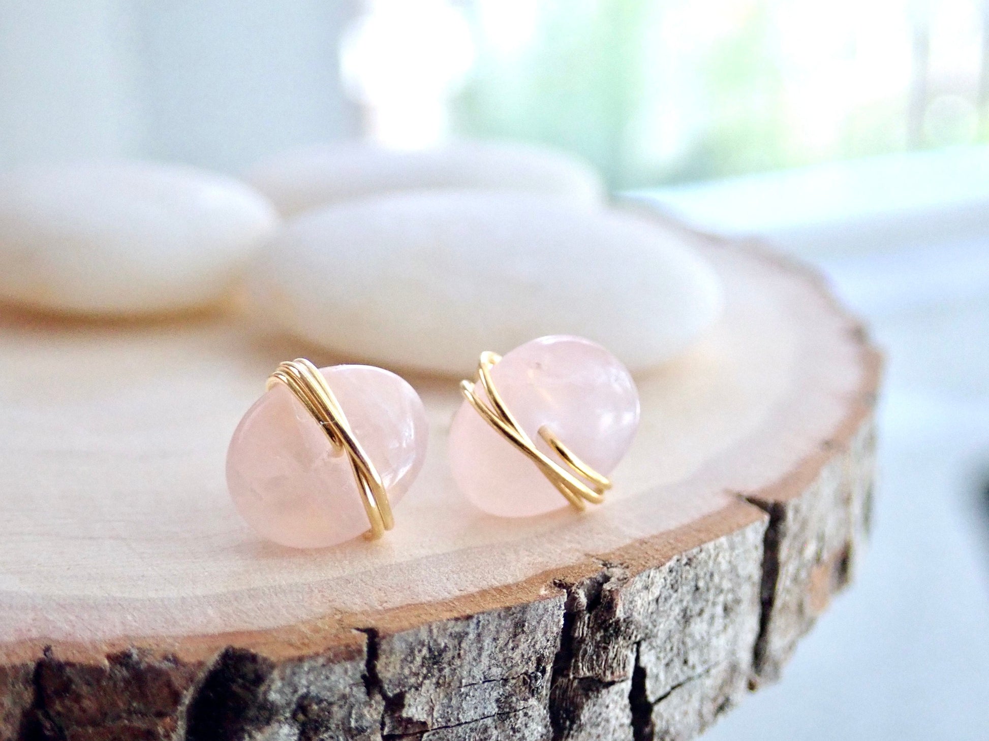 Rose Quartz Stud Earrings | Wire Wrapped Gemstone Earrings, Pink Crystal Post Earrings, Rose Quartz Jewelry, January Birthstone Gift for Her