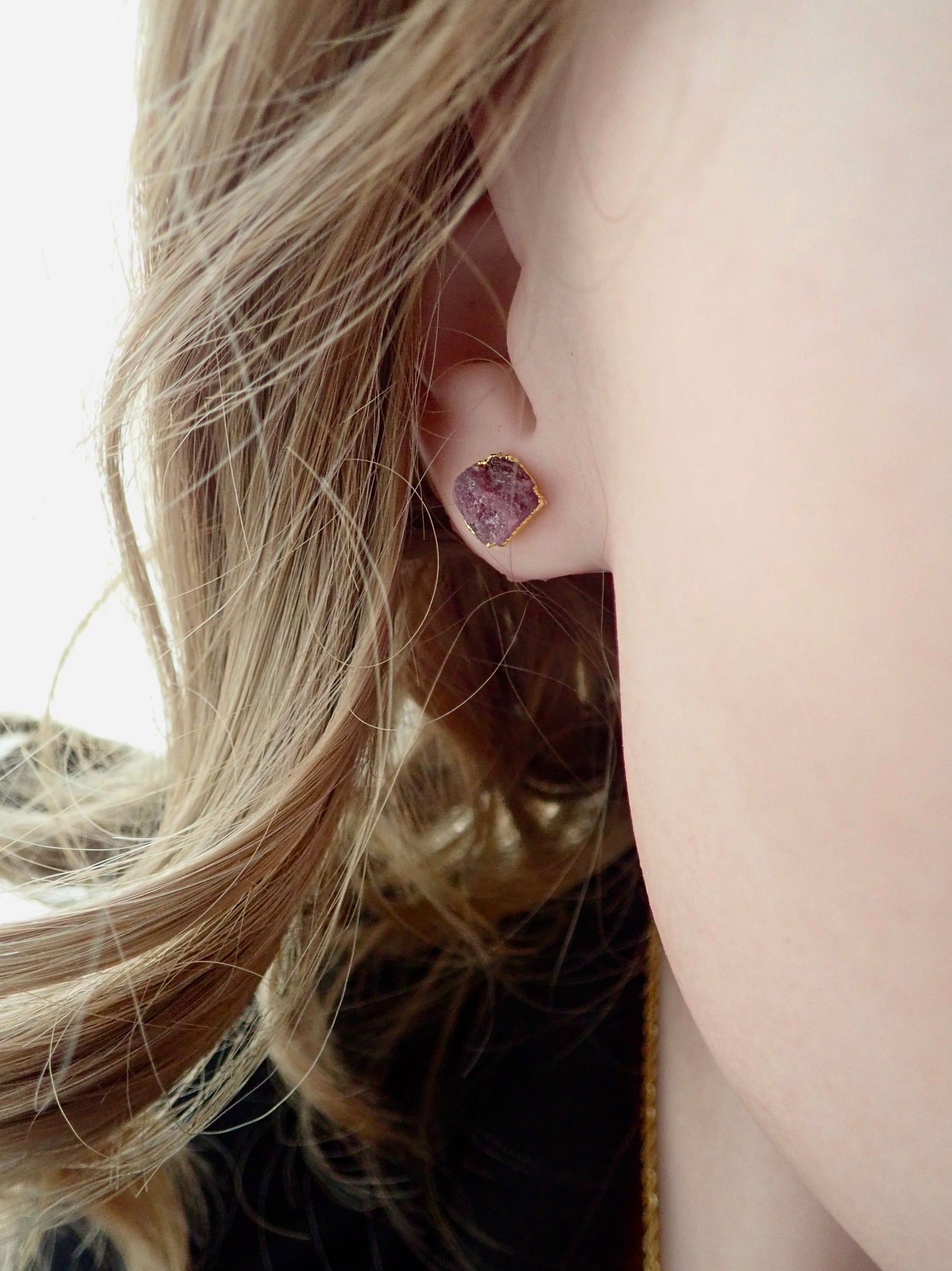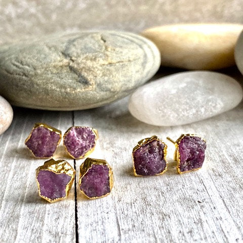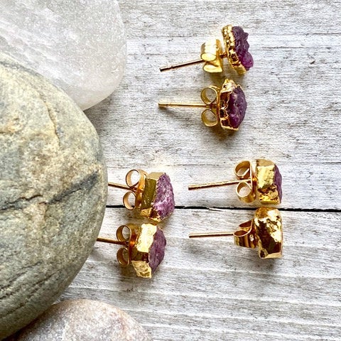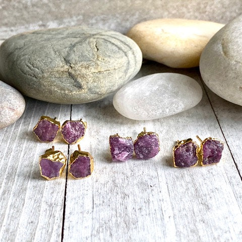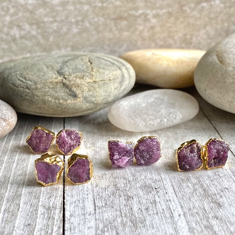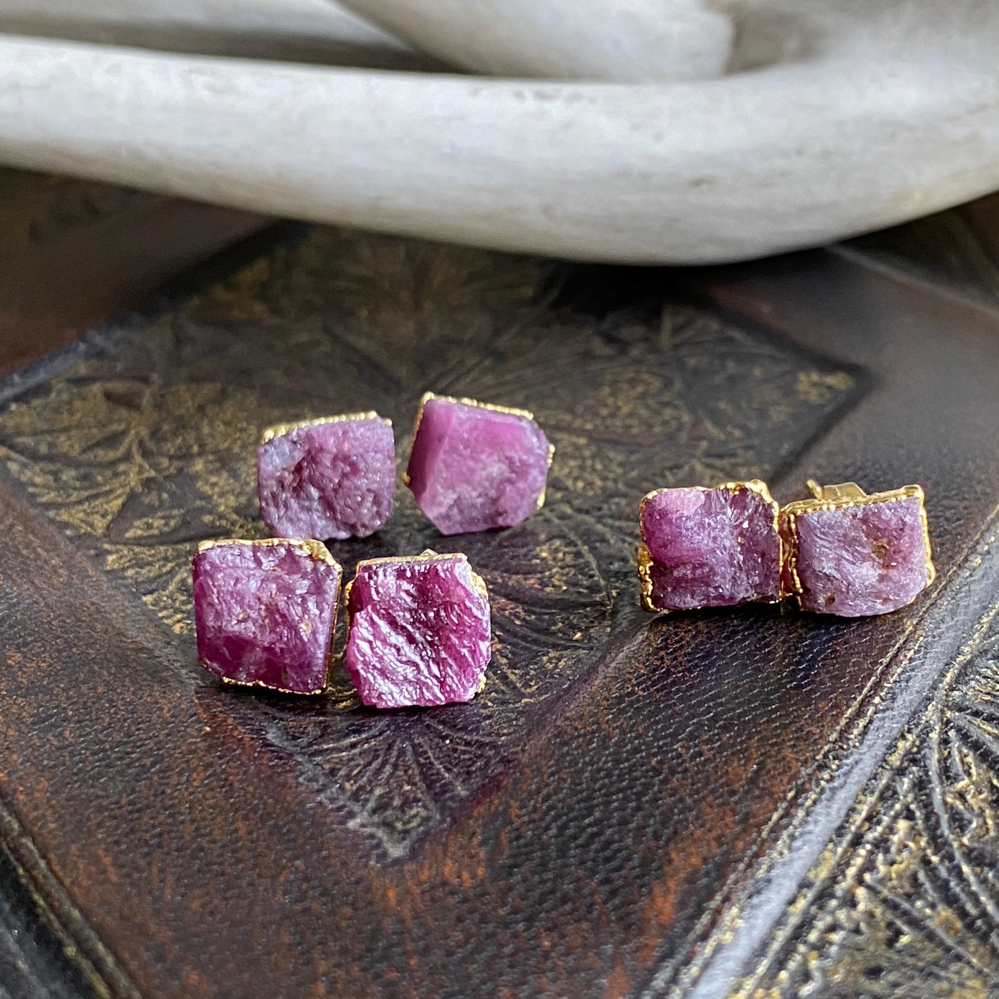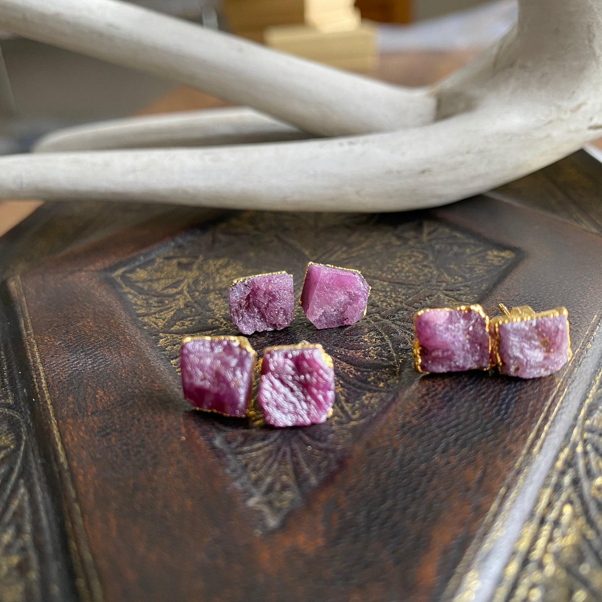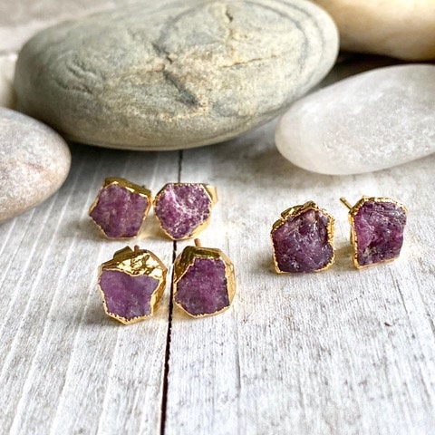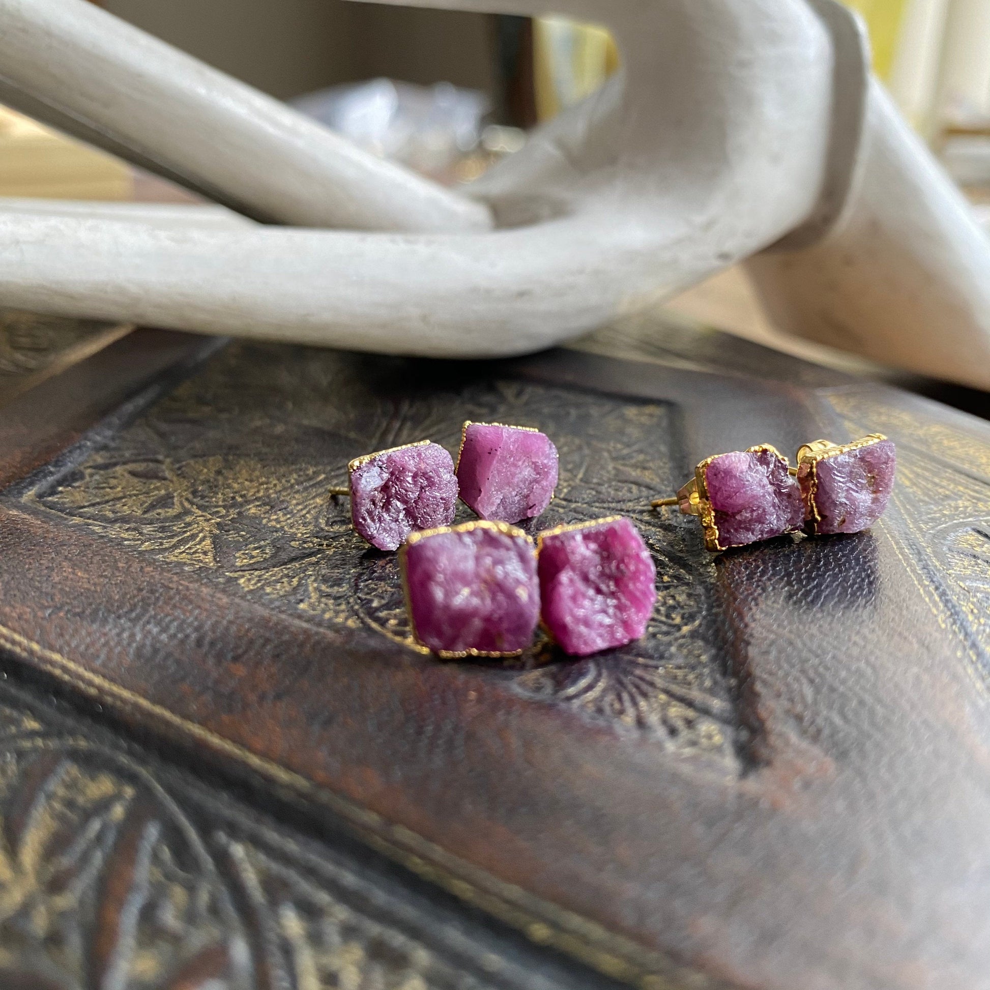 Gorgeous raw ruby stud earrings electroplated in 14k gold. Current stones are similar to first three photos.