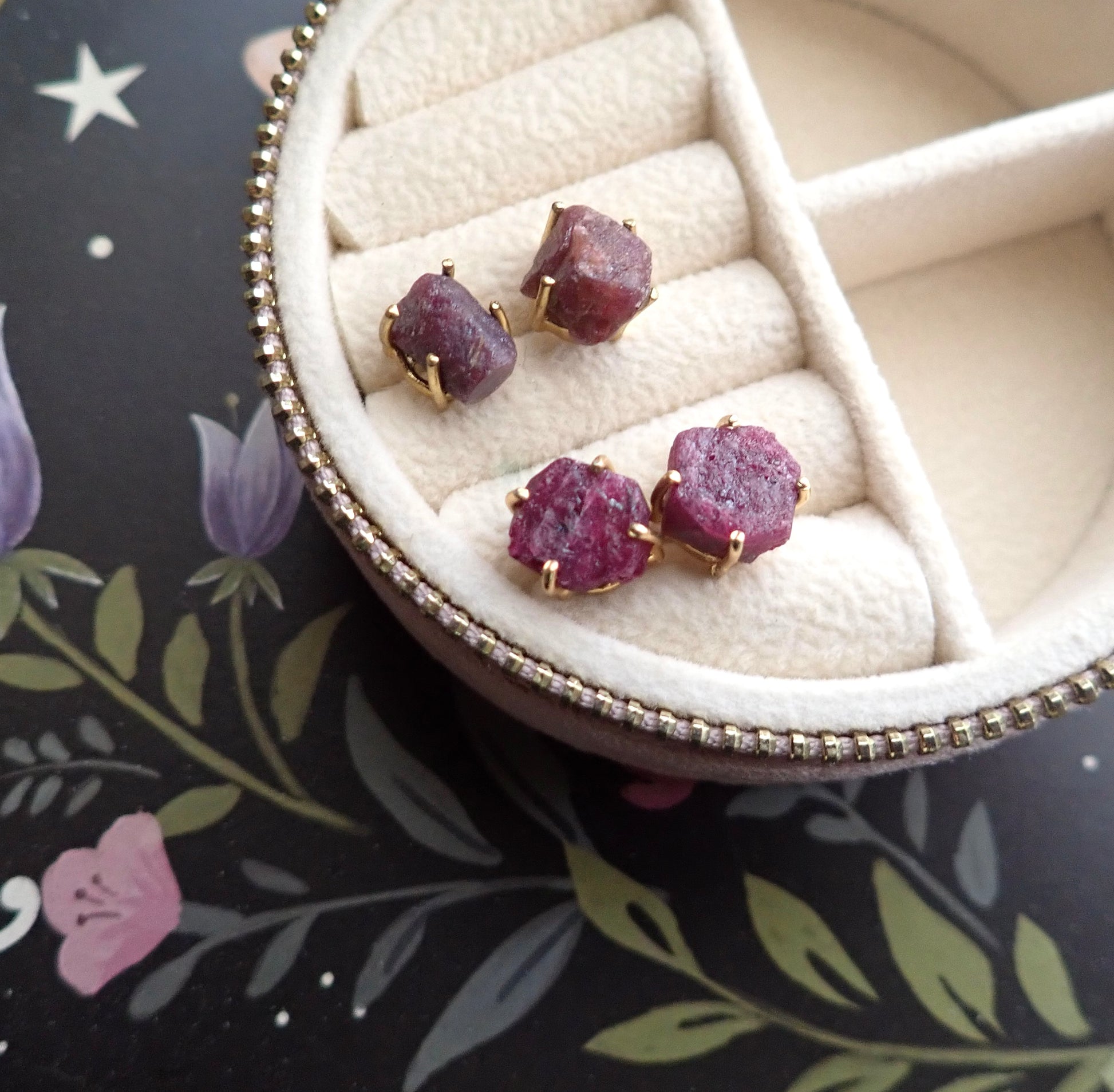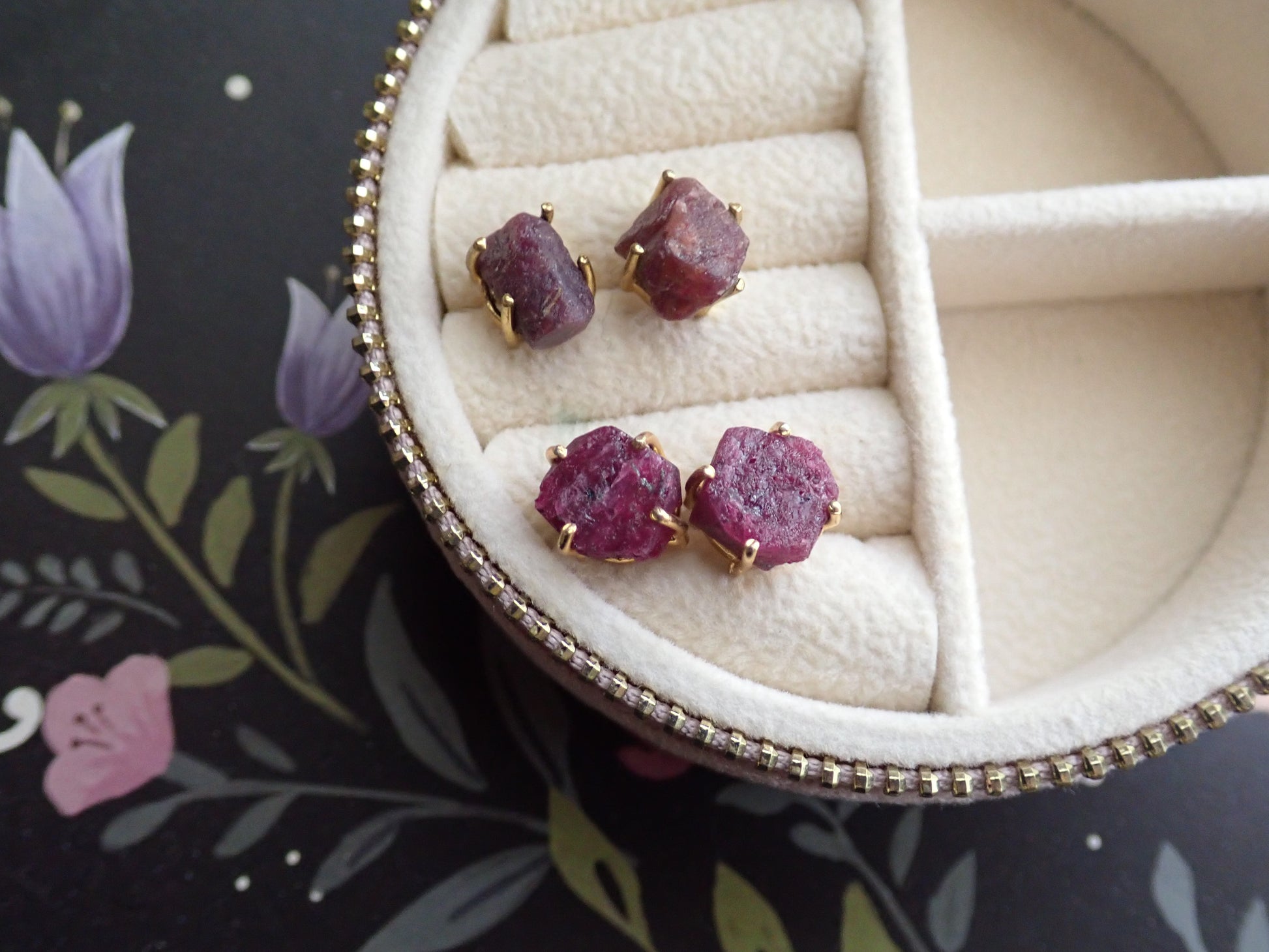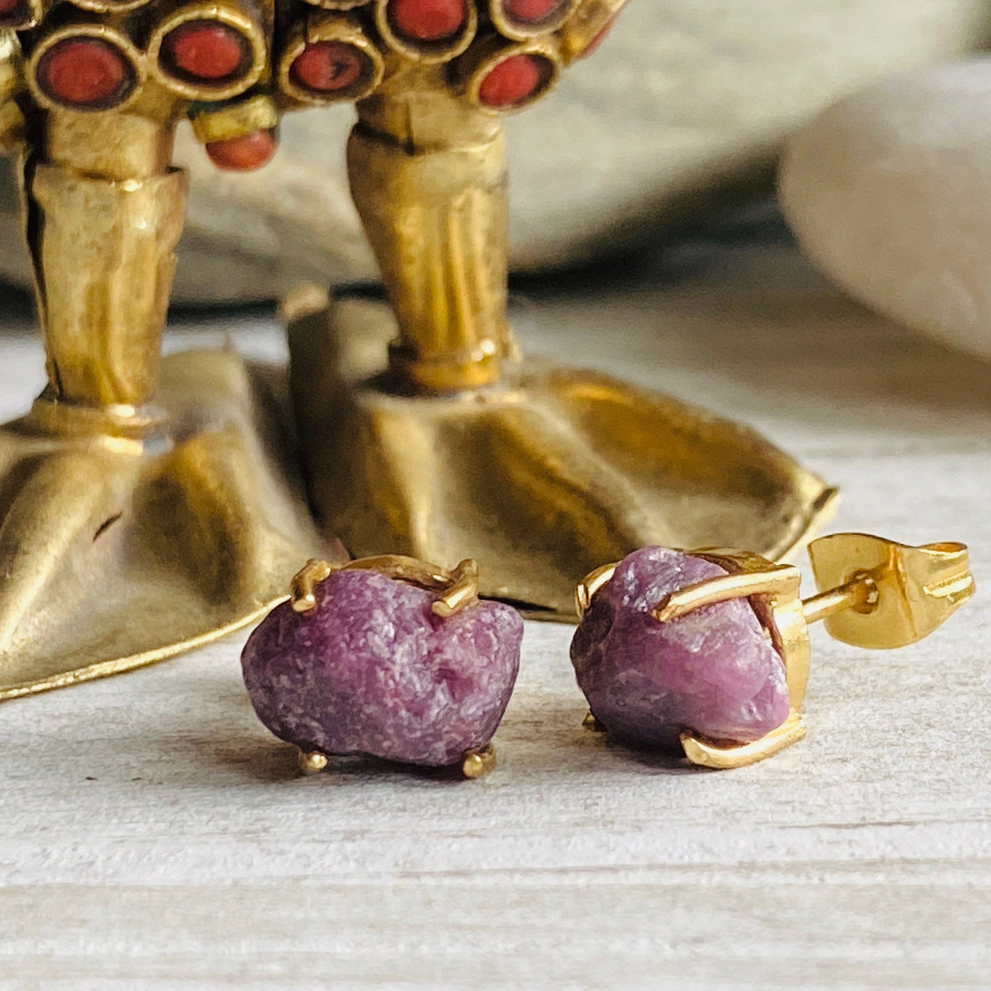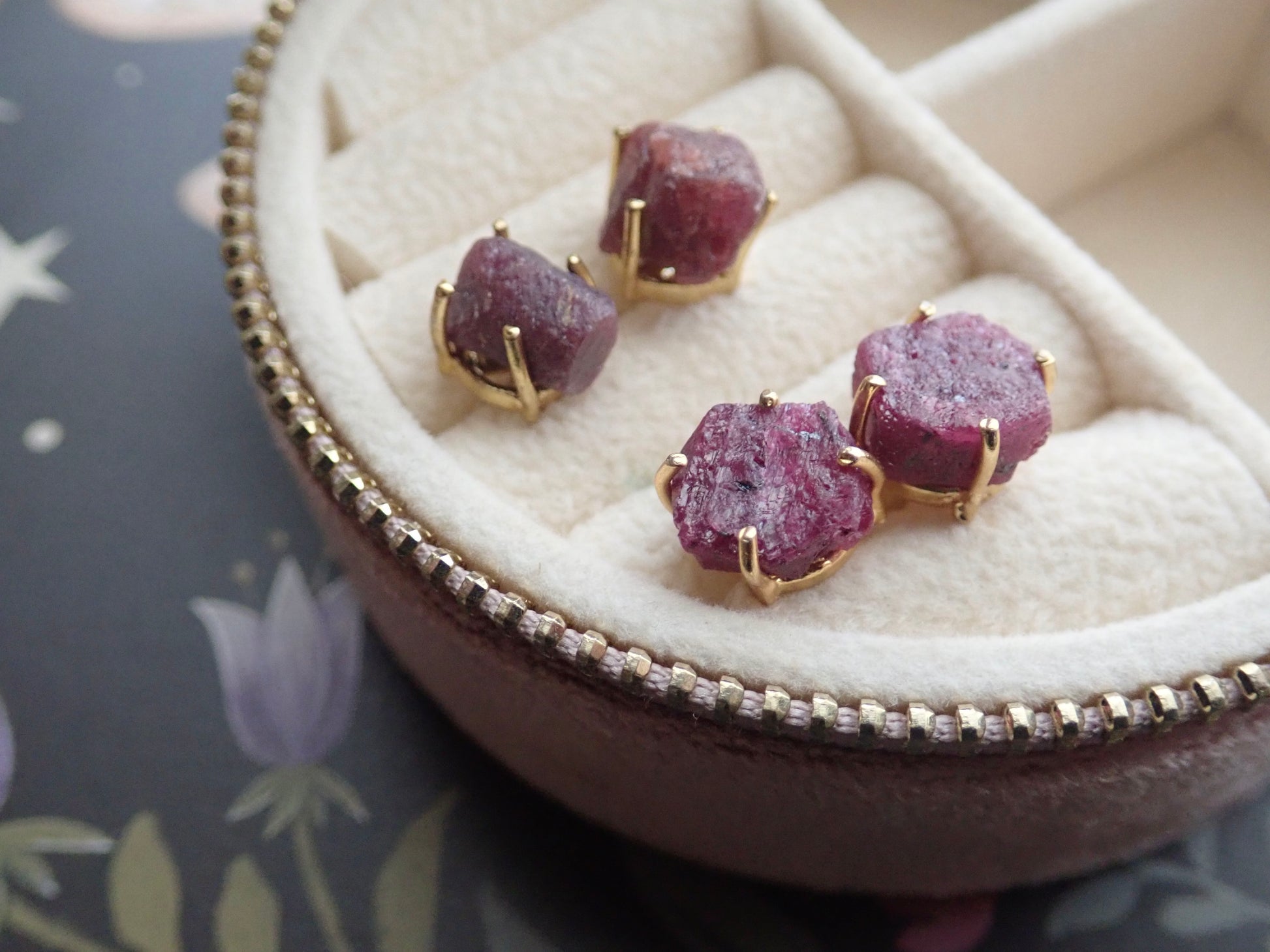 Gorgeous raw ruby stud earrings prong-set in 14k gold plated settings.