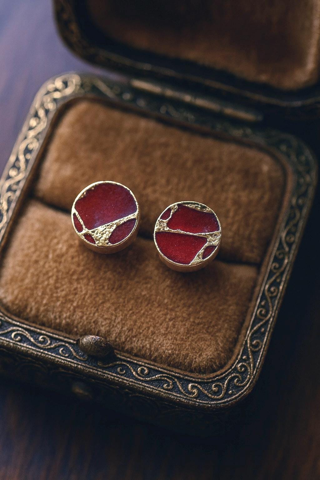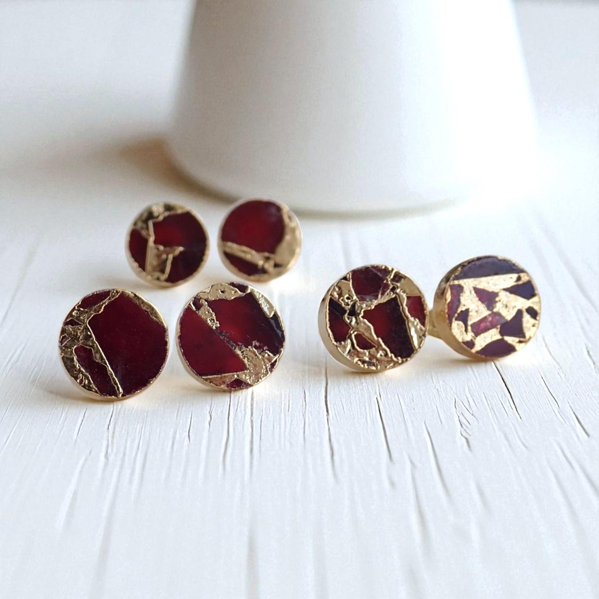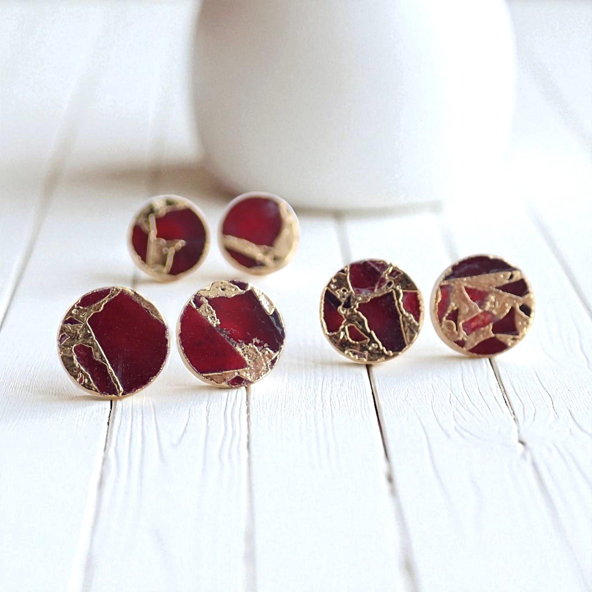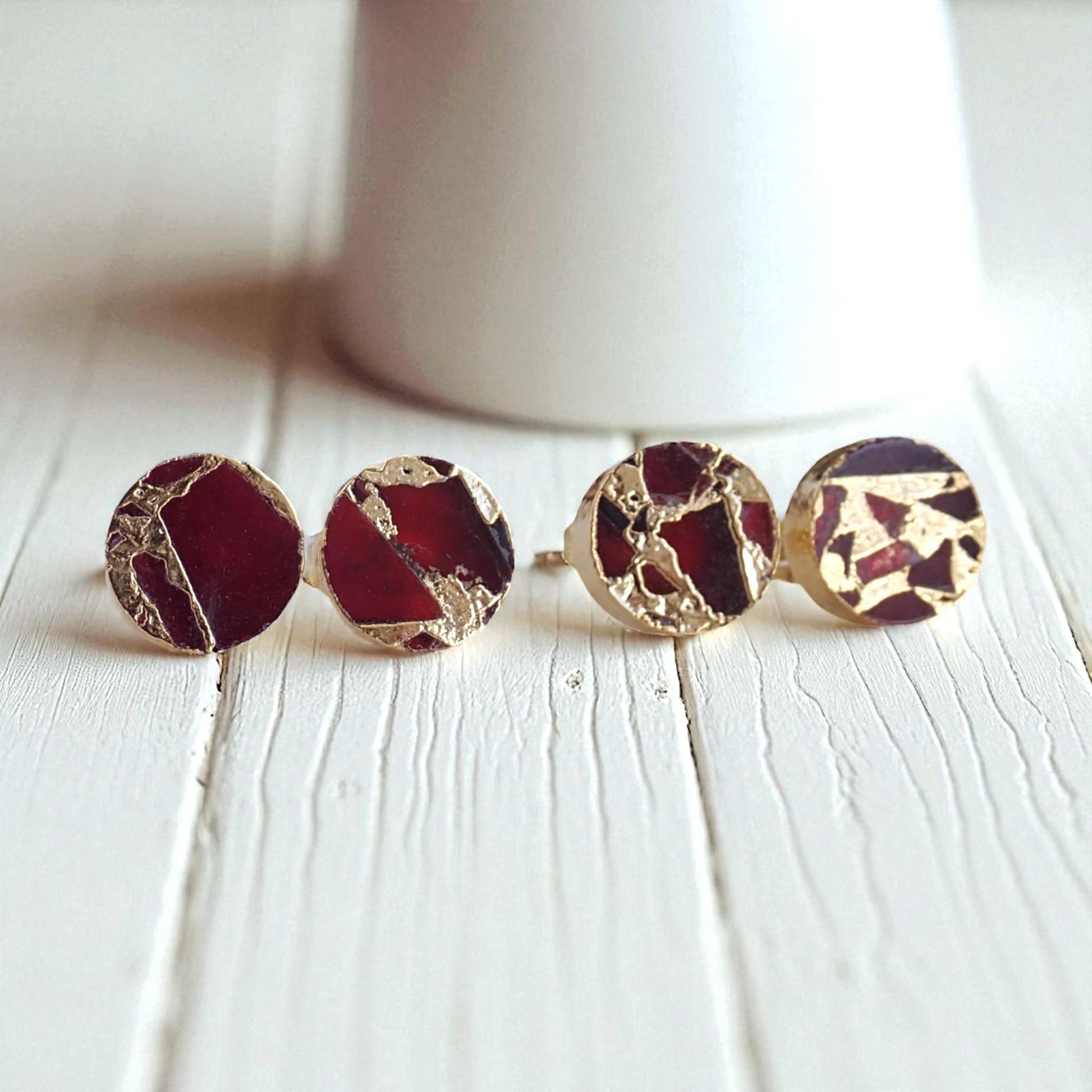 These striking ruby red-toned stud earrings are a bold blend of boho charm and minimalist elegance. Each round stud features a rich matrix or semi-translucent dyed jade and crushed ruby—reminiscent of Mojave turquoise—accented with glimmering 14k gold electroplated veining inspired by the ancient Japanese art of Kintsugi.