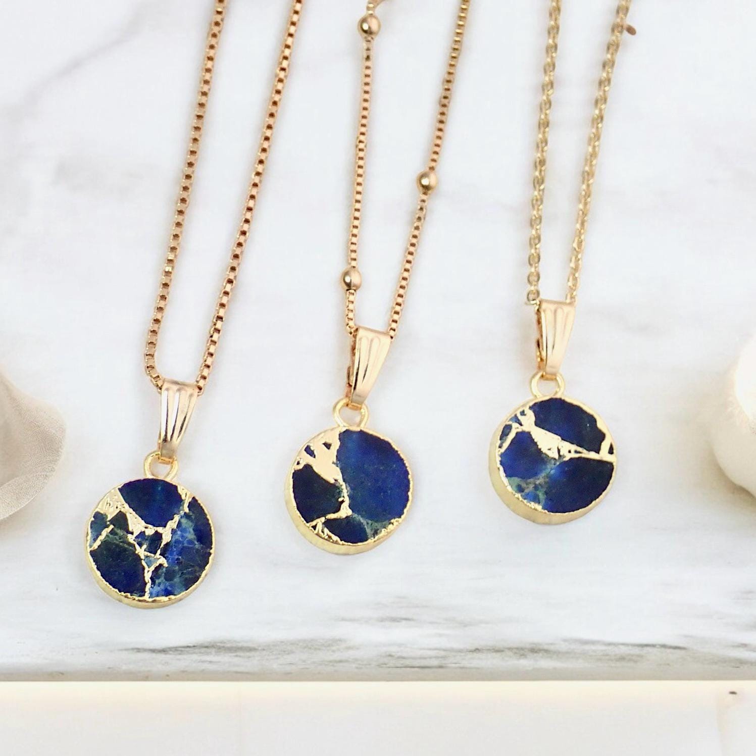 Vibrant blue and metallic veining combine beautifully in these compressed sapphire pendant necklaces. The sapphire and dyed jade are compressed into one larger conglomerate held together with delightful gold veining throughout. The circular coin pendants are edged in either silver or 14k gold and hang from high quality silver fill cable or wheat chain or 18k gold filled chain in your choice of cable chain, box chain, or satellite chain.