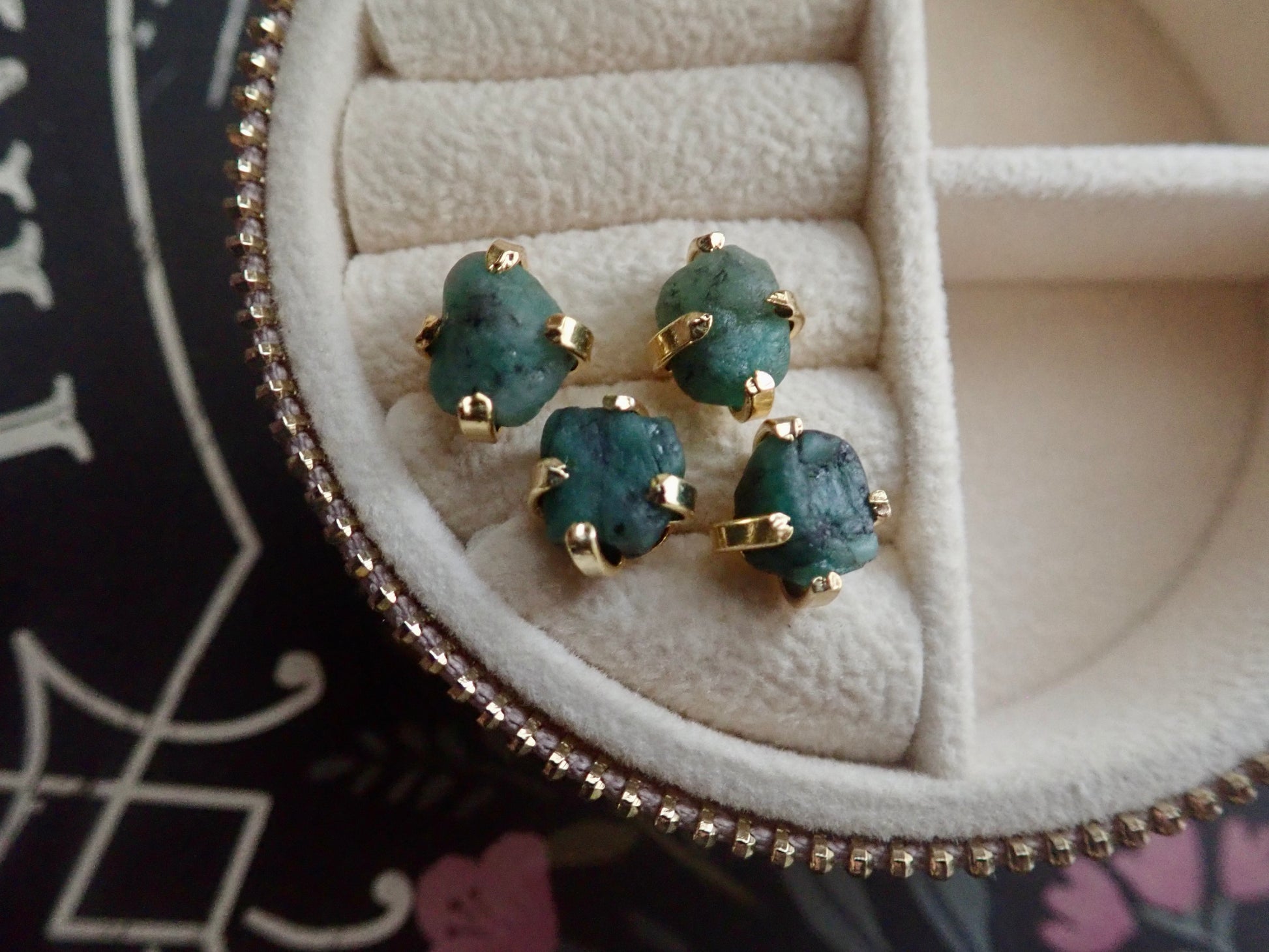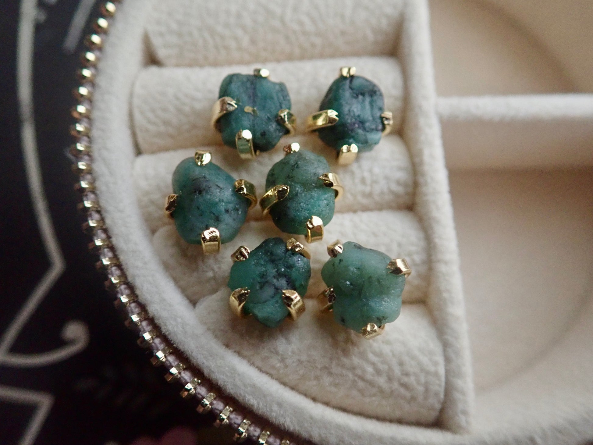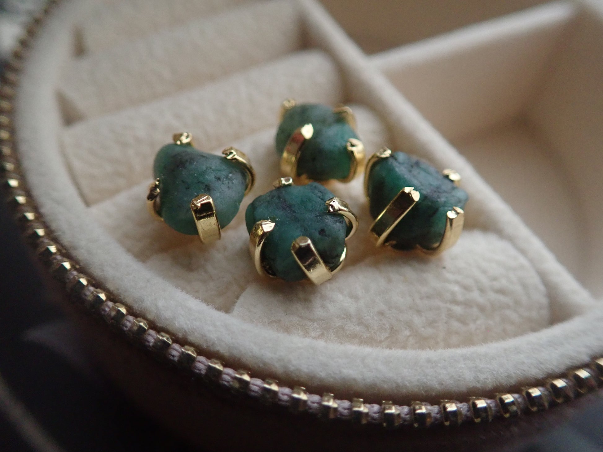 Gorgeous raw emerald stud earrings prong-set in 14k gold over brass.