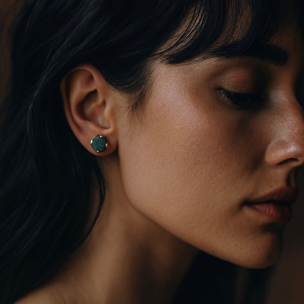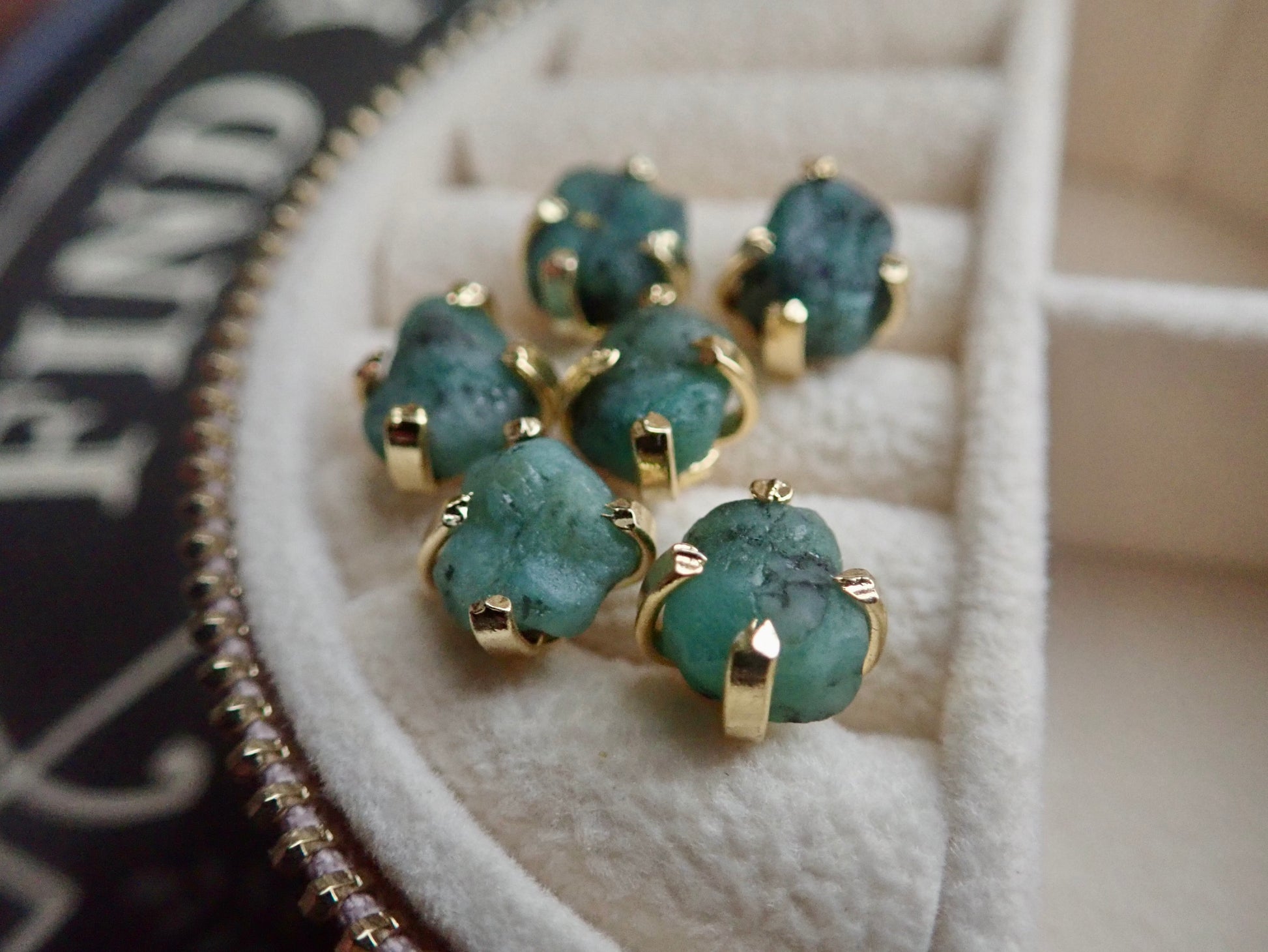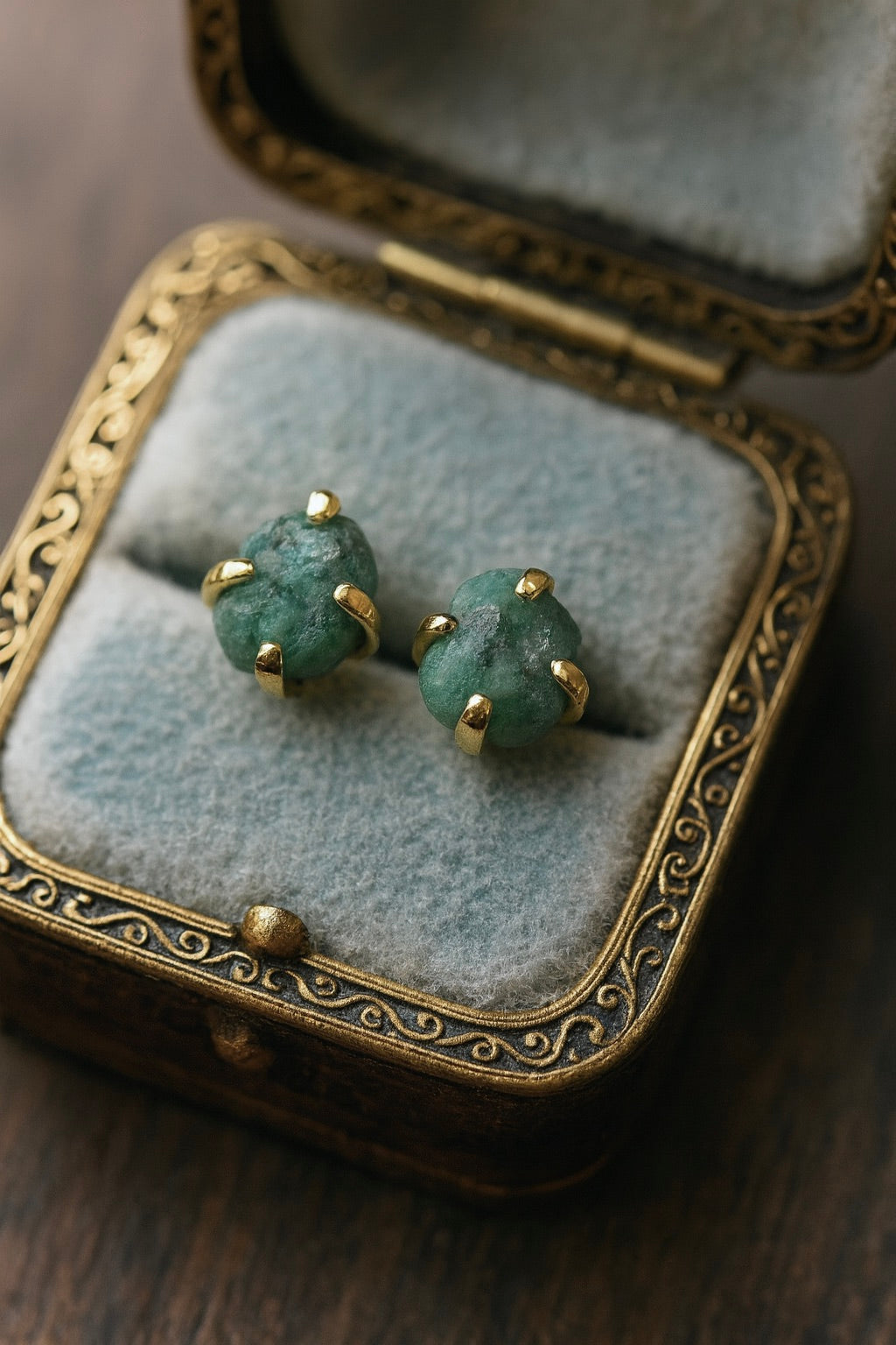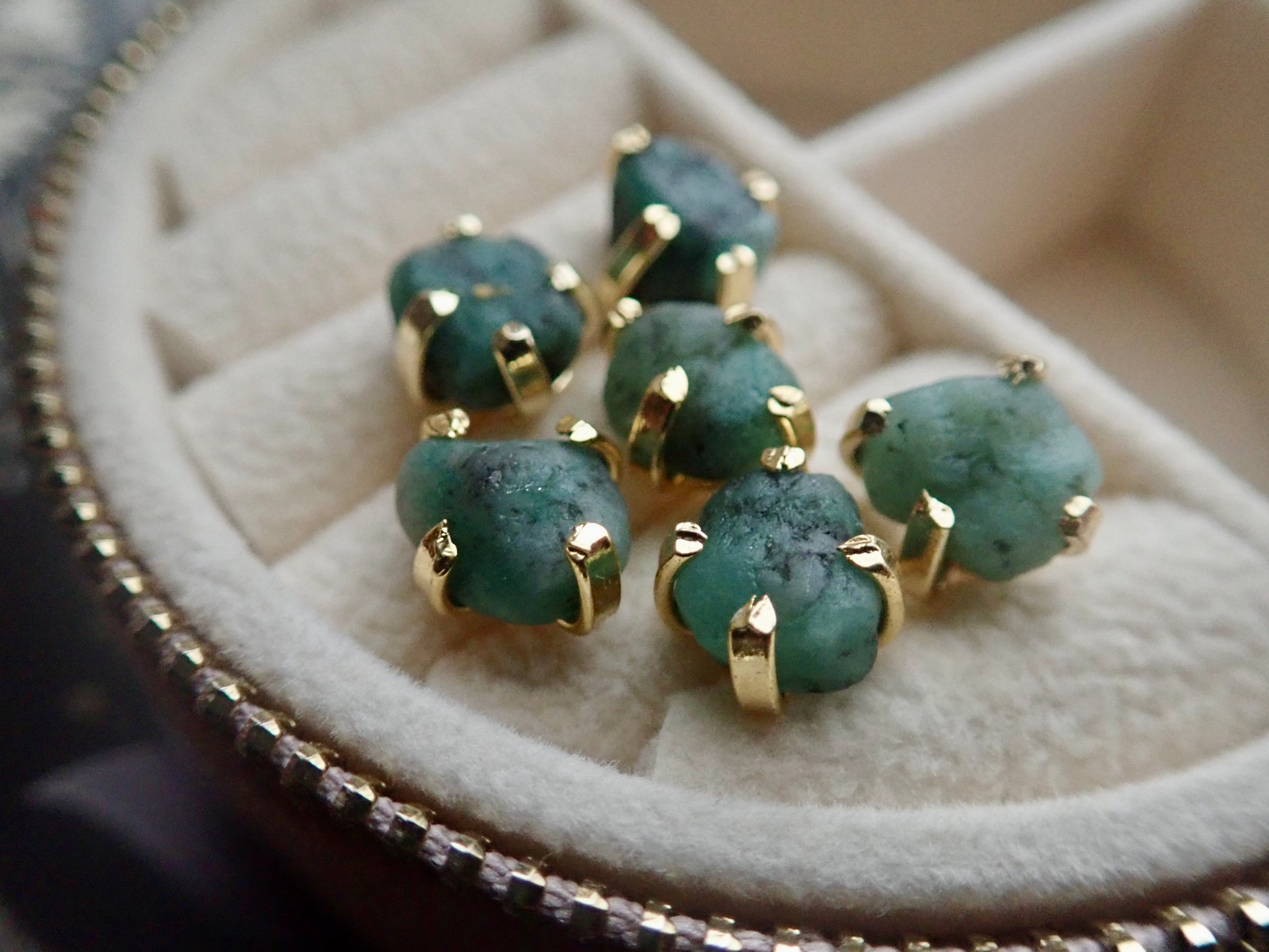 Gorgeous raw emerald stud earrings prong-set in 14k gold over brass.