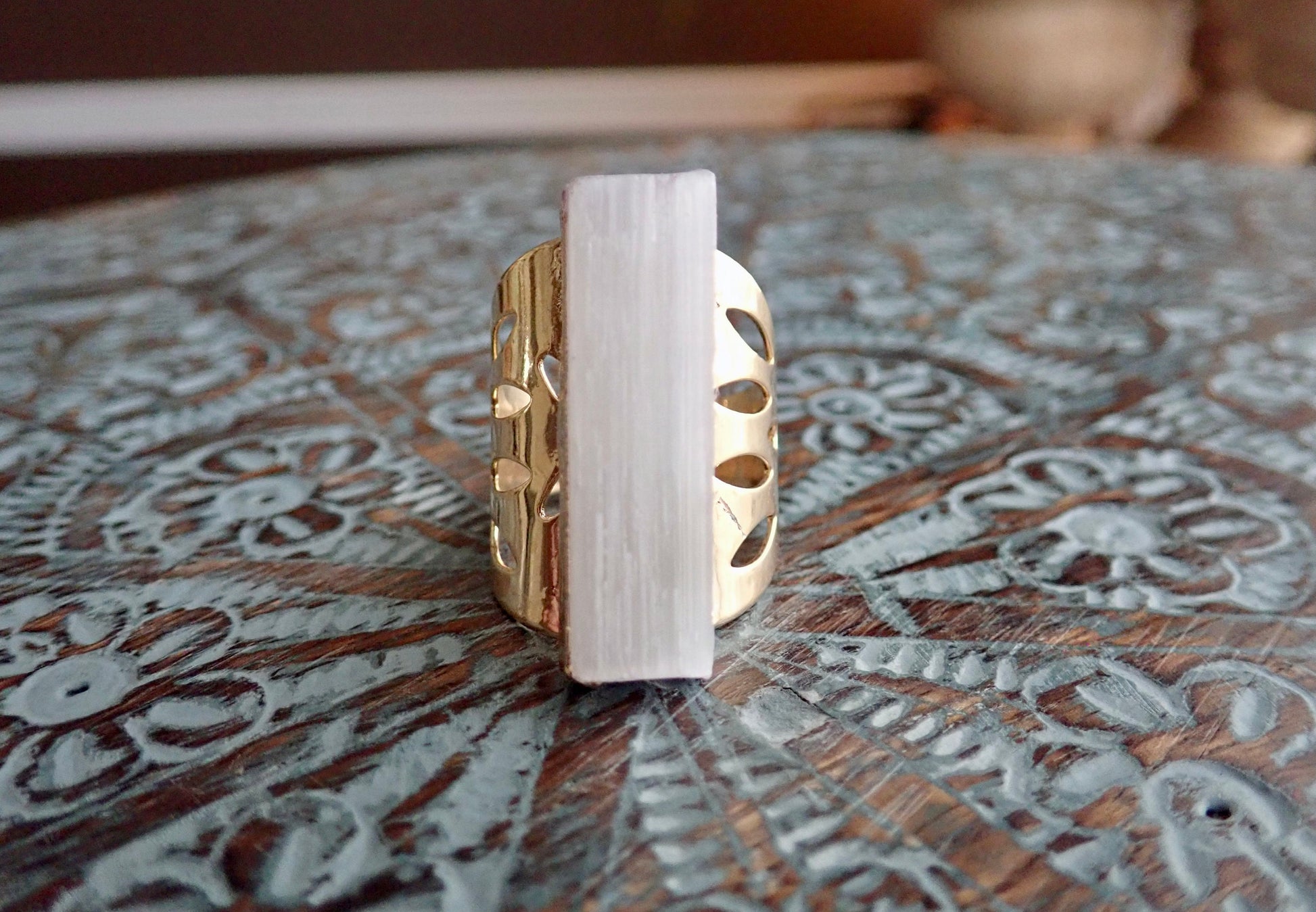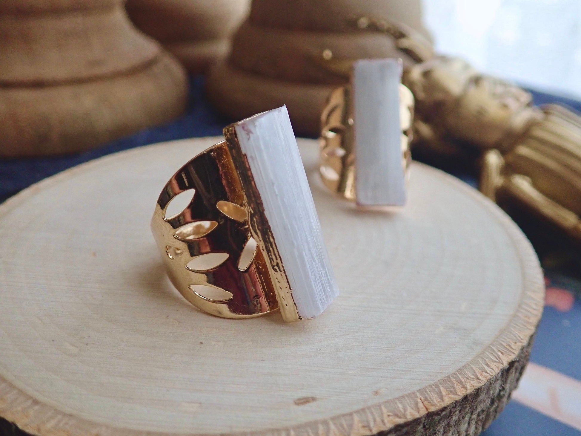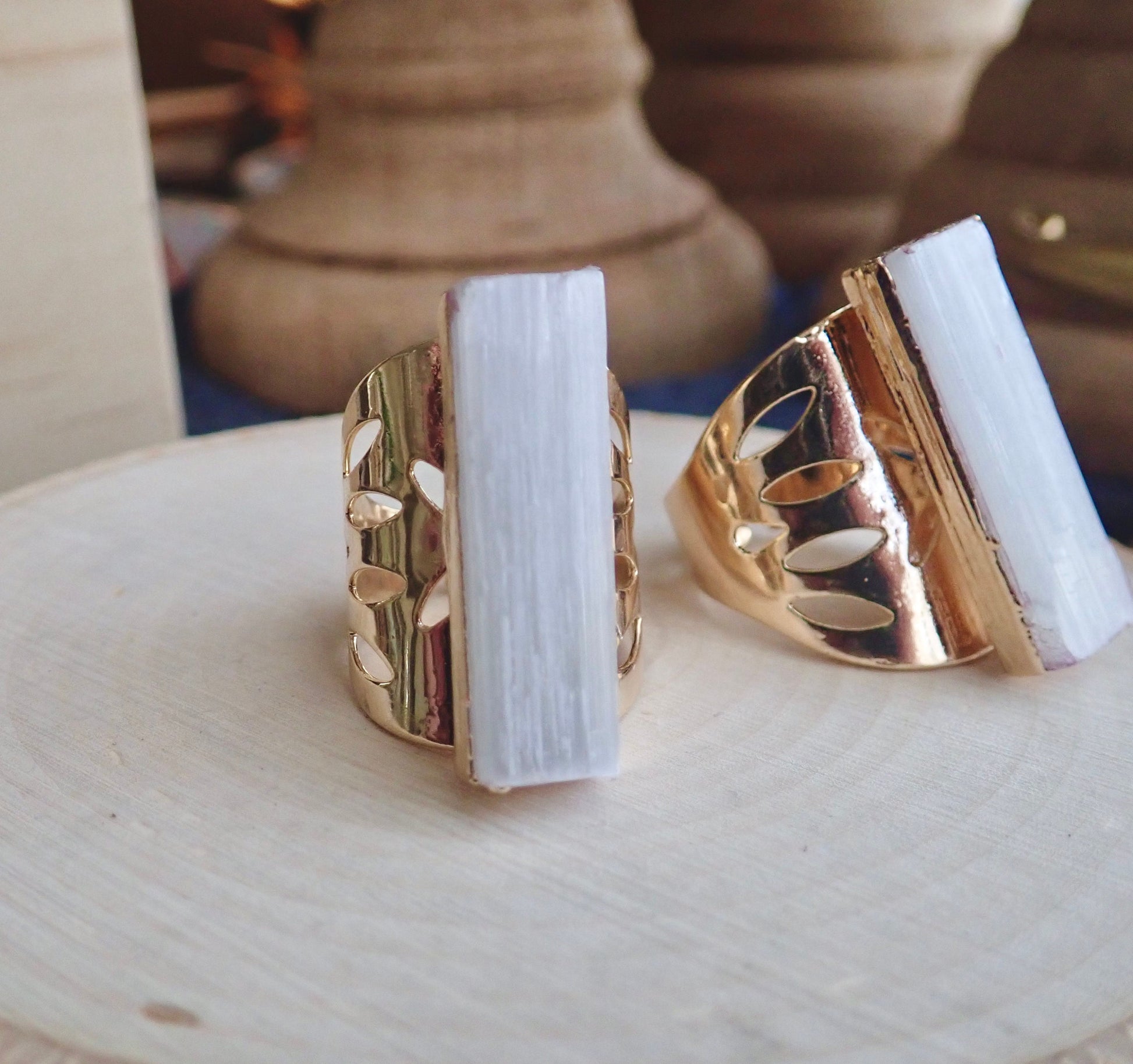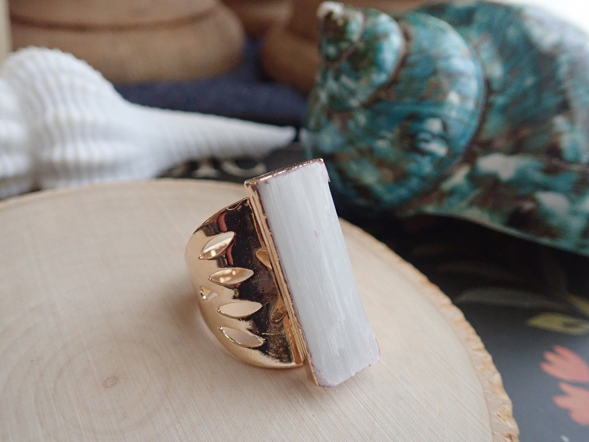 An easy breezy size ring set with gorgeous and healing selenite. A bold statement ring in lustrous white and gold.