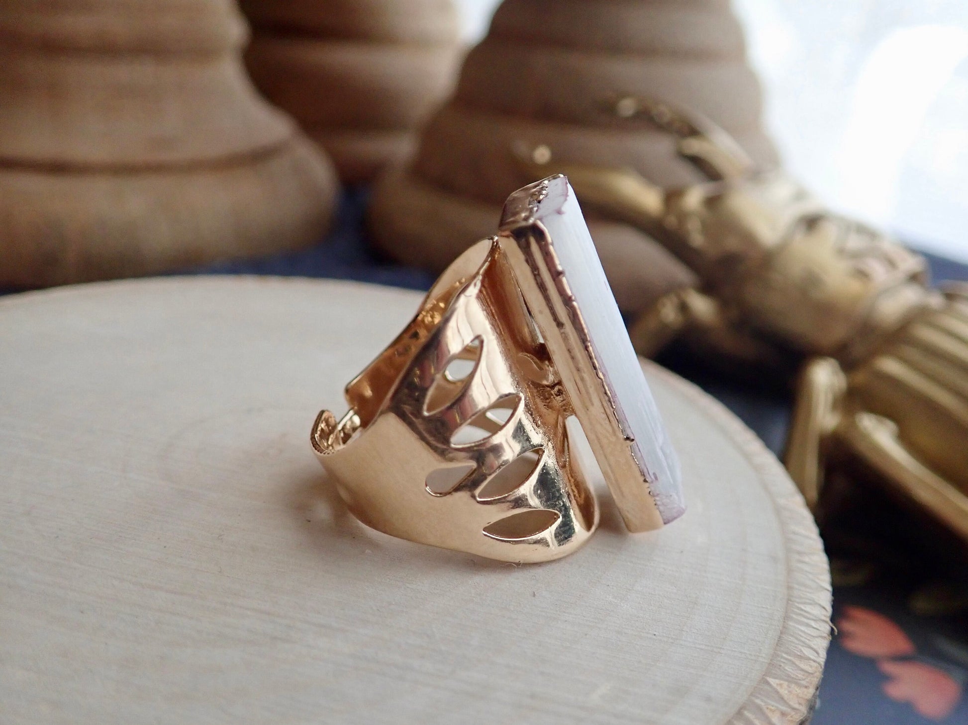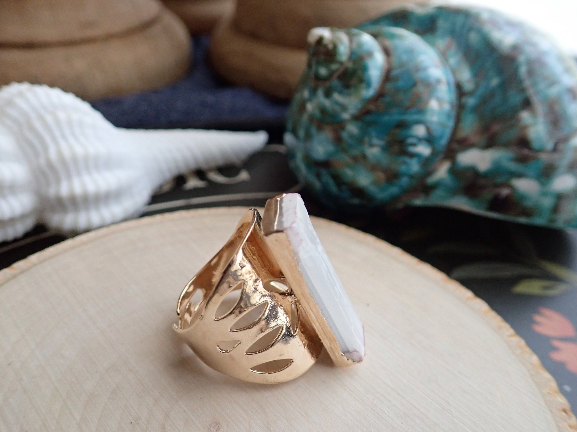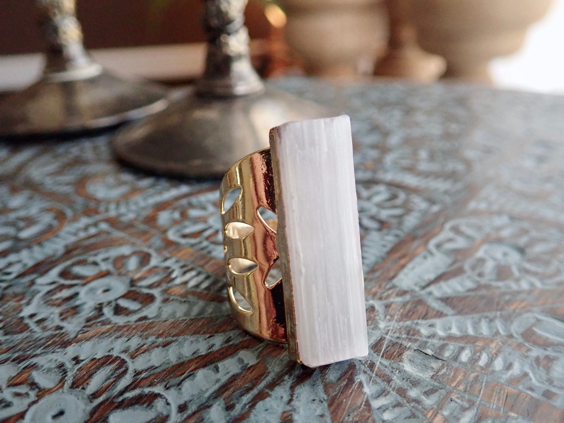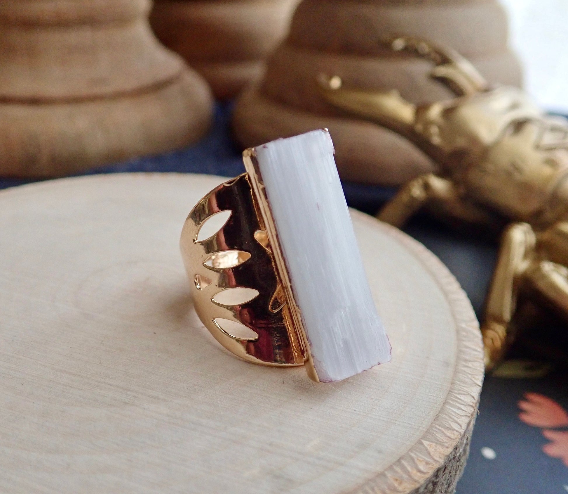 An easy breezy size ring set with gorgeous and healing selenite. A bold statement ring in lustrous white and gold.