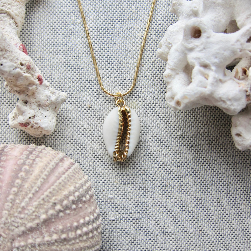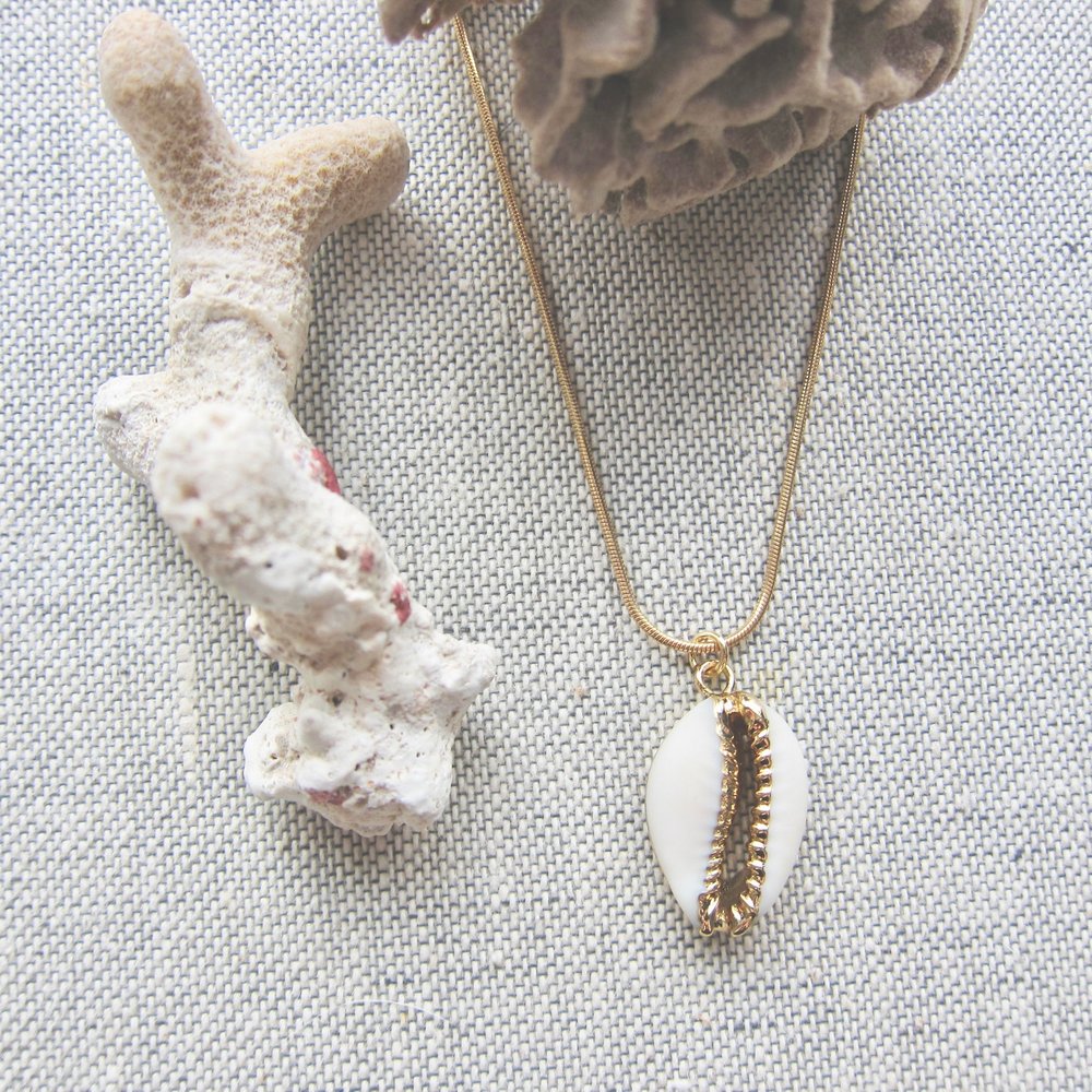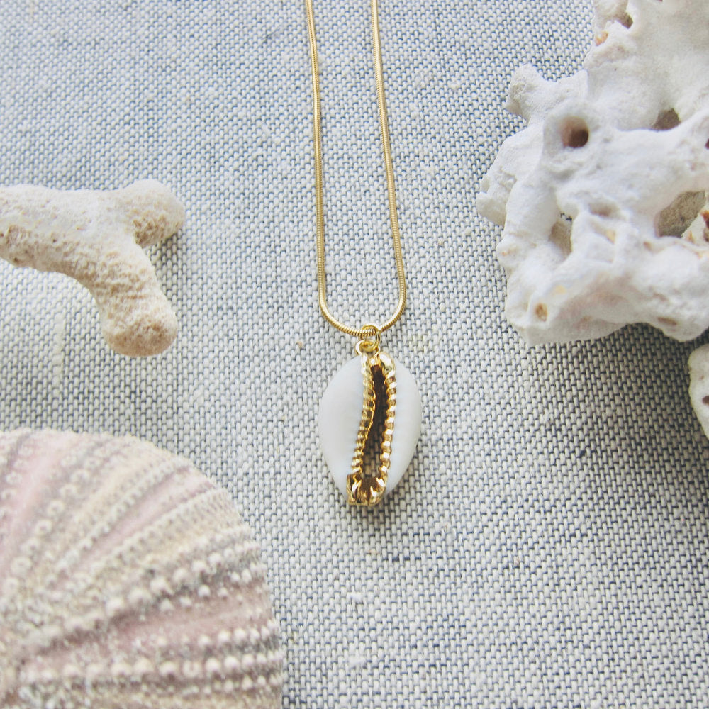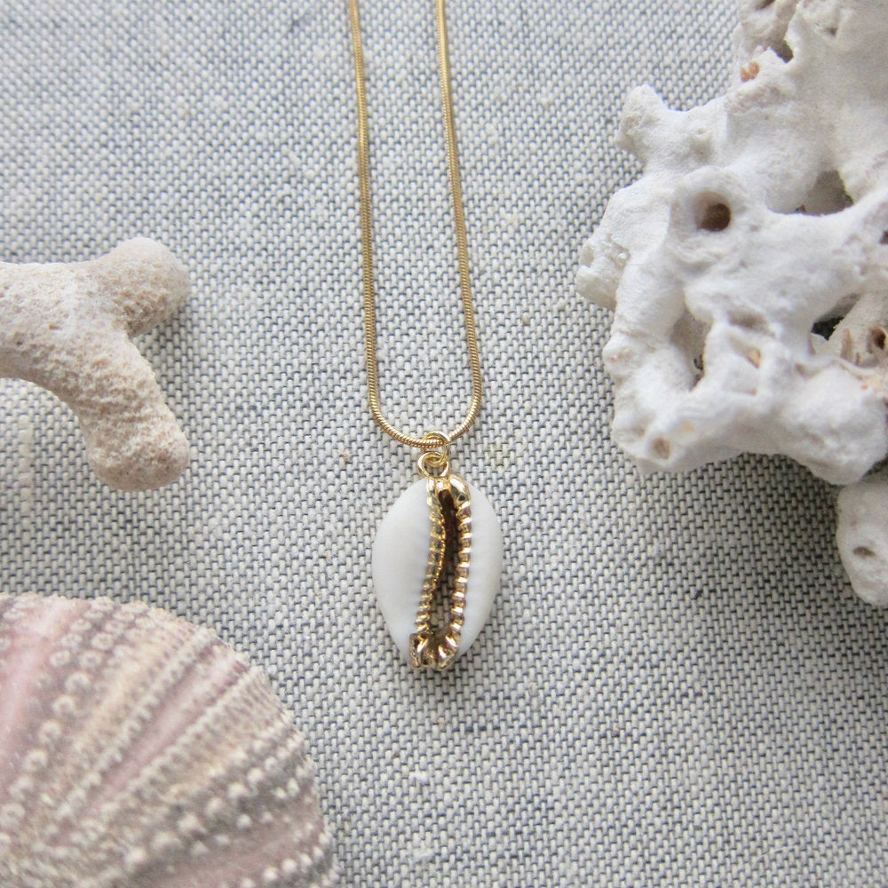 We love this fun and summery, beachy necklace. Answer the siren's song and get one for yourself or someone you love. Would make a great gift for the surfer or beach-lover in your life! A 14k gold electroplated cowrie shell dangles from a lustrous, high quality gold filled snake chain. The perfect summertime accessory!