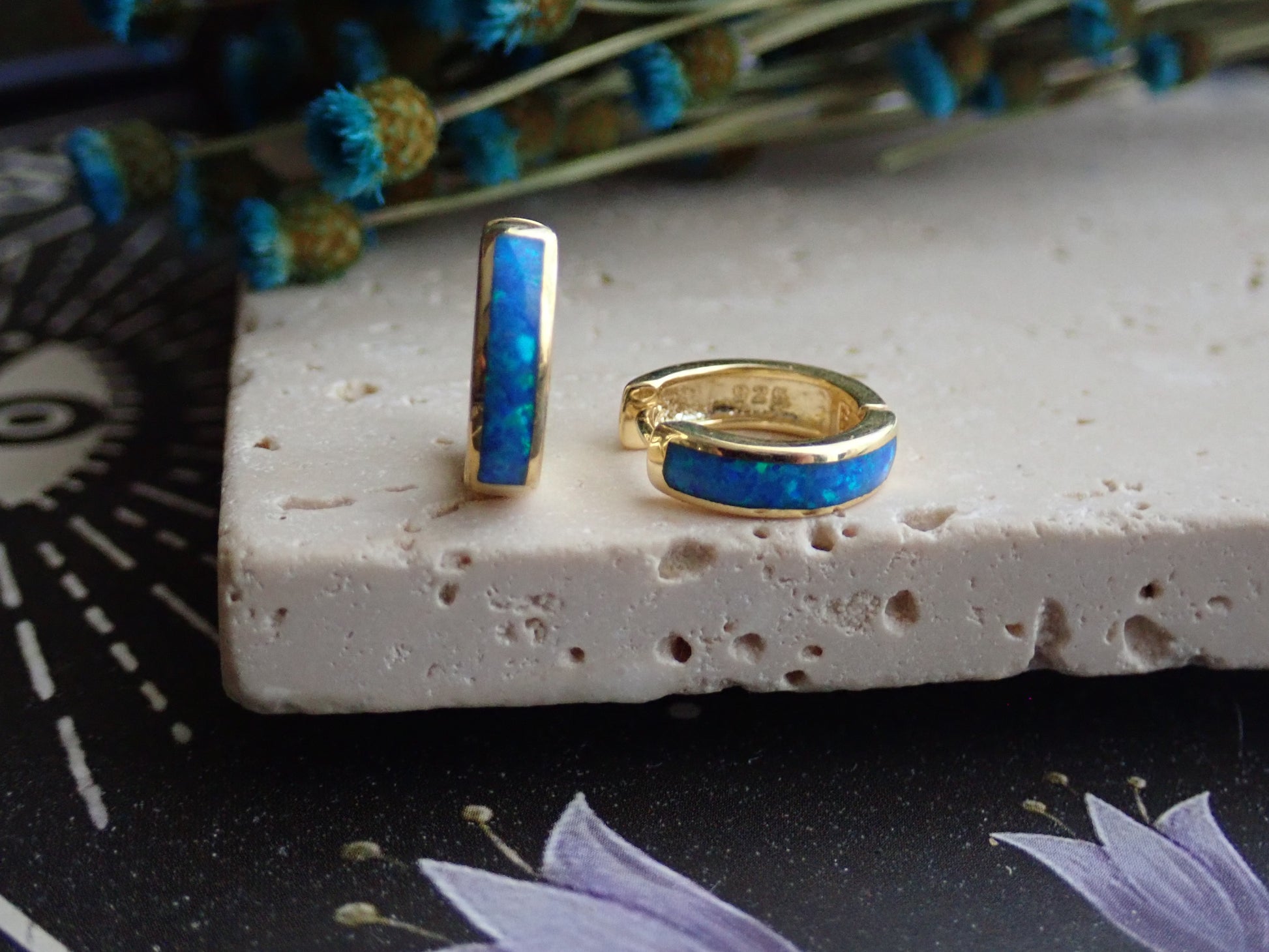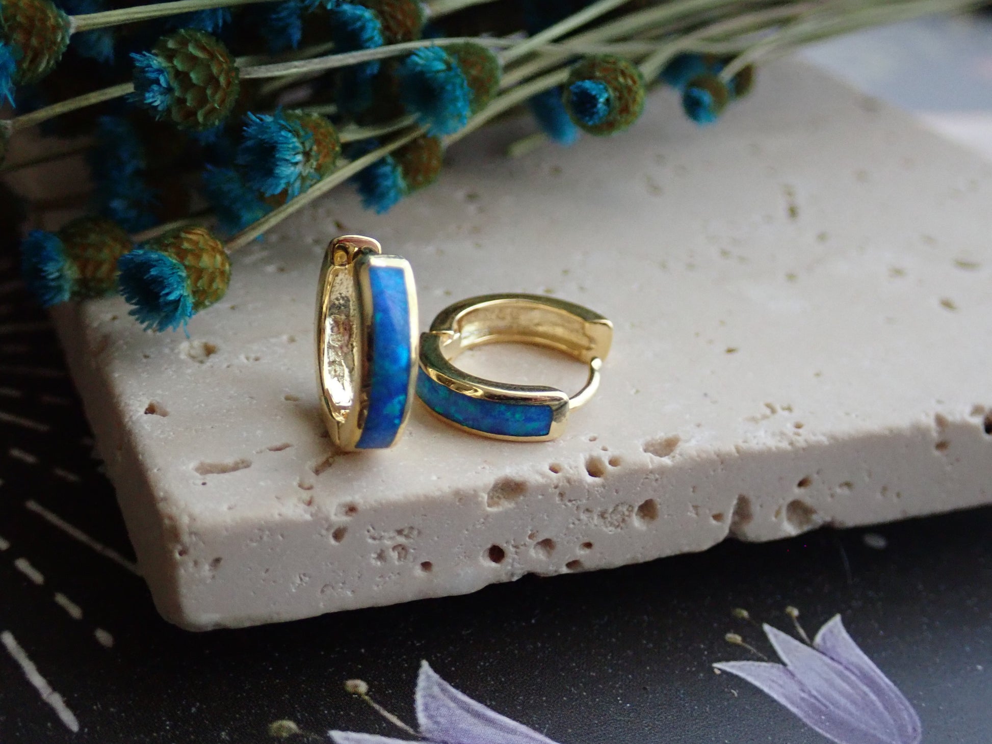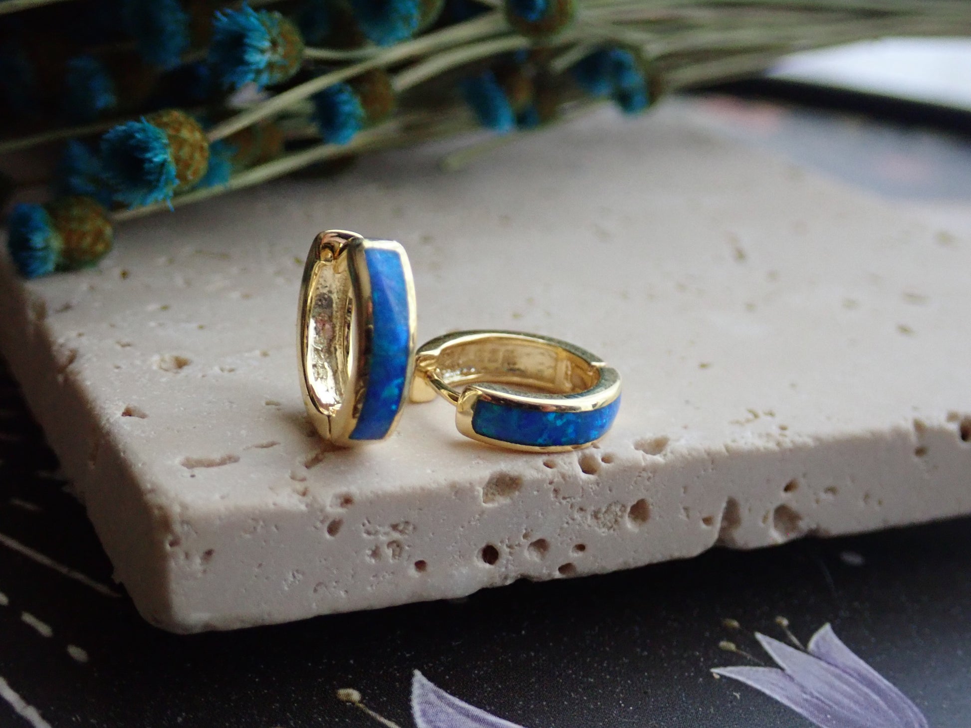 These comfortable, everyday little beauties will take you from day to night and look great dressed down but fit in to formal events with ease. Super fiery, ethically-sourced lab-created blue opals are inlaid into these darling little 14k gold plated hinge hoops. The opal inlay is on the front of the hoops only, the back is left 14k gold plated. Opal jewelry is so timeless and effortlessly chic.
