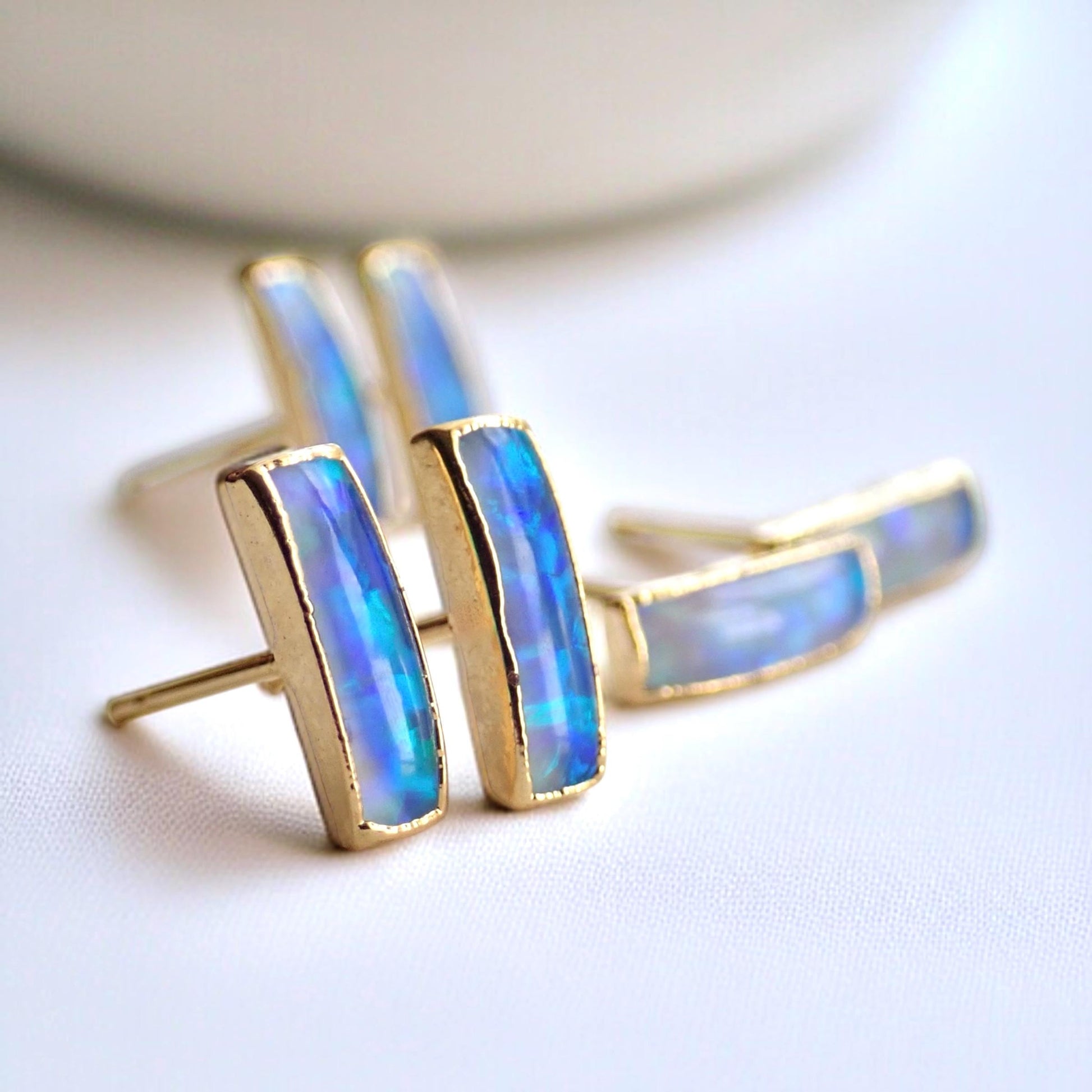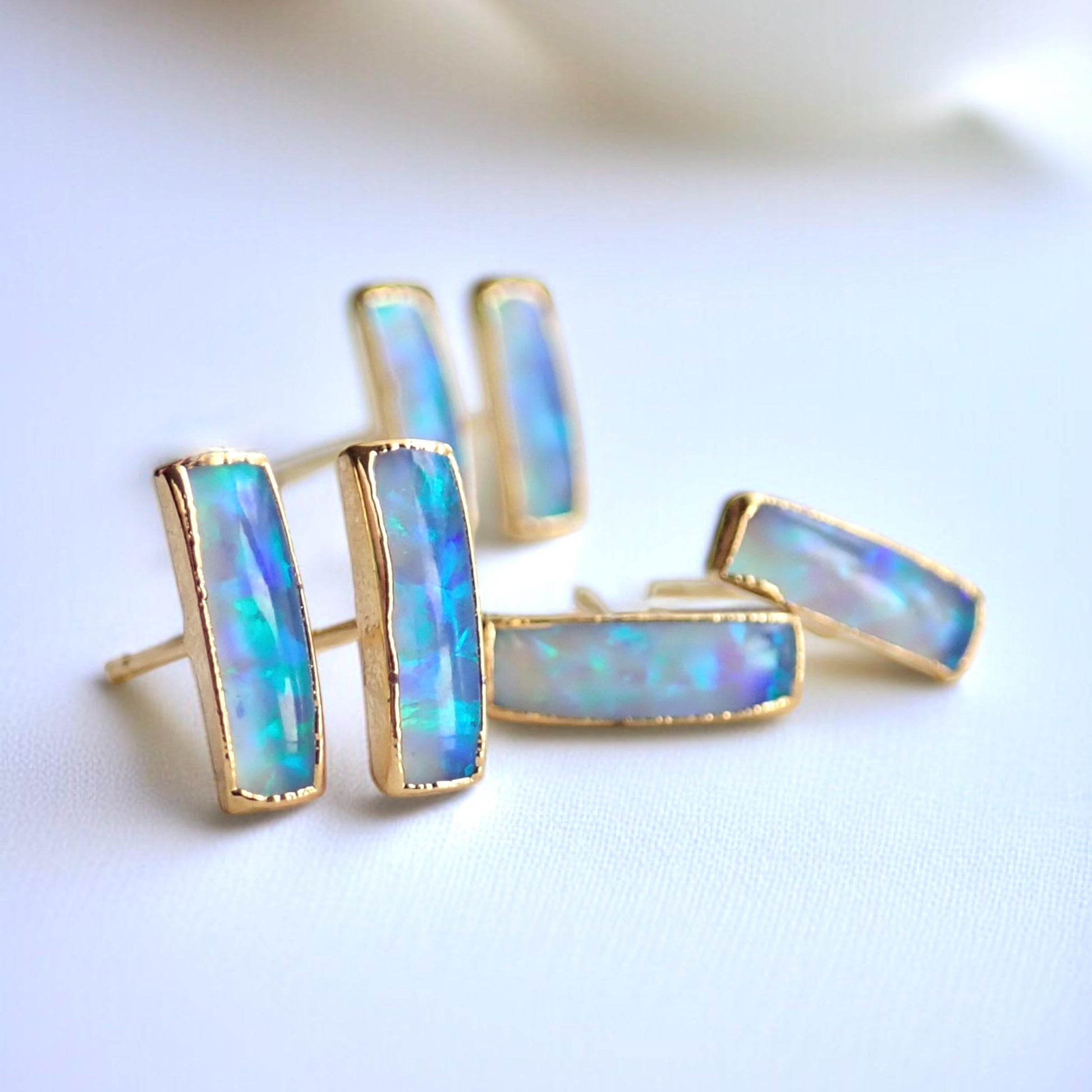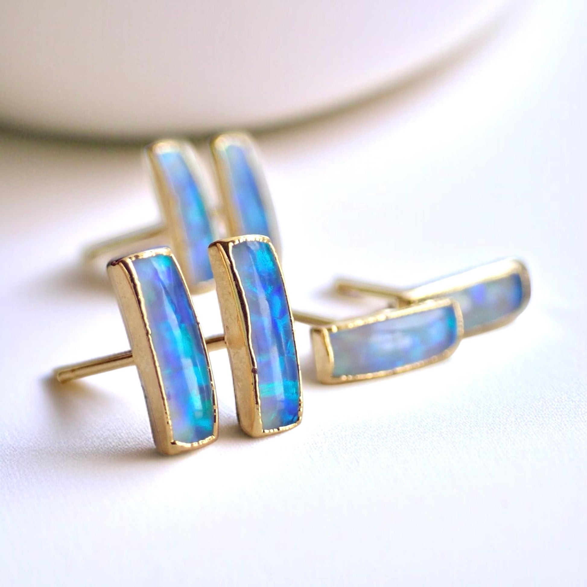 Small Blue Opal Bar Stud Earrings | 14k Gold Opal Earrings | October Birthstone Jewelry | Gift for Her, Opal Post Earrings, Opal Studs Gold