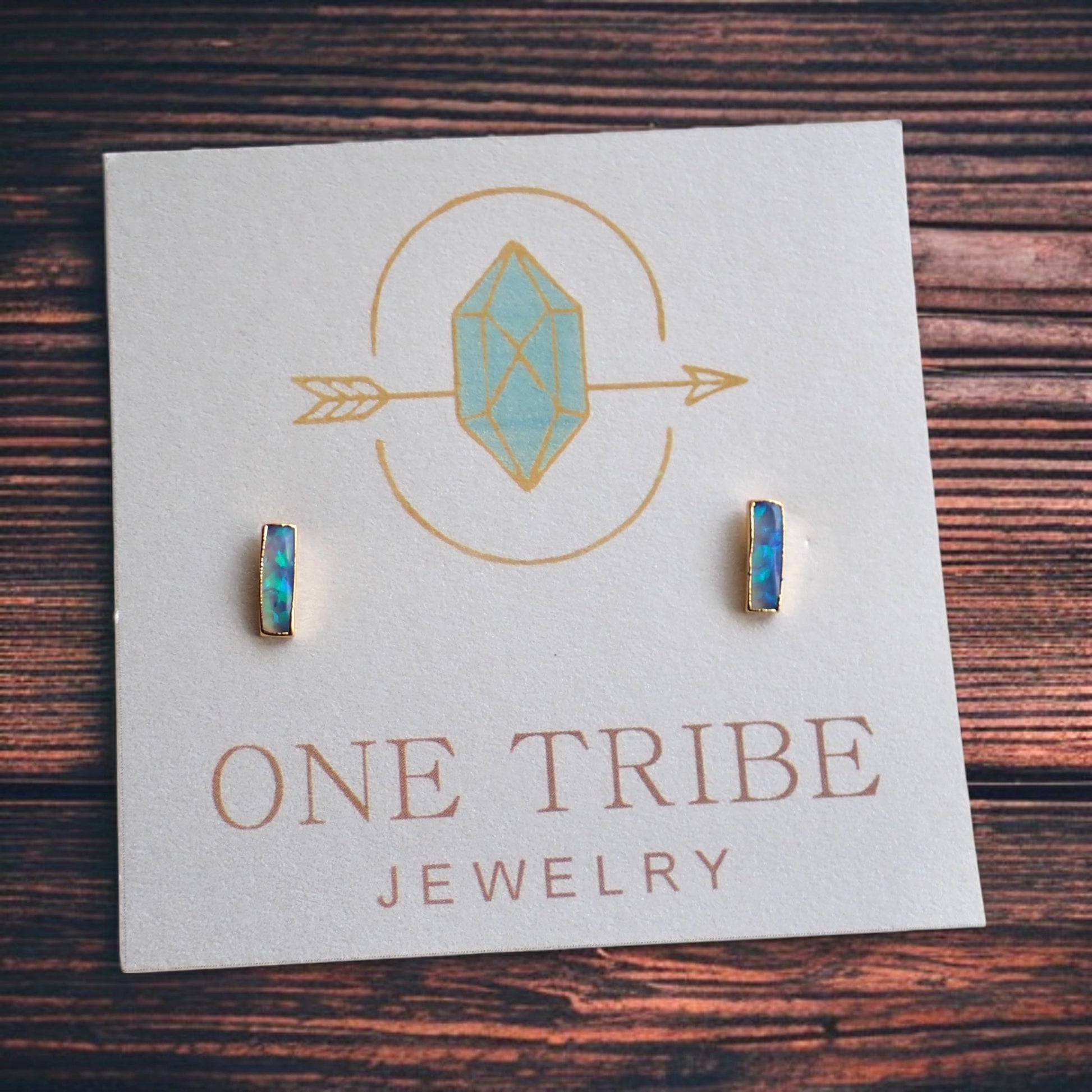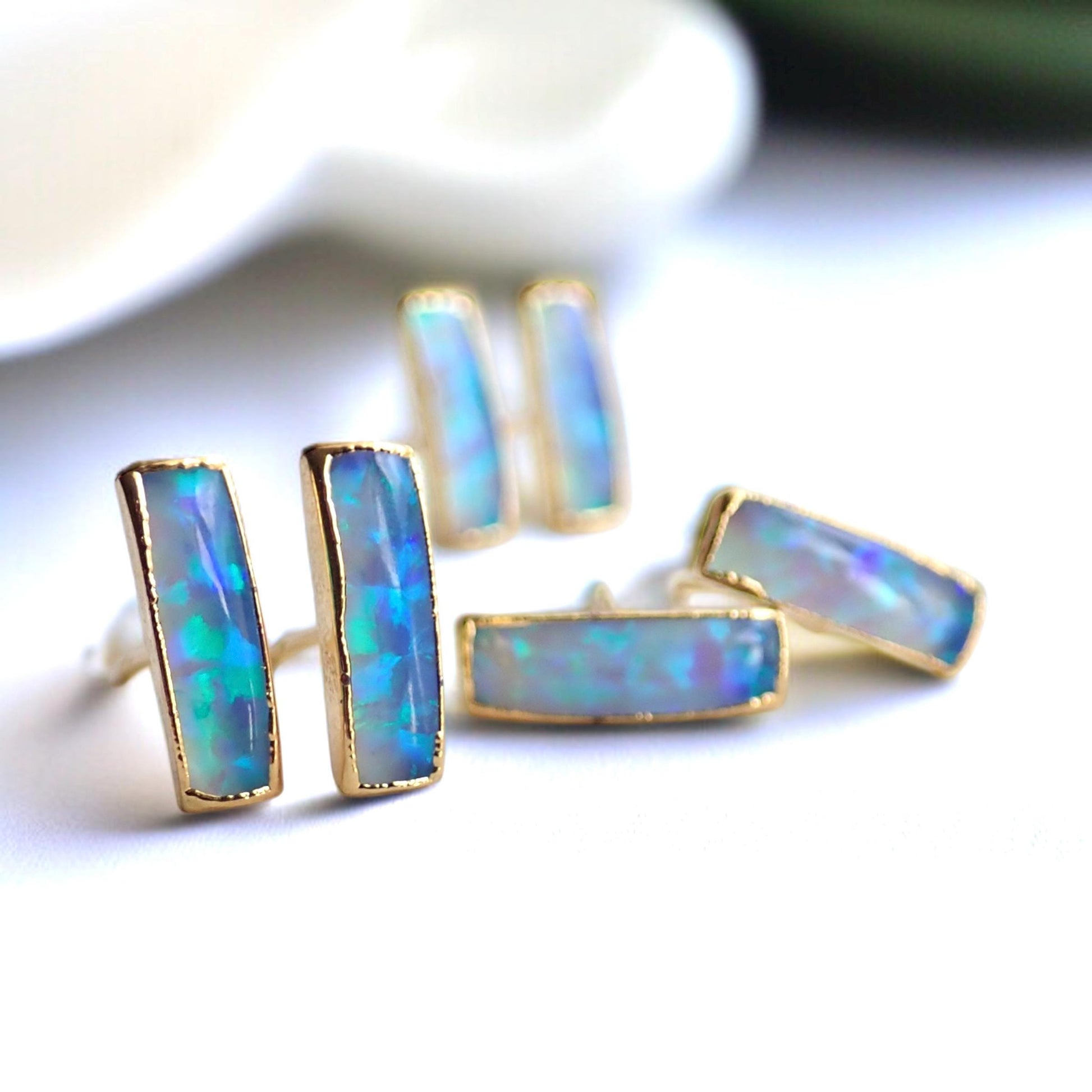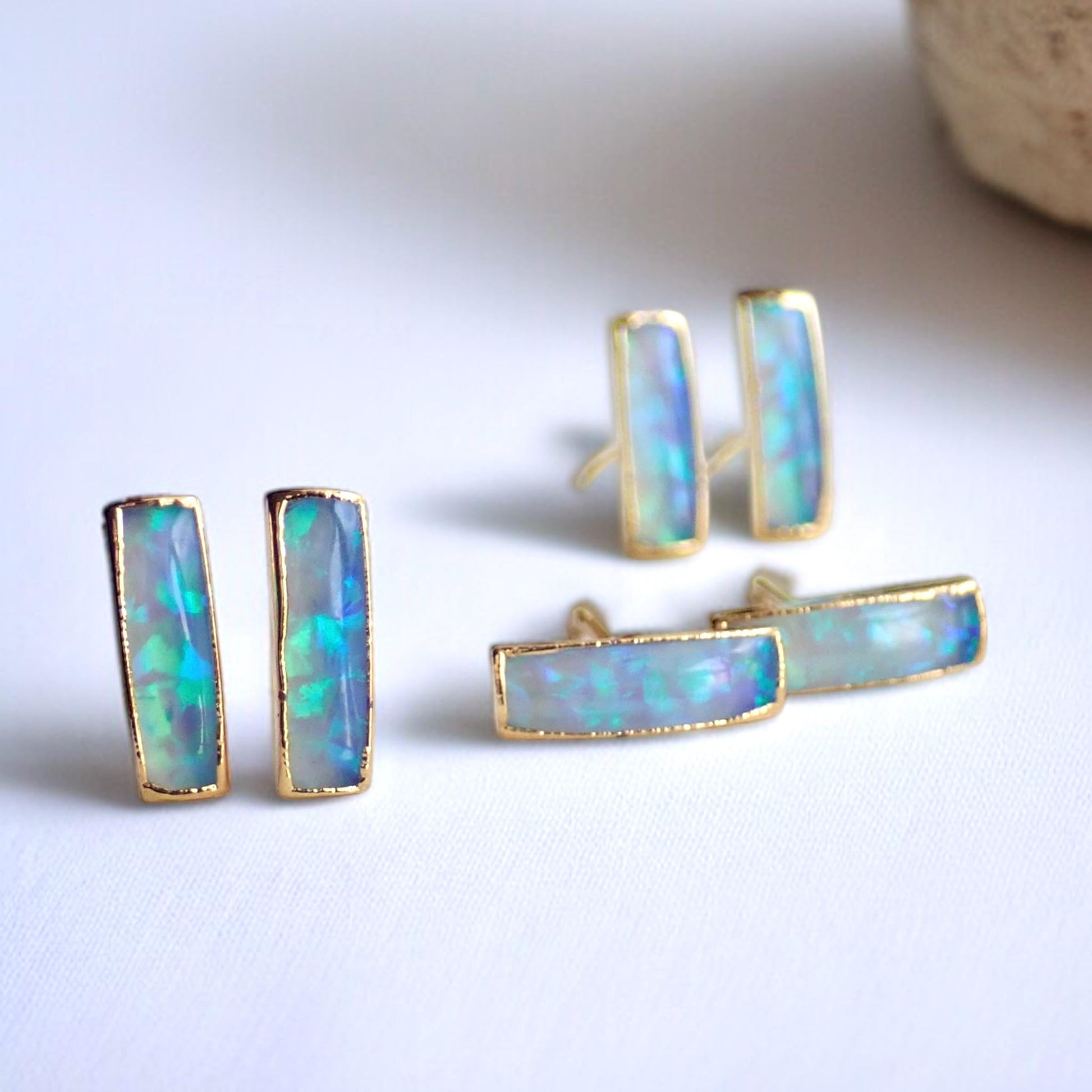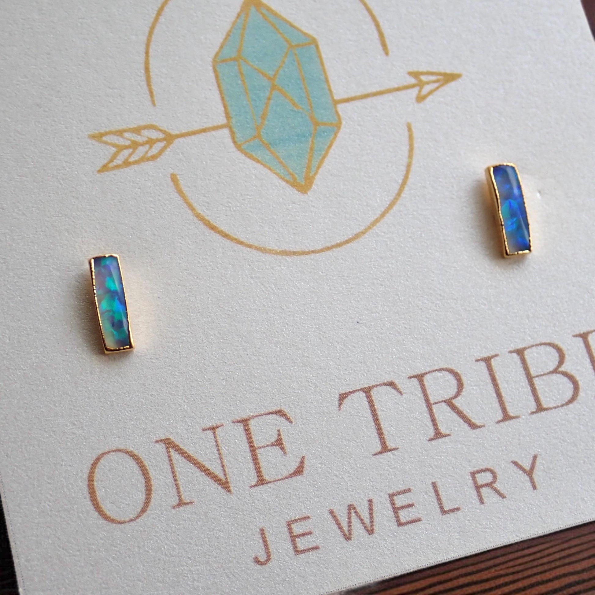 Small Blue Opal Bar Stud Earrings | 14k Gold Opal Earrings | October Birthstone Jewelry | Gift for Her, Opal Post Earrings, Opal Studs Gold