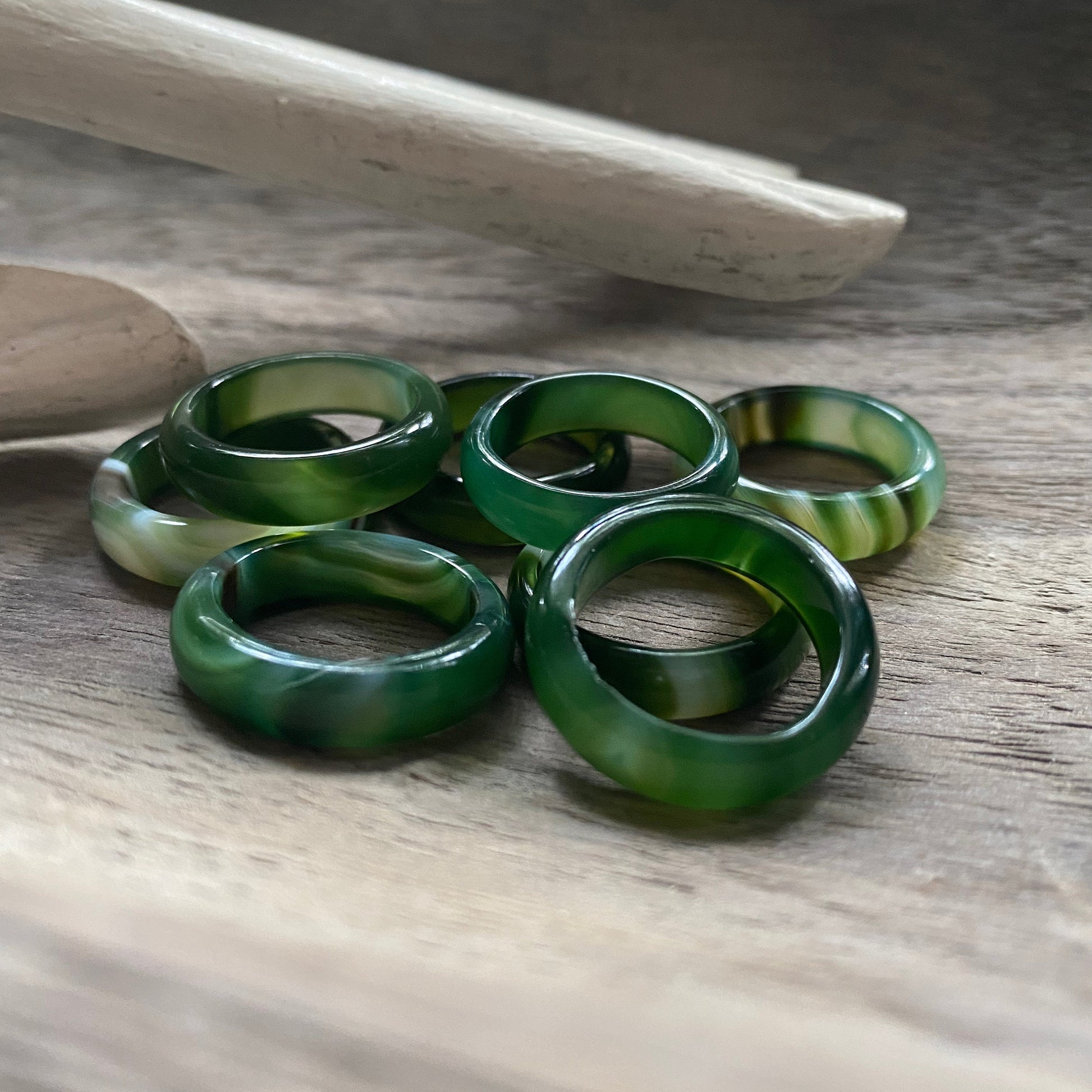 This ring is carved from one piece of natural green banded agate in the most beautiful dark green tones. It's polished to a luscious smoothness, and slightly domes on top. Each ring is one-of-a-kind, just like us. The rings all have their own unique patterns and colors but all will be extremely similar to those pictured here.