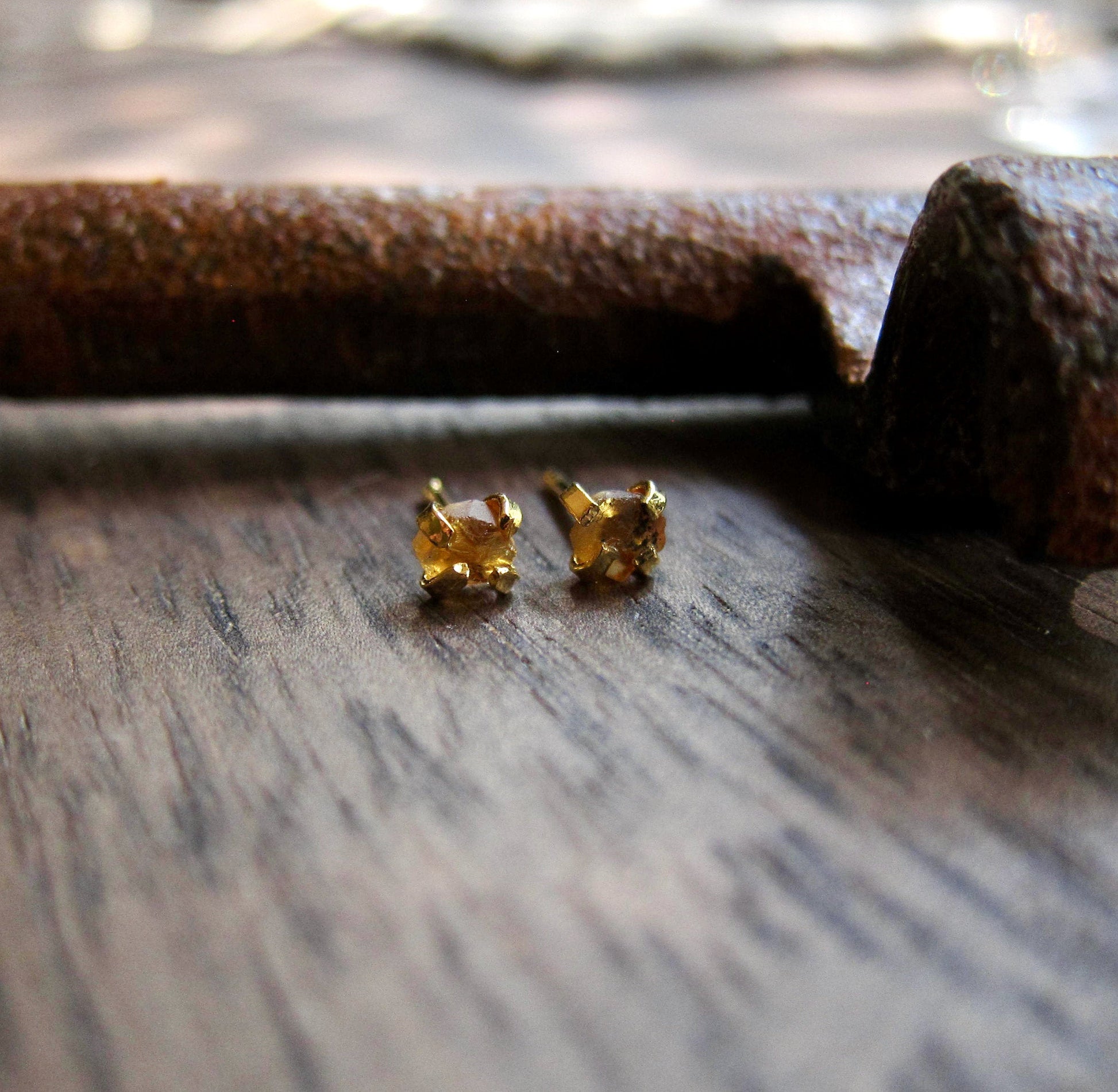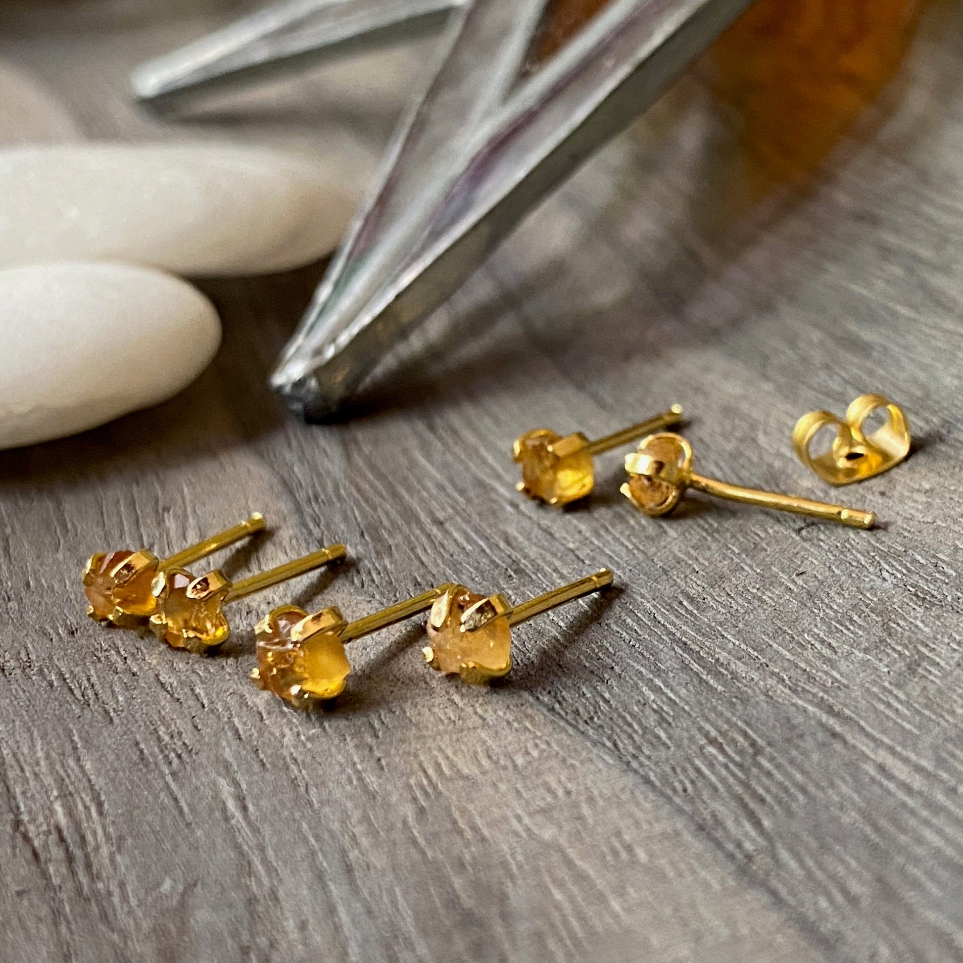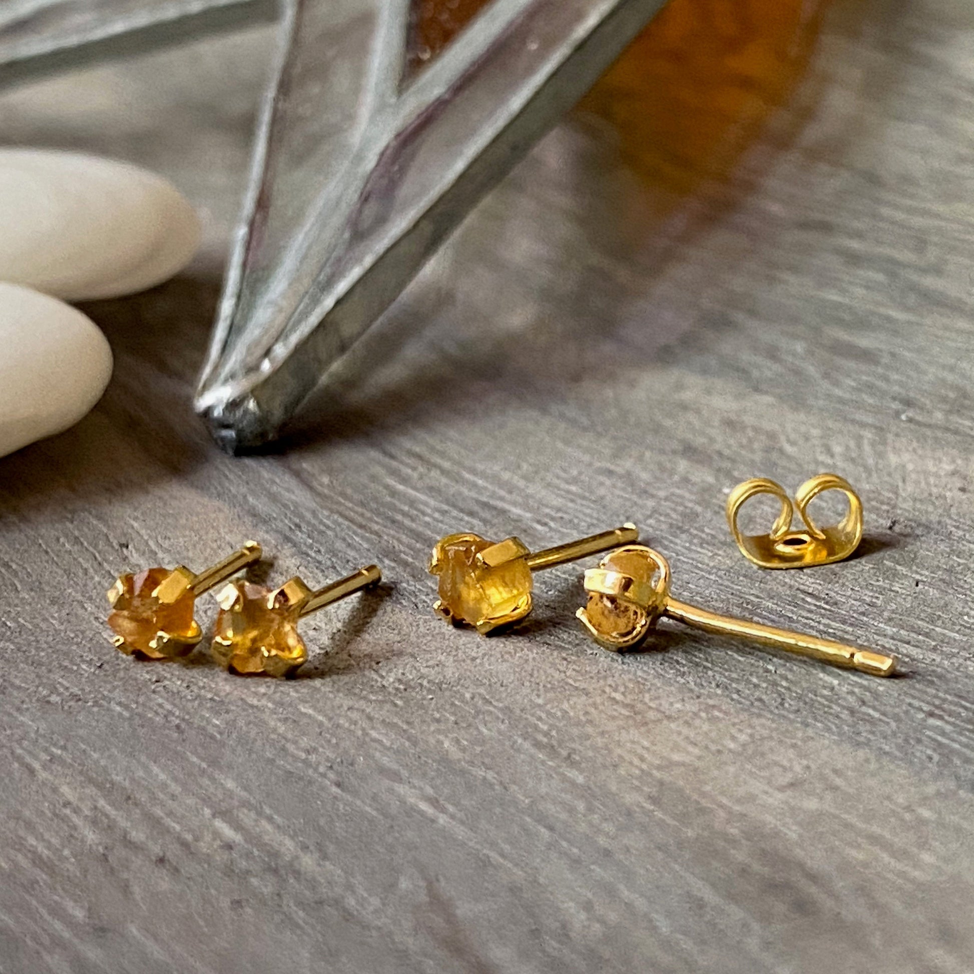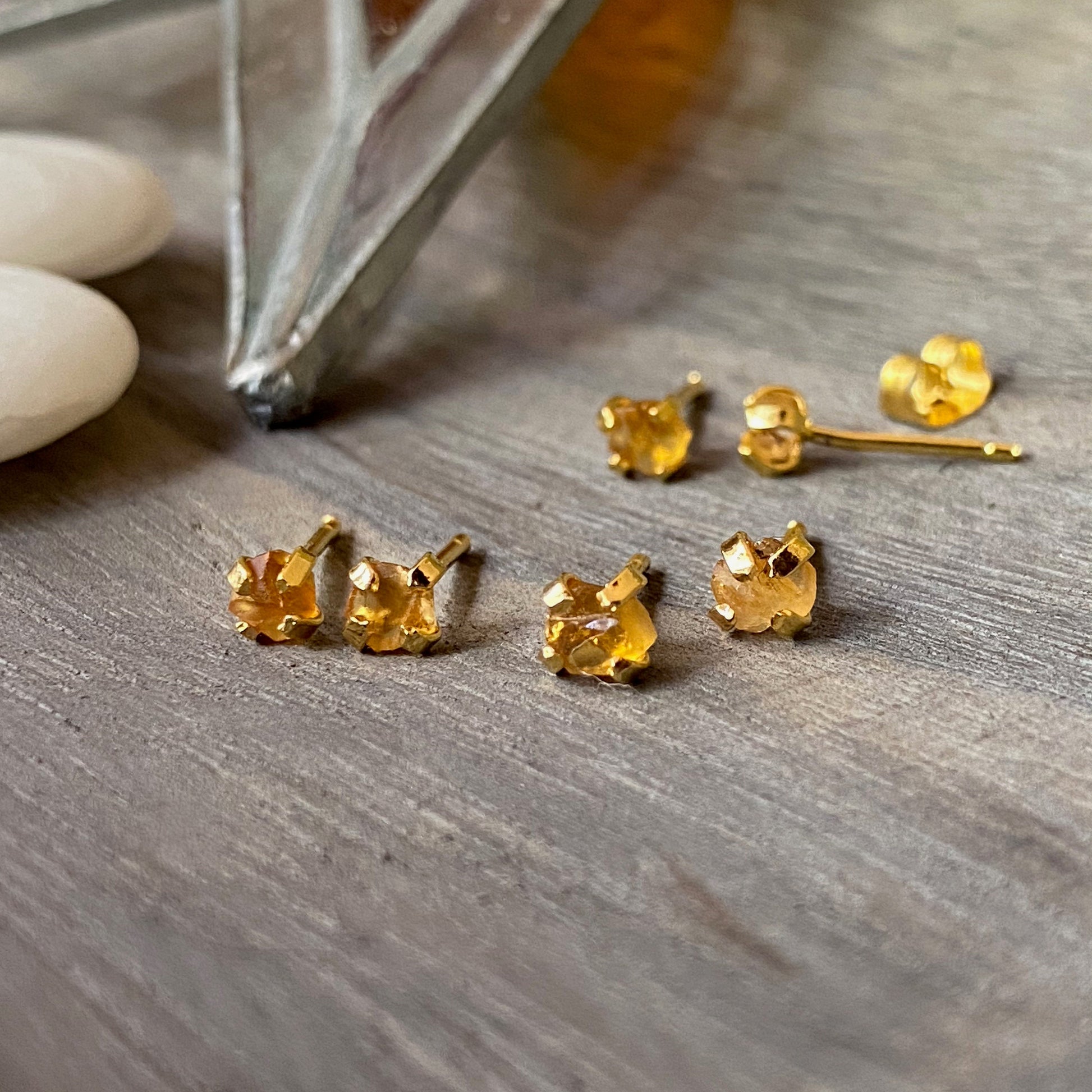 Super sweet everyday stud earrings in genuine raw citrine. This November Birthstone stimulates the chakras like the sunlight of spring, clearing the mind and stirring the soul to action. Carrying the power of the sun, it is warm and comforting, energizing and life giving. Citrine is sometimes known as the healing quartz for its ability to comfort, soothe and calm. It can release negative feelings, spark imagination and manifest fresh beginnings. Its even called the merchants stone for its tendency to attract wealth and prosperity.