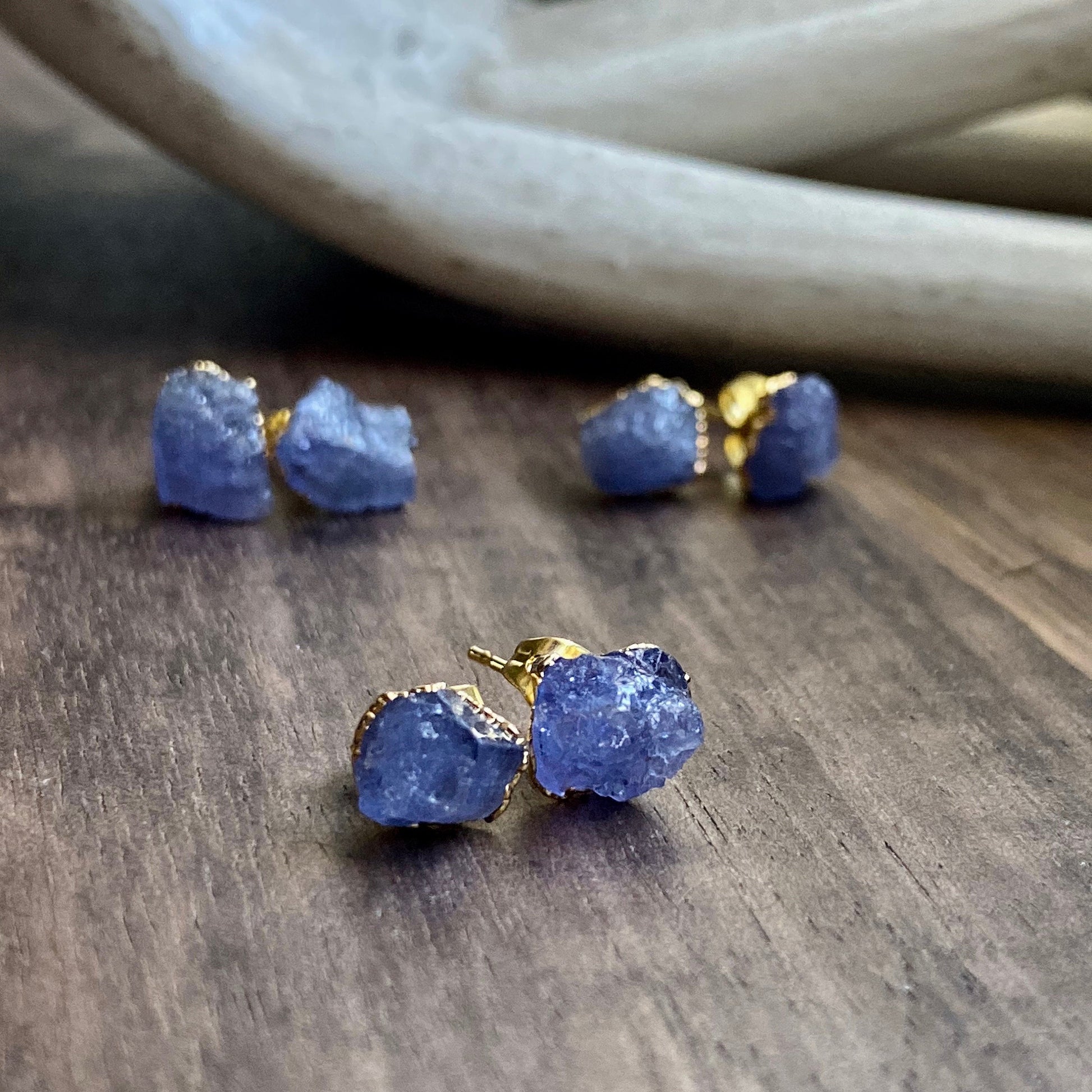 Gorgeous and rough natural tanzanite set inside 14K gold plated post settings.So simple and so perfect for everyday wear. These beautiful, light purple to blue colored gems are a birthstone for December and would make perfect gifts.