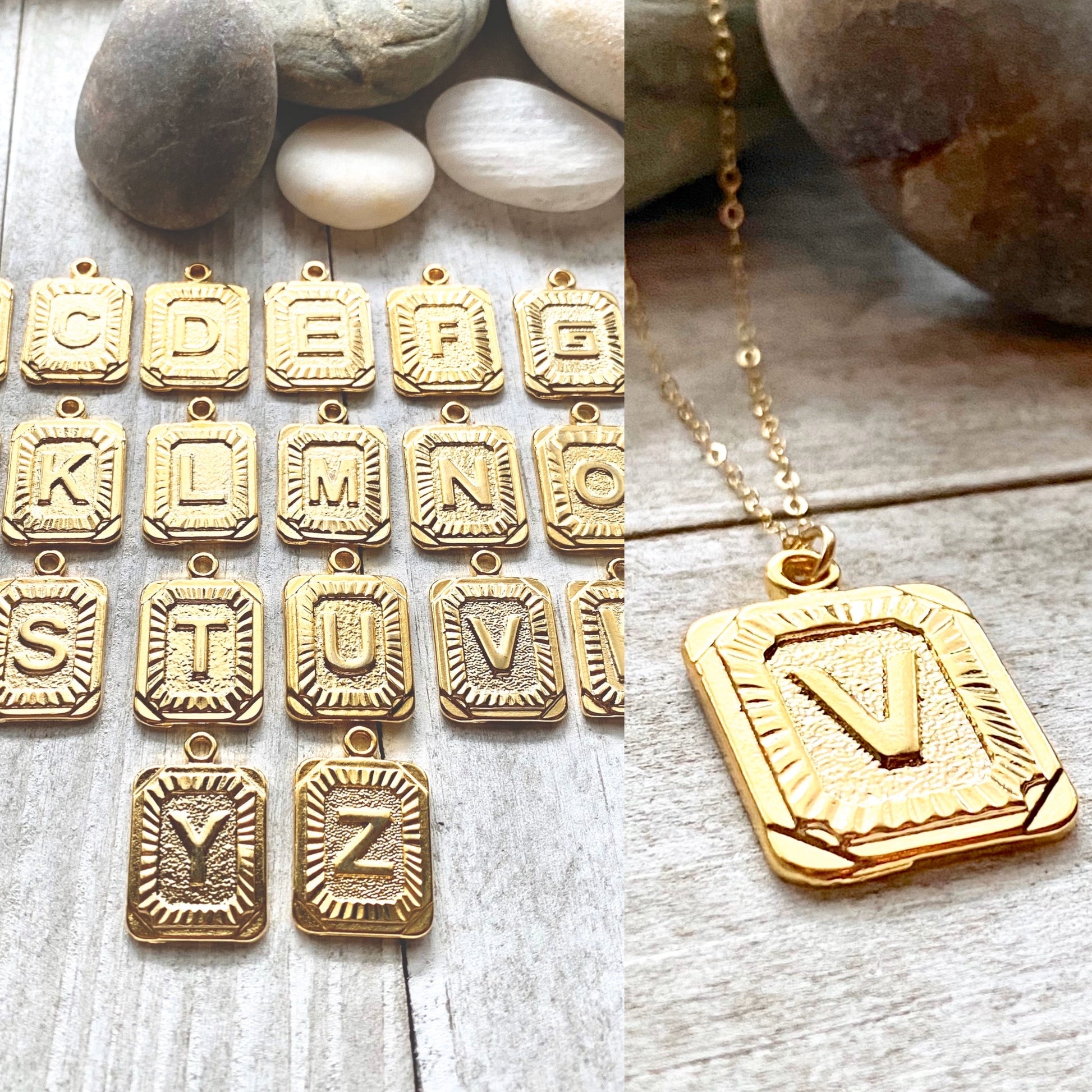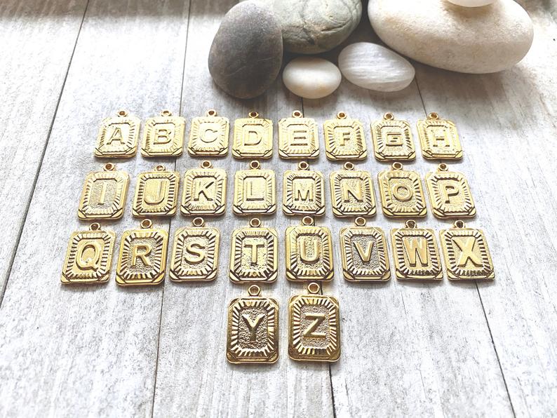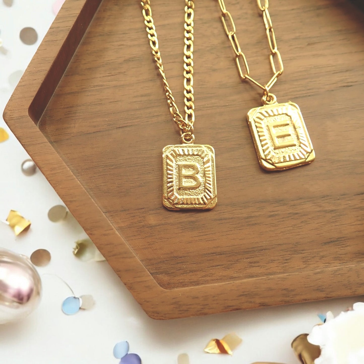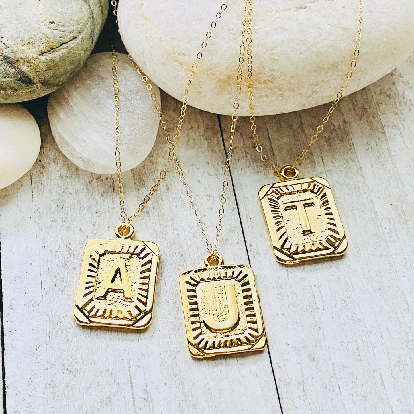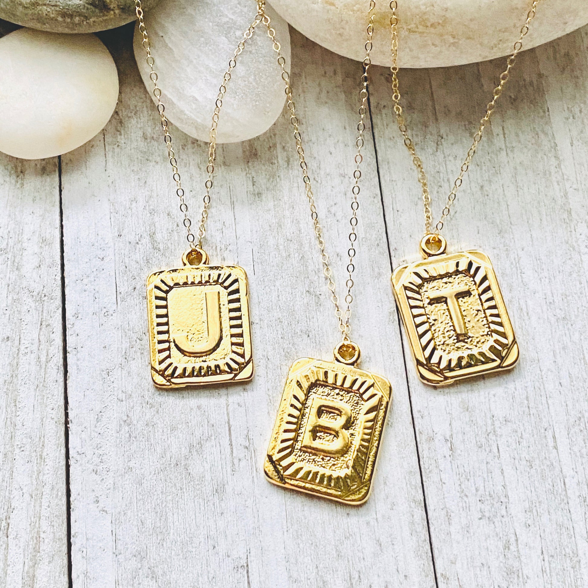 A beautiful, personalized gift you can customize specifically for your family, friends, or for yourself! A unique gold initial necklacefeaturing a shiny brass rectangular pendant with the letterof your choice, on a 14Kt gold filled dainty chain with a spring ring clasp.