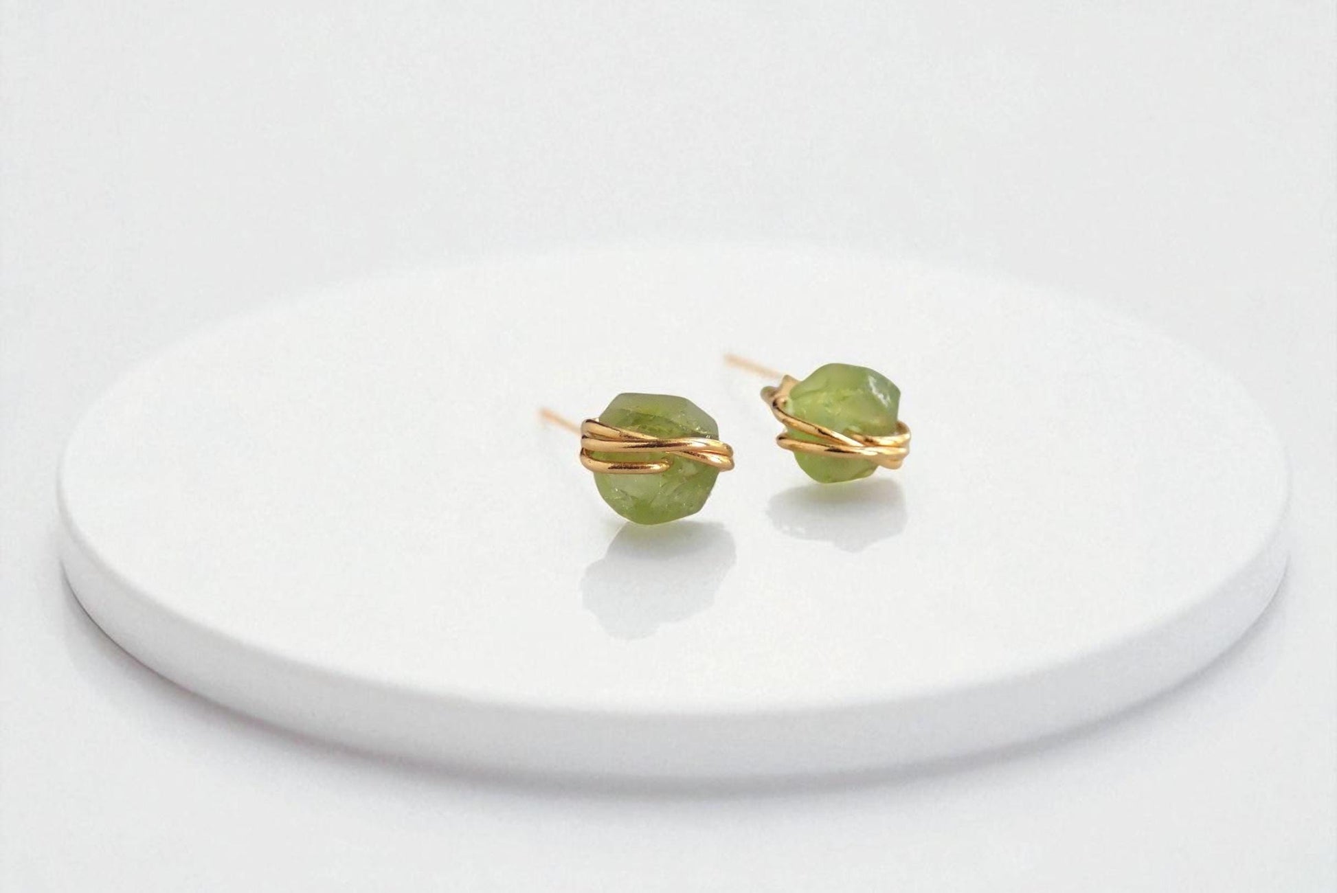 Tiny Peridot or Sapphire Stud Earrings, 14k Gold Filled Wire Wrapped Gemstone Posts,August Birthstone Jewelry,Dainty Natural Crystal Earring