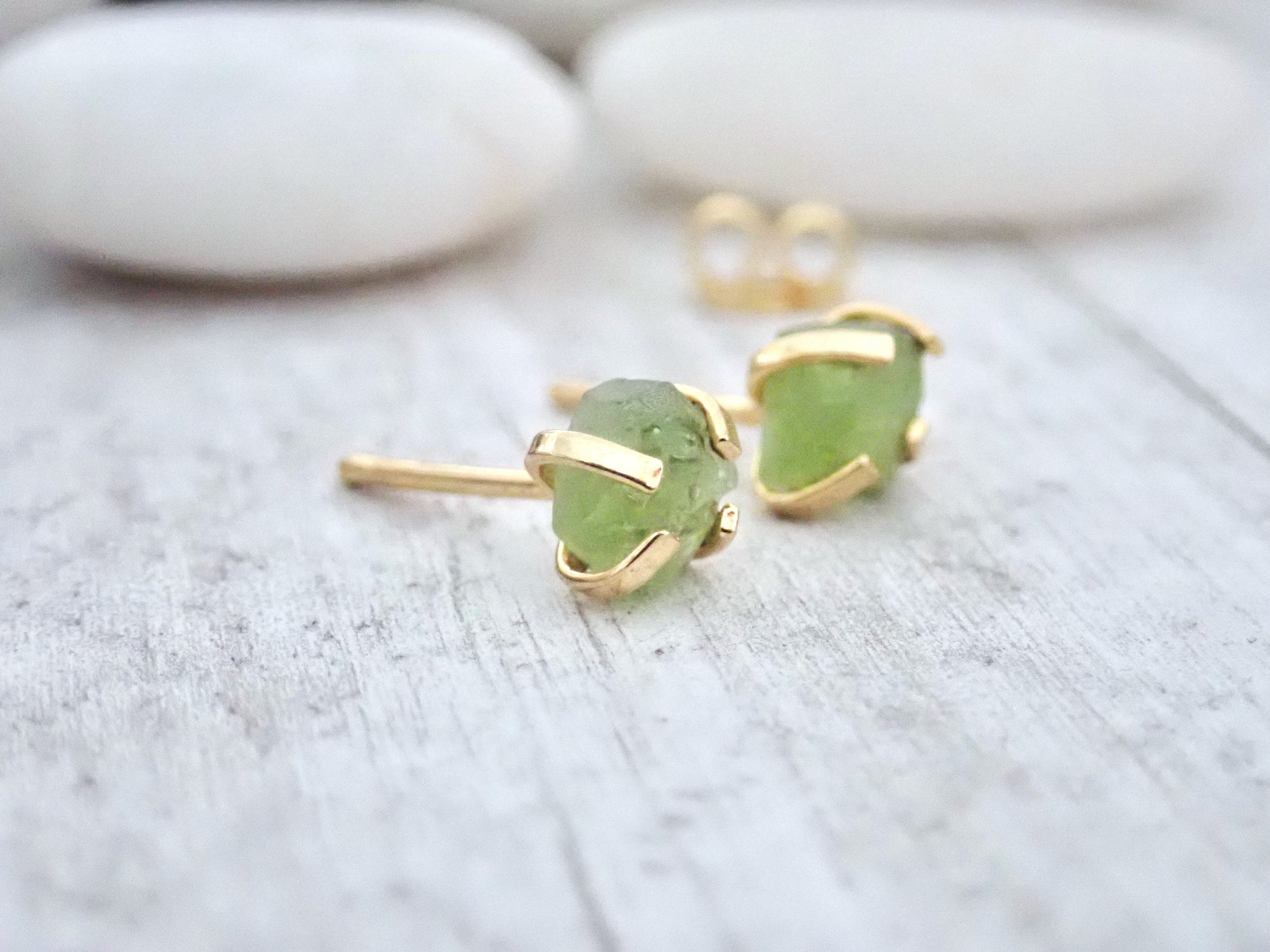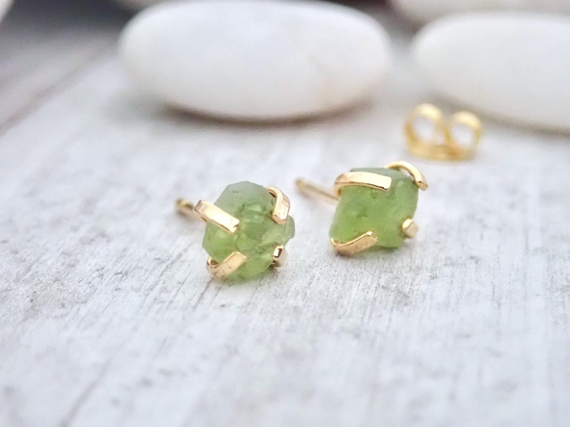 Gorgeous little raw peridot stud earrings prong-set in 14k gold plated over brass. These super dainty studs are made with genuine raw peridot crystals and prong-set in 14k gold over brass.