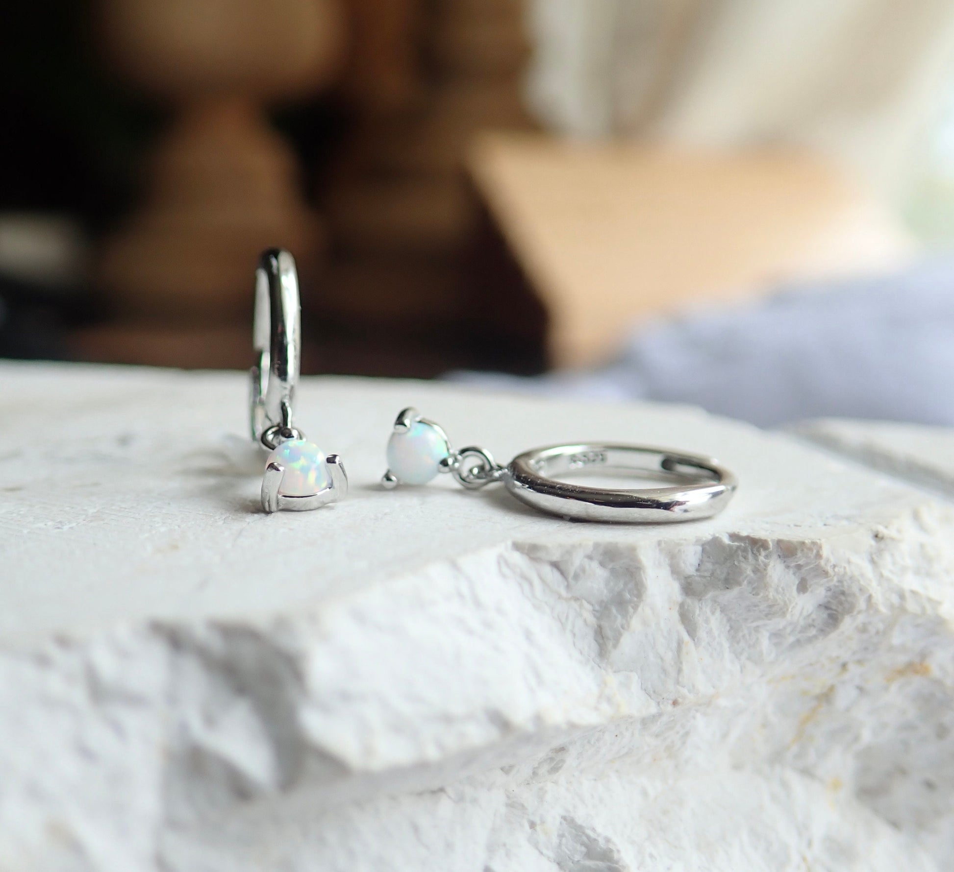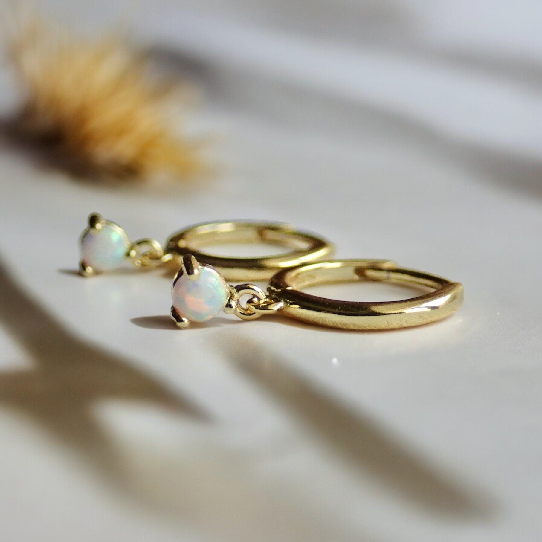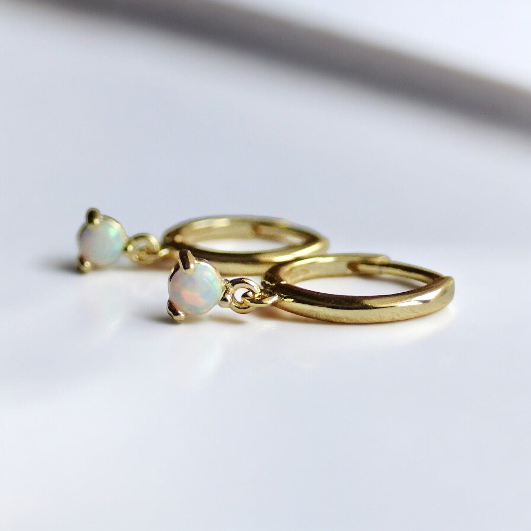 Tiny White Opal Huggie Hoop Earrings - Sterling Silver Opal Charm Dangle Hoops, October Birthstone Gift for Her