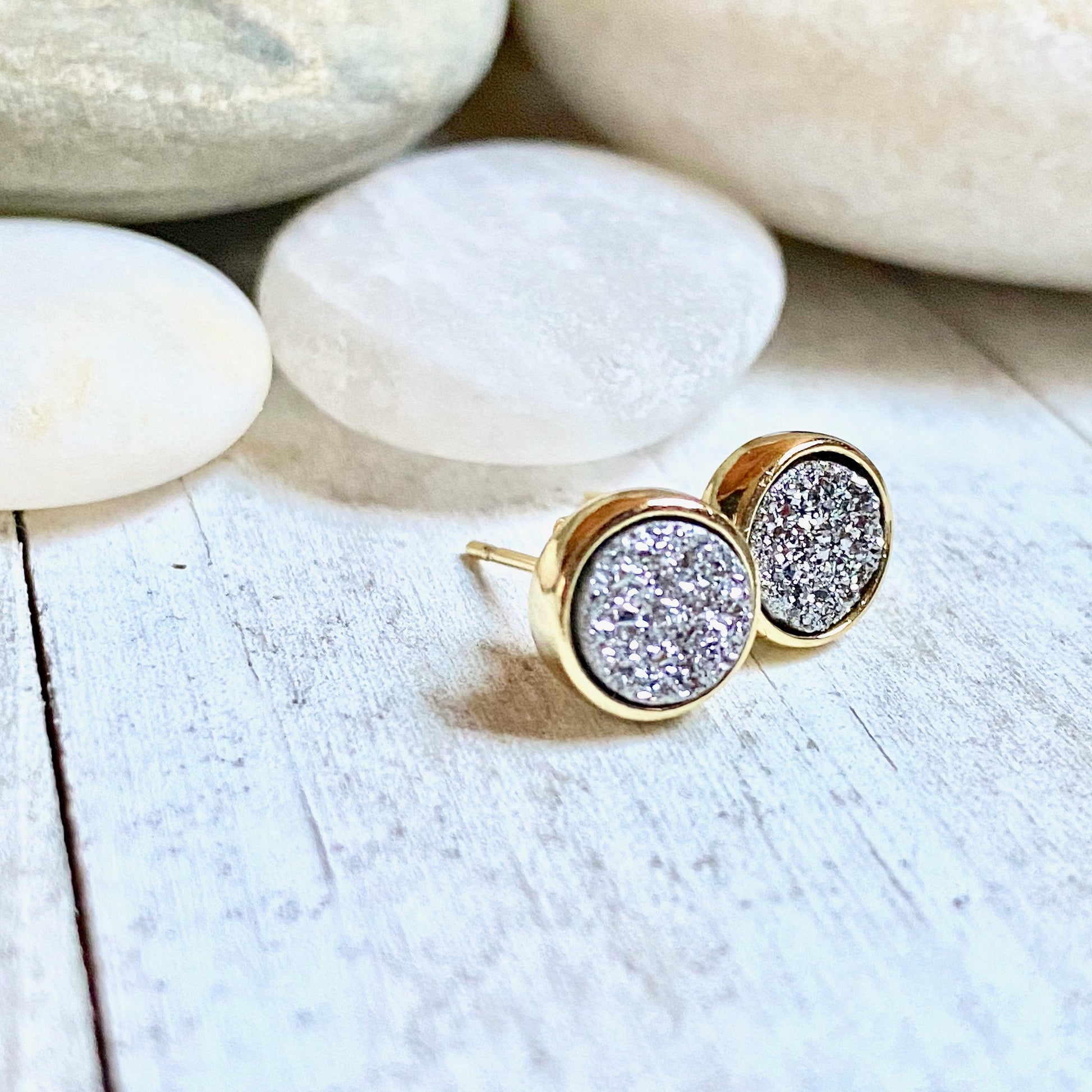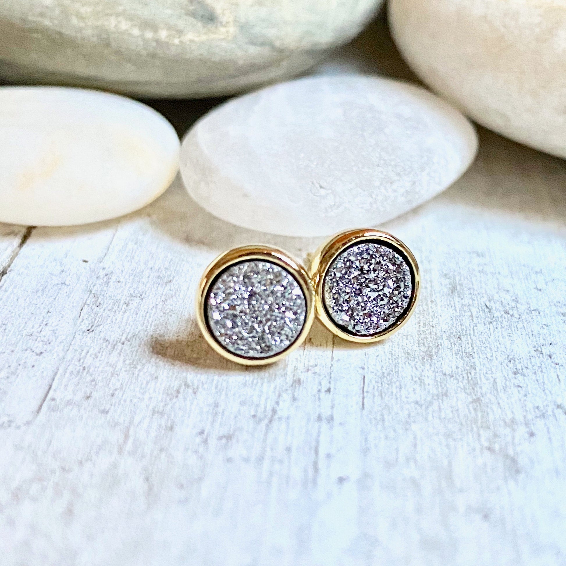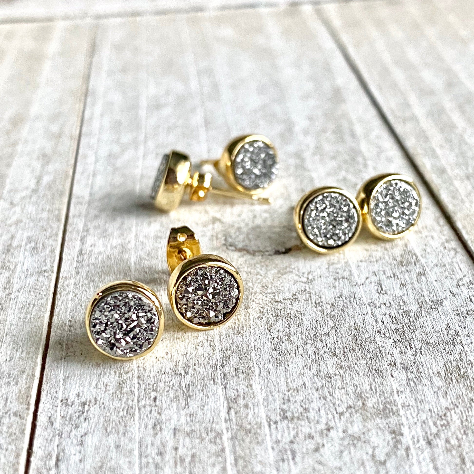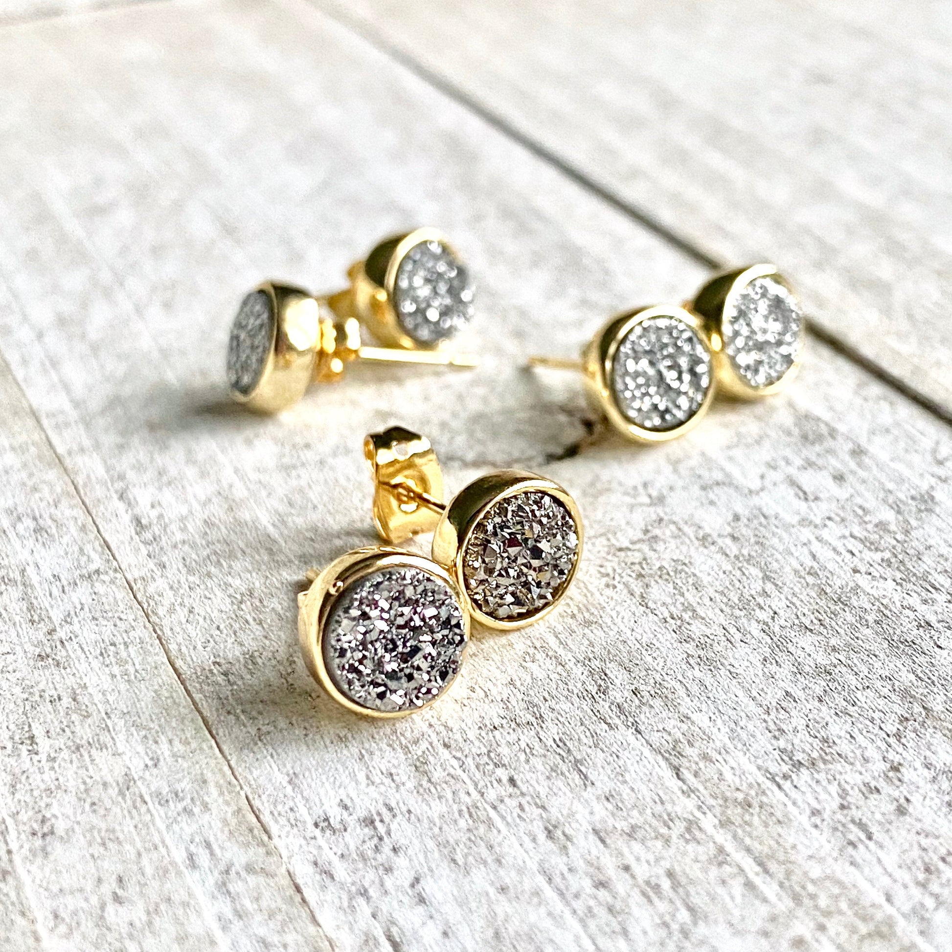 Everyday earrings that pack a punch. Who doesn't love a little sparkle? With these dainty little beauties you can wear that unmistakable druzy shimmer every day of the week. Great for every day wear..super light and carefree. The natural druzy stones are coated with titanium and heat treated to create these sparkly darlings. Gold plated bezel and posts.