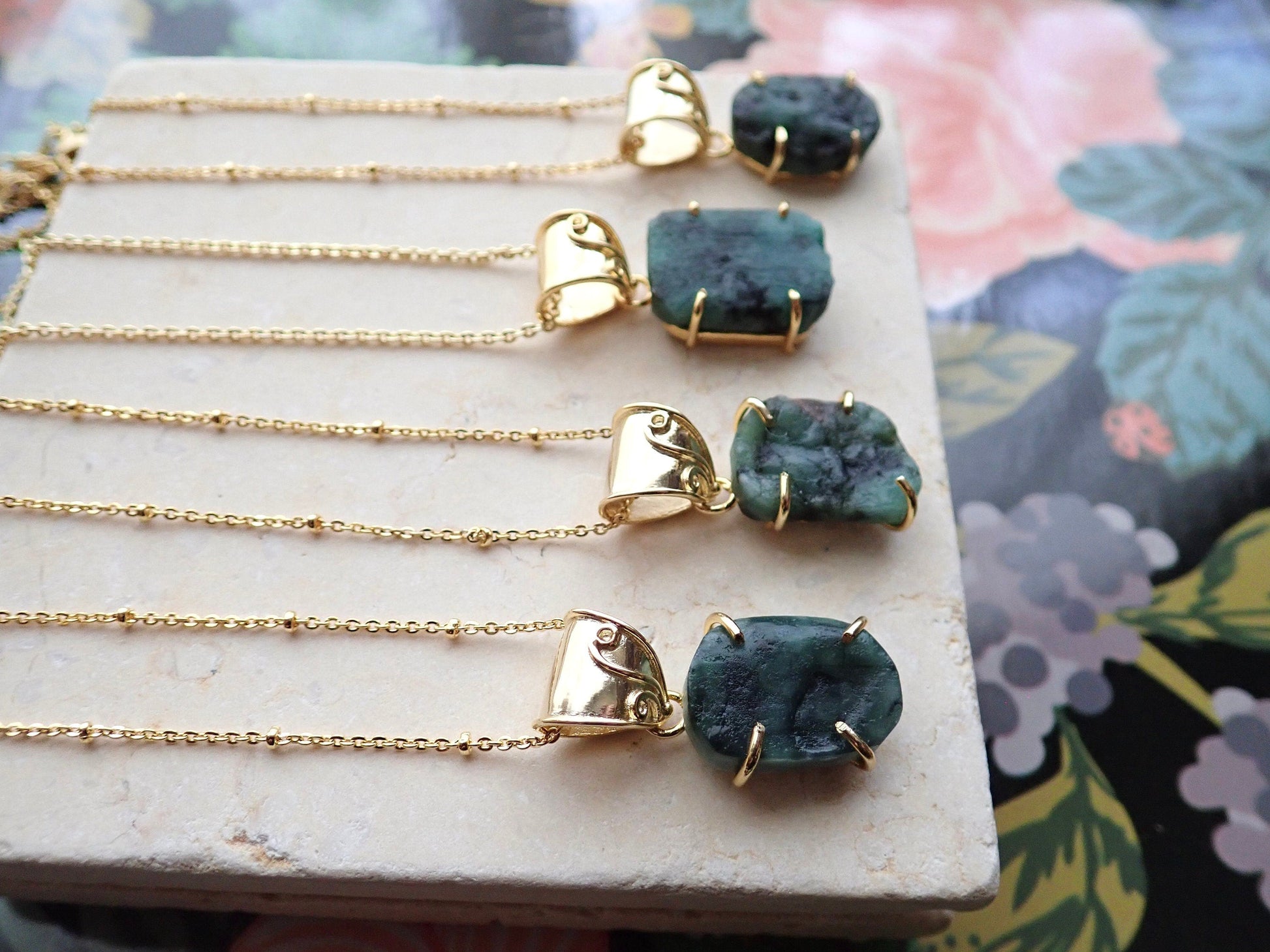 This eye-catching Raw Emerald Pendant Necklace is the perfect accessory to elevate your everyday style. Featuring a large raw emerald, prong-set and held by an intricately designed fancy bail. The high quality gold-filled chain adds a touch of luxury, making it perfect for layering with other necklaces or wearing on its own for a statement look.