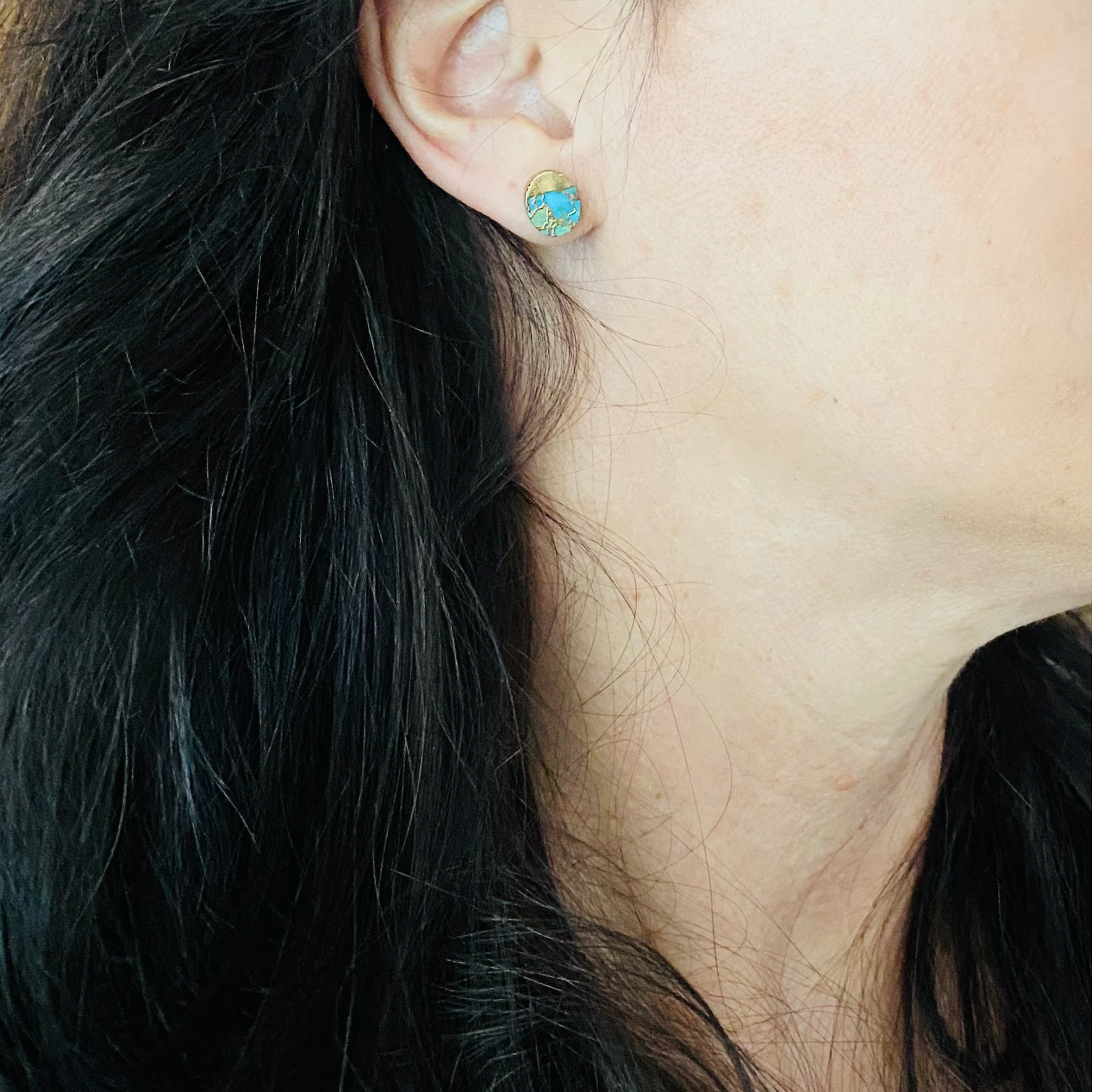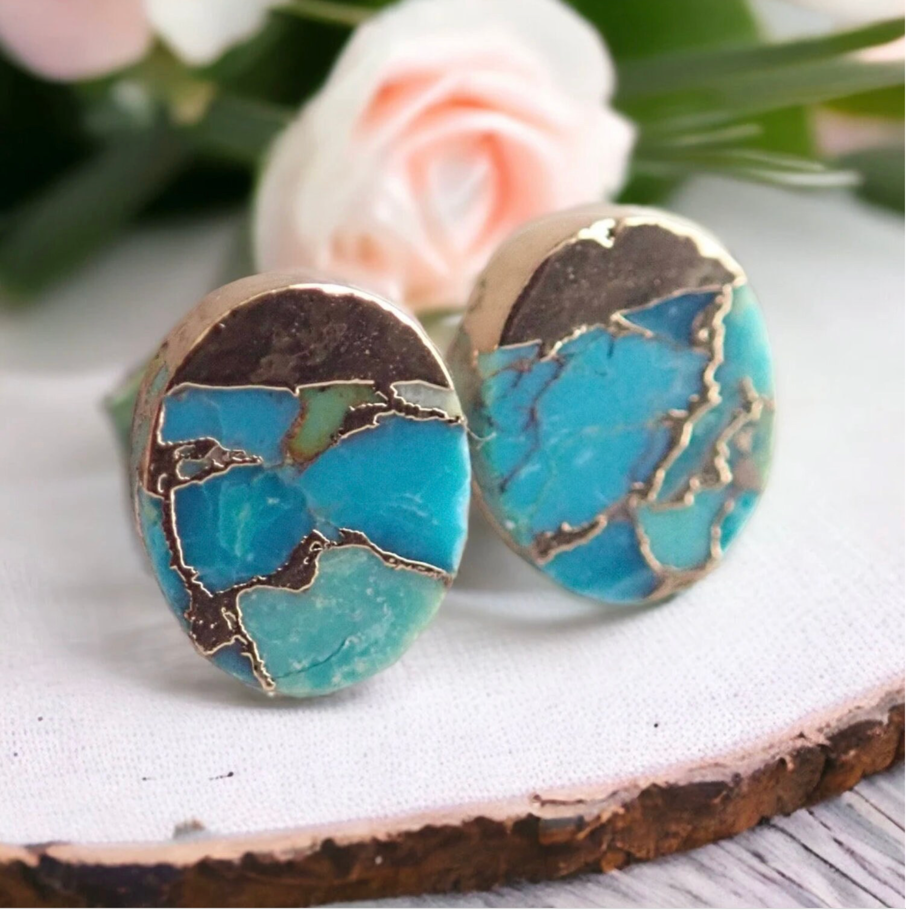 Everyday earrings that pack a punch. Who doesn't love turquoise? With these dainty little beauties you can wear that unmistakable pop of color every day of the week. Super hot right now, turquoise goes with so many looks...beachy, tribal, boho, hippie, whatever style you call your own these will fit right in. Great for every day wear..super light and carefree. The turquoise is electroplated in 24k gold.