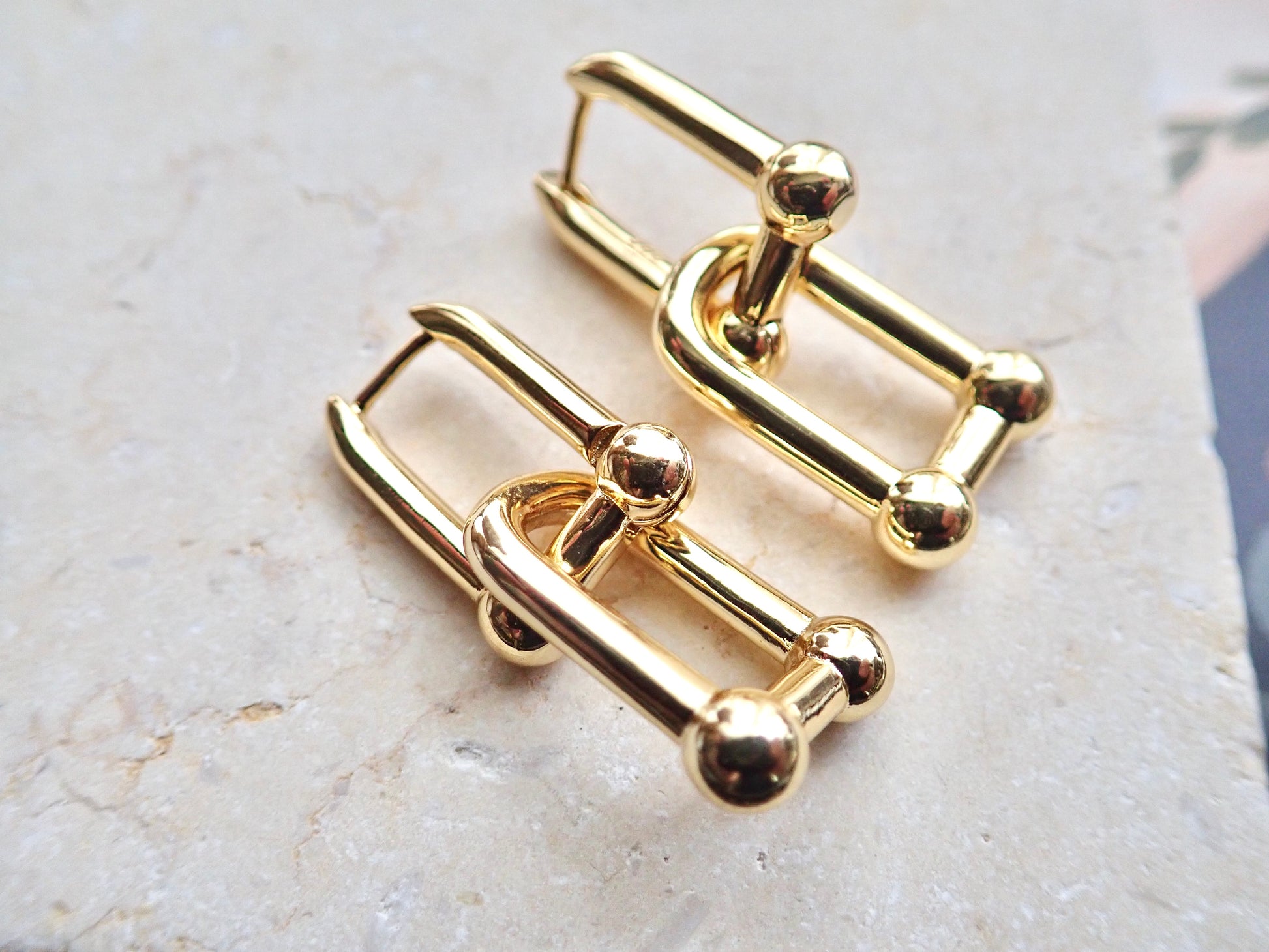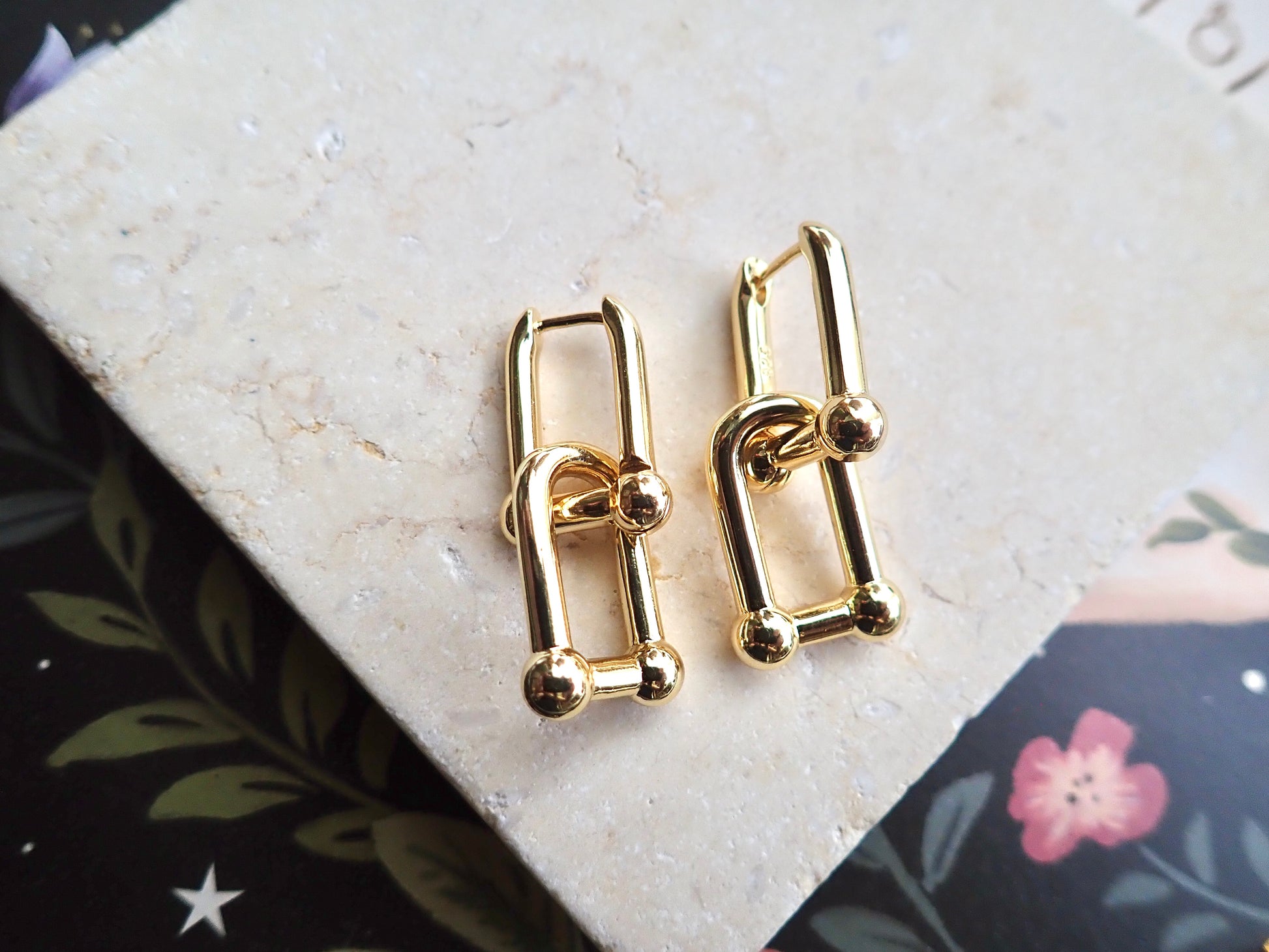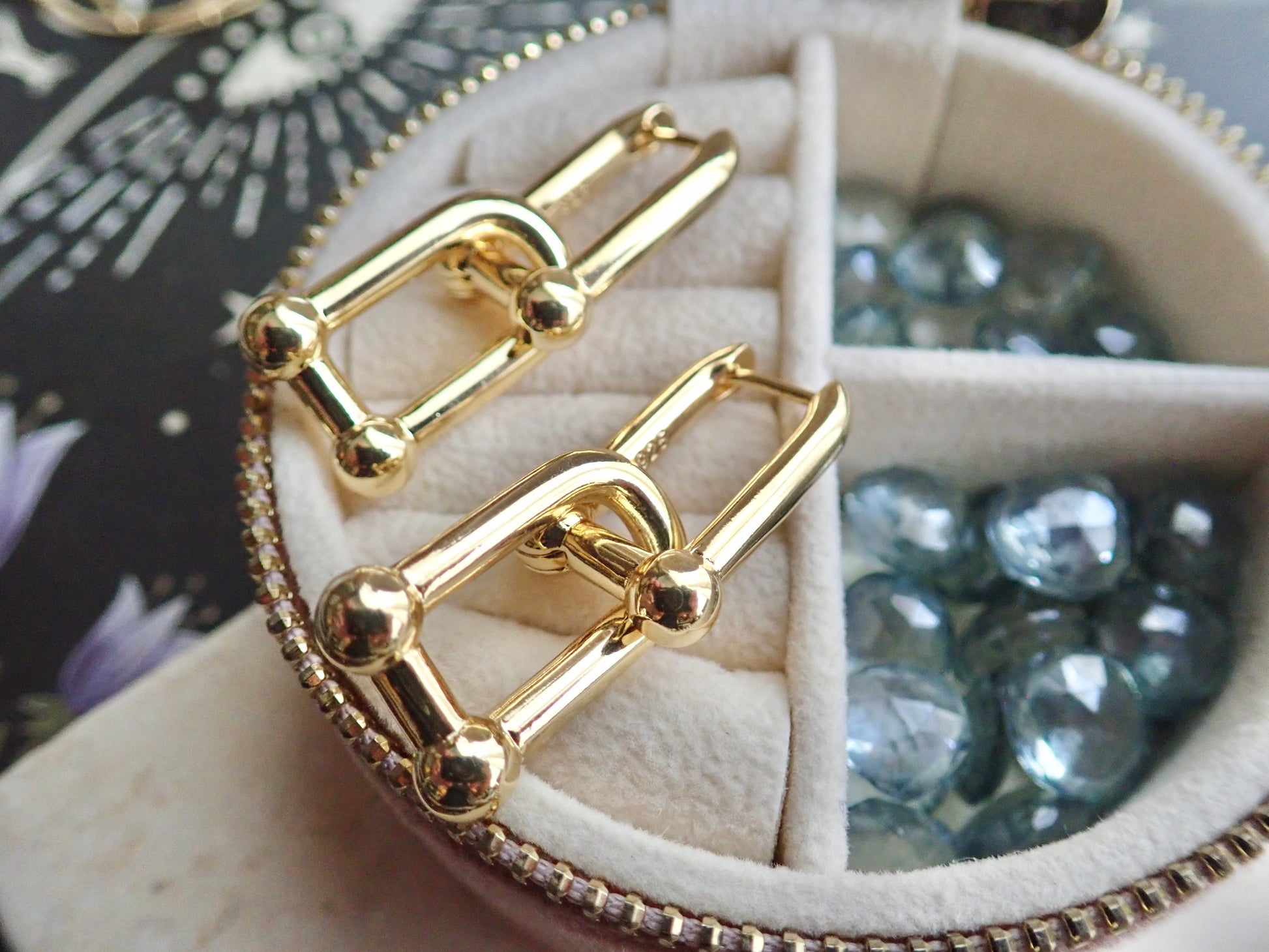 Made from high-quality sterling silver, these earrings are expertly plated with a thick layer of lustrous 14K gold vermeil, ensuring a durable and luxurious finish that will stand the test of time. The chunky link hardware design is bold and eye-catching, making these earrings a perfect choice for those who love to make a statement with their jewelry.