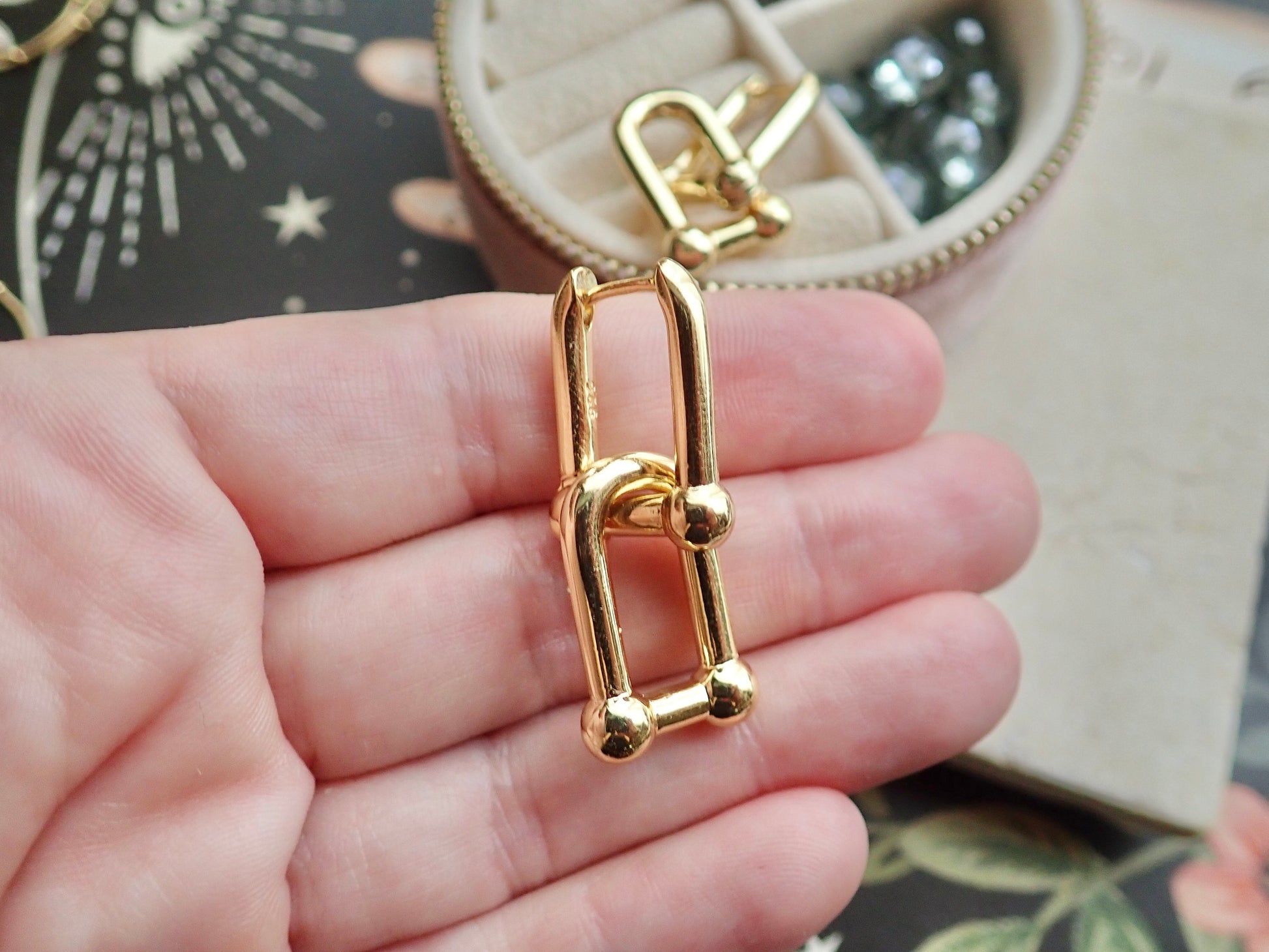 The secure latch closure ensures that the earrings stay in place, giving you peace of mind while you dazzle everyone with your unique style. The second link can be easily removed too giving you the option to wear these as single link earrings.