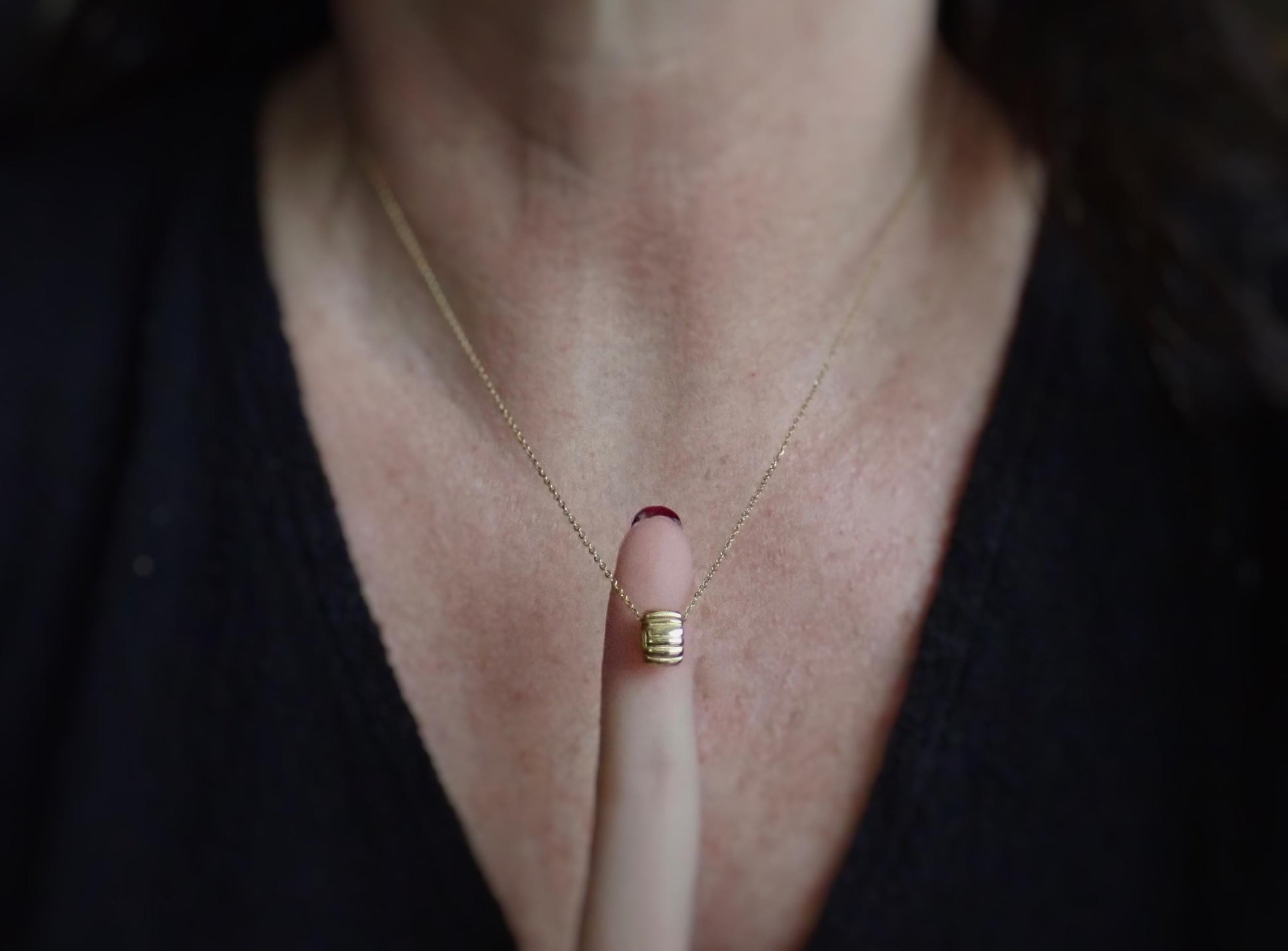 A necklace you'll never want to take off — stylish, durable, and soothing to wear. This waterproof gold bead necklace features a ridged cylindrical pendant that glides freely along a delicate 18k gold PVD chain. The bead's textured design not only adds modern flair, but also makes it a subtle fidget necklace, perfect for calming restless hands during the day.