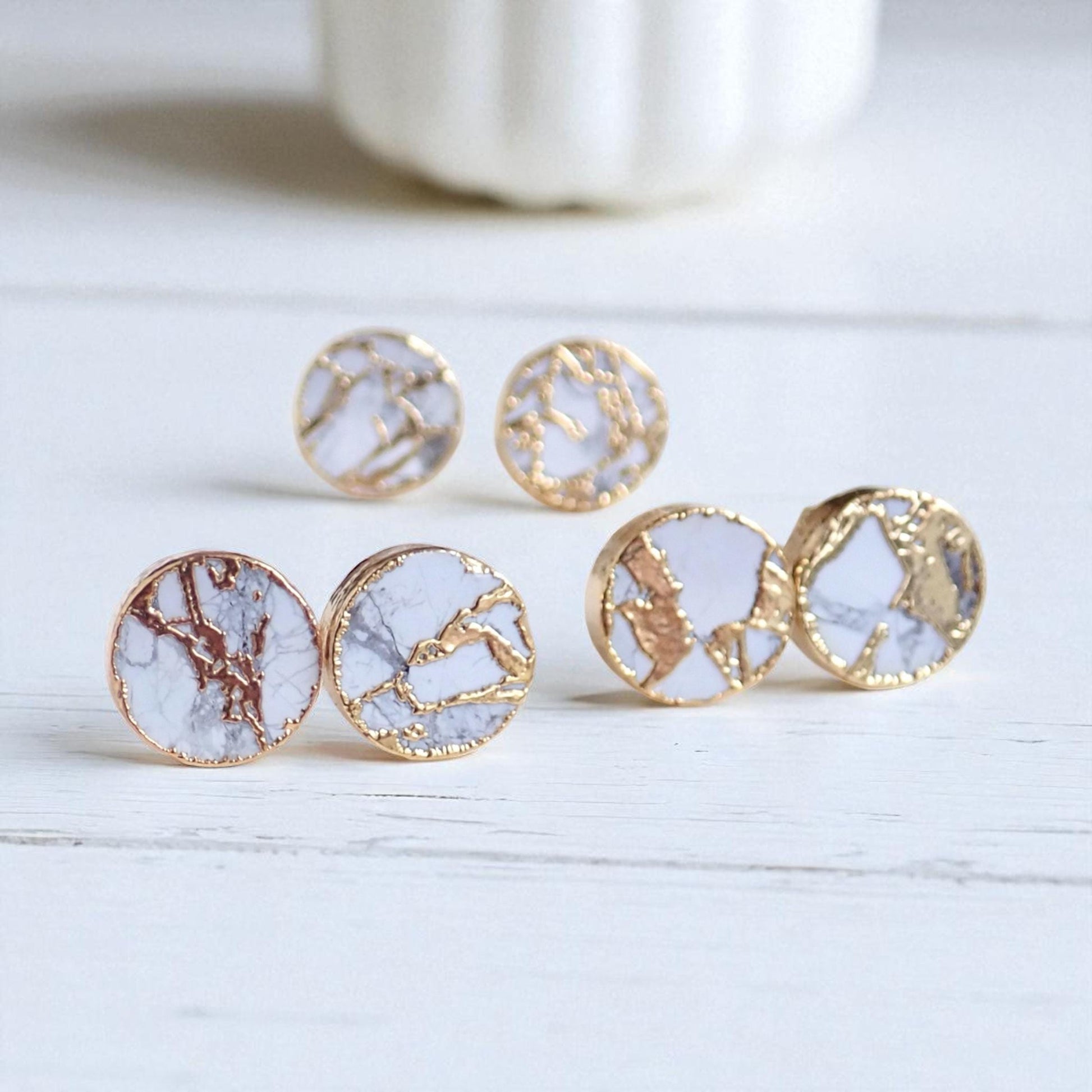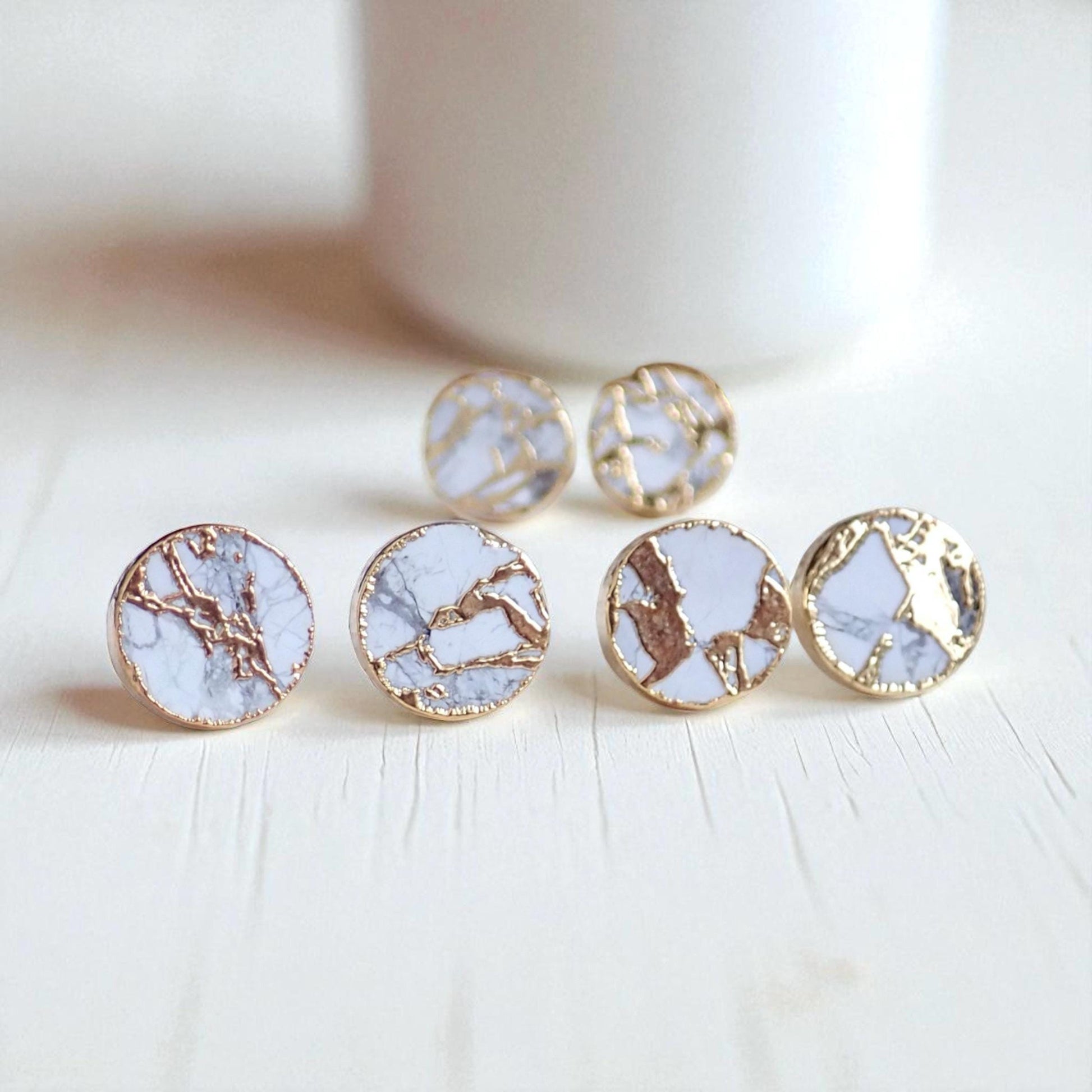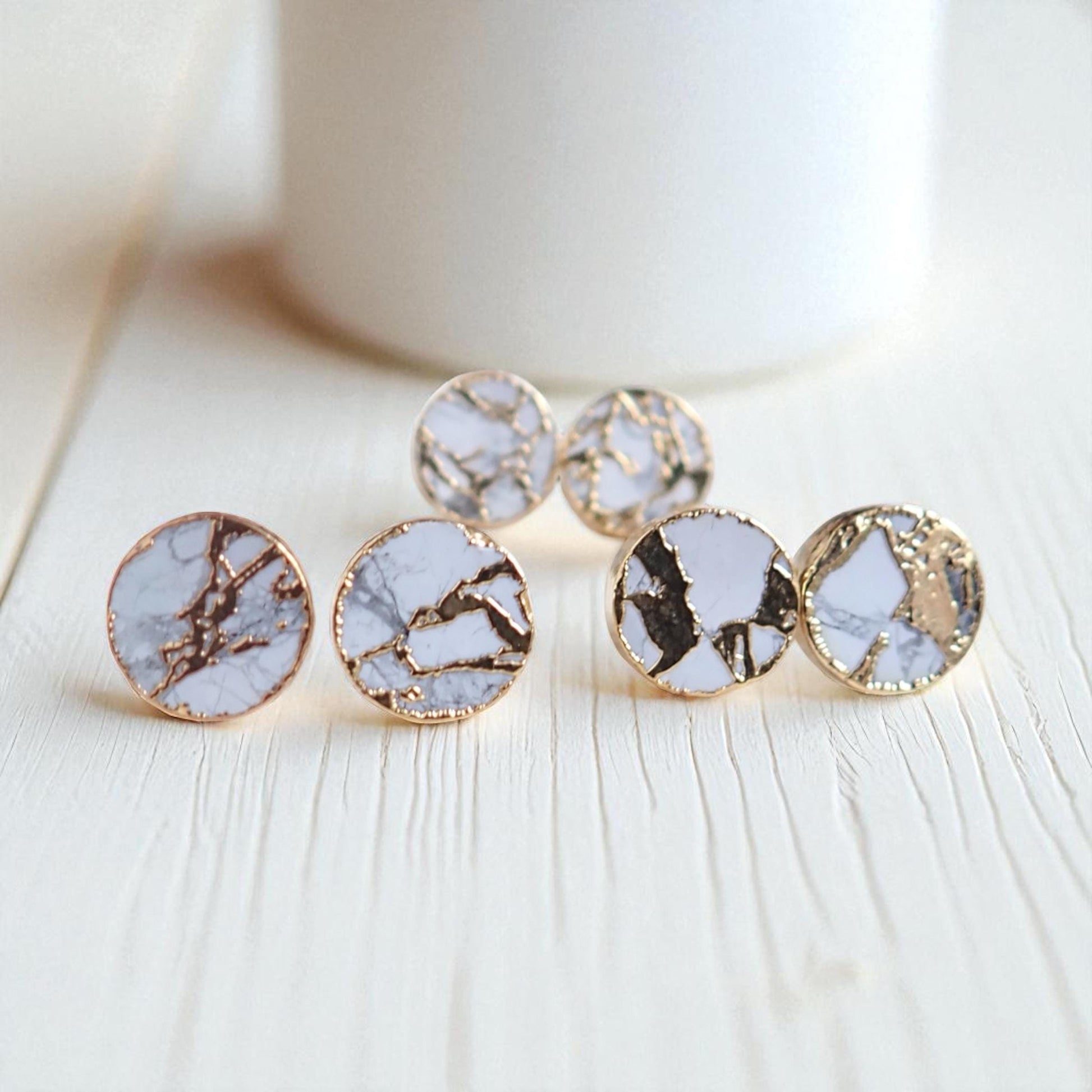 These striking round stud earrings feature a white marble-style design accented with shimmering gold vein details, creating a look reminiscent of white Mojave turquoise or kintsugi pottery. Electroplated in 14k gold, they're lightweight, comfortable, and effortlessly stylish — perfect for everyday wear or as a thoughtful gift. Models are wearing the same style but in different gemstones, also available in the shop.