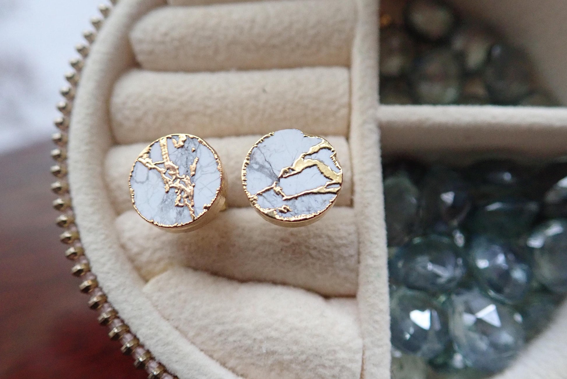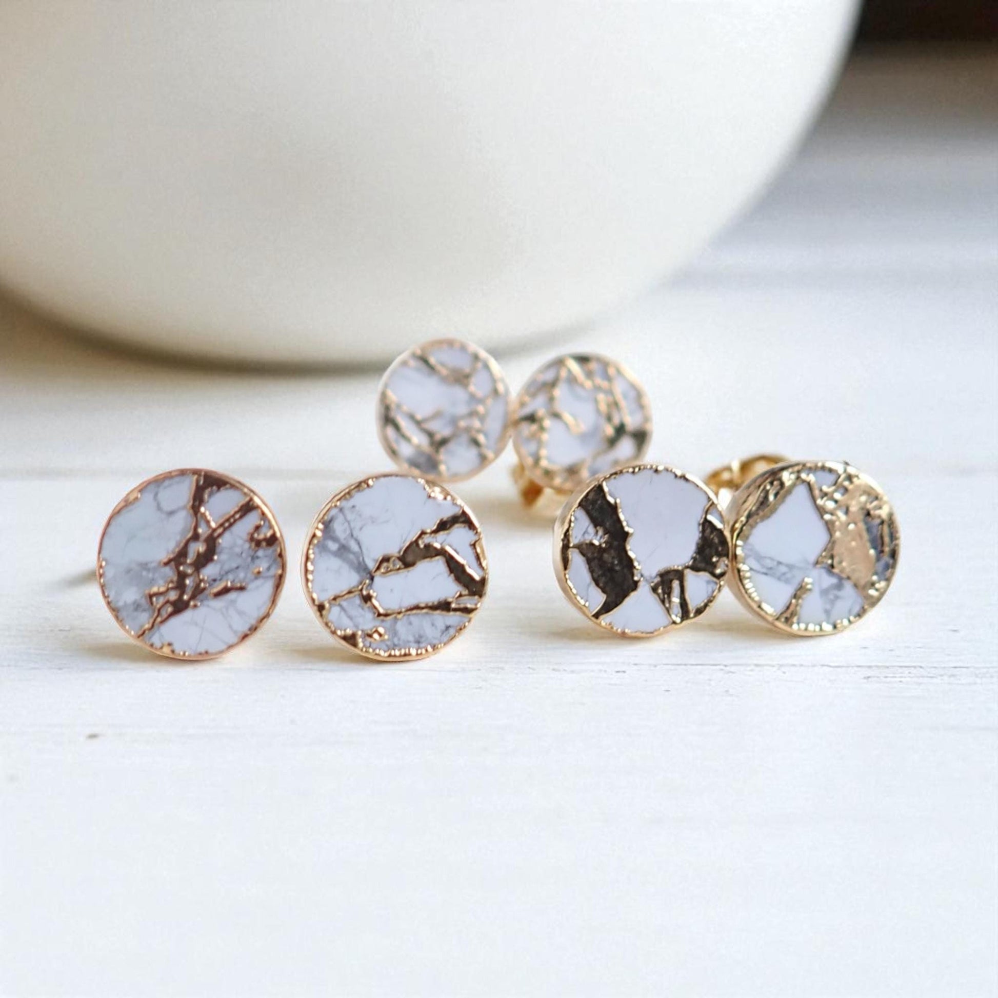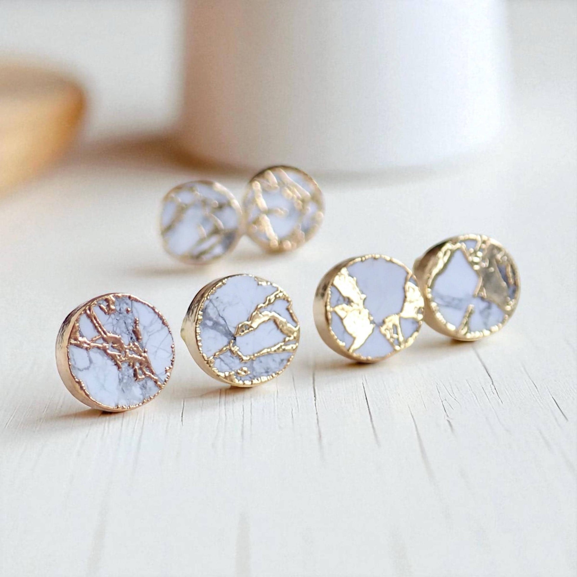 These striking round stud earrings feature a white marble-style design accented with shimmering gold vein details, creating a look reminiscent of white Mojave turquoise or kintsugi pottery. Electroplated in 14k gold, they're lightweight, comfortable, and effortlessly stylish — perfect for everyday wear or as a thoughtful gift. Models are wearing the same style but in different gemstones, also available in the shop.