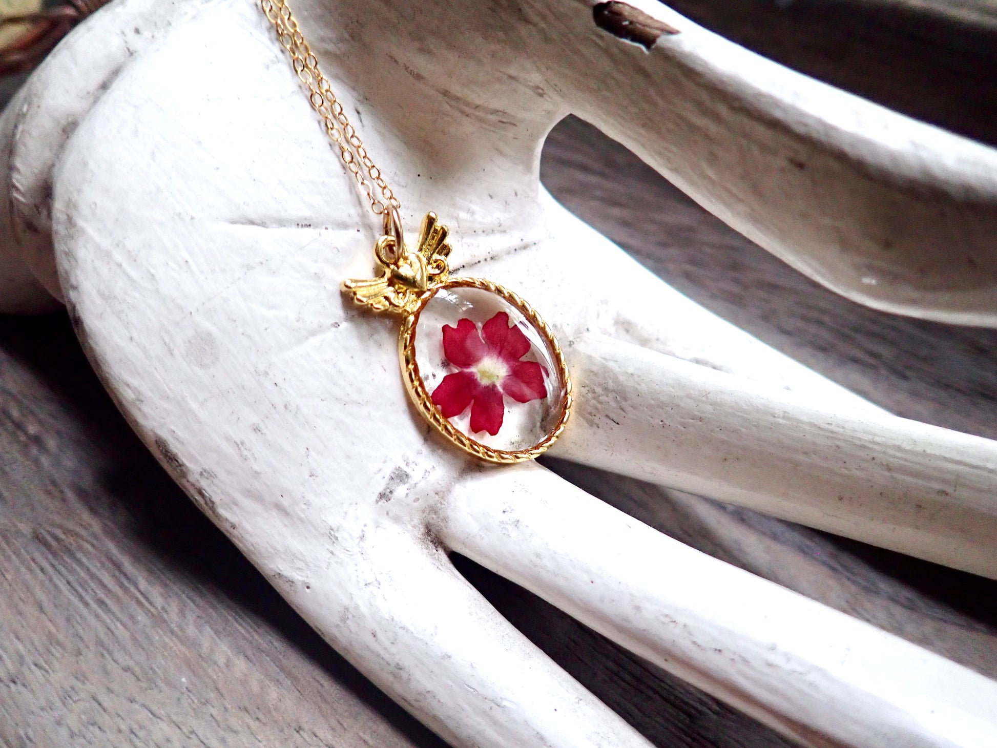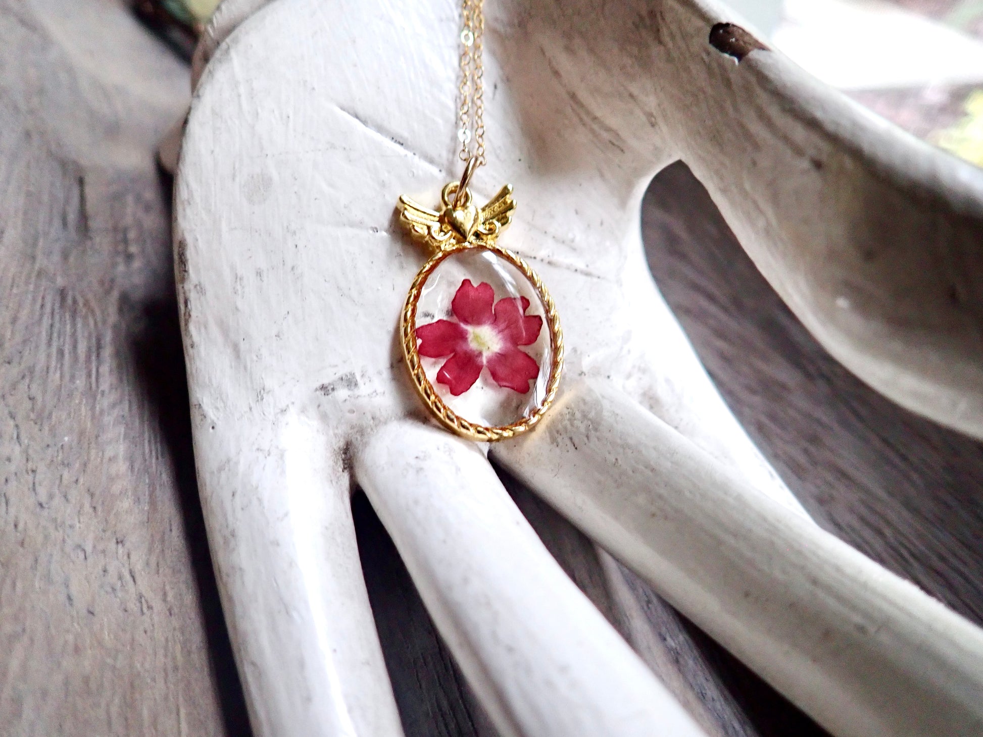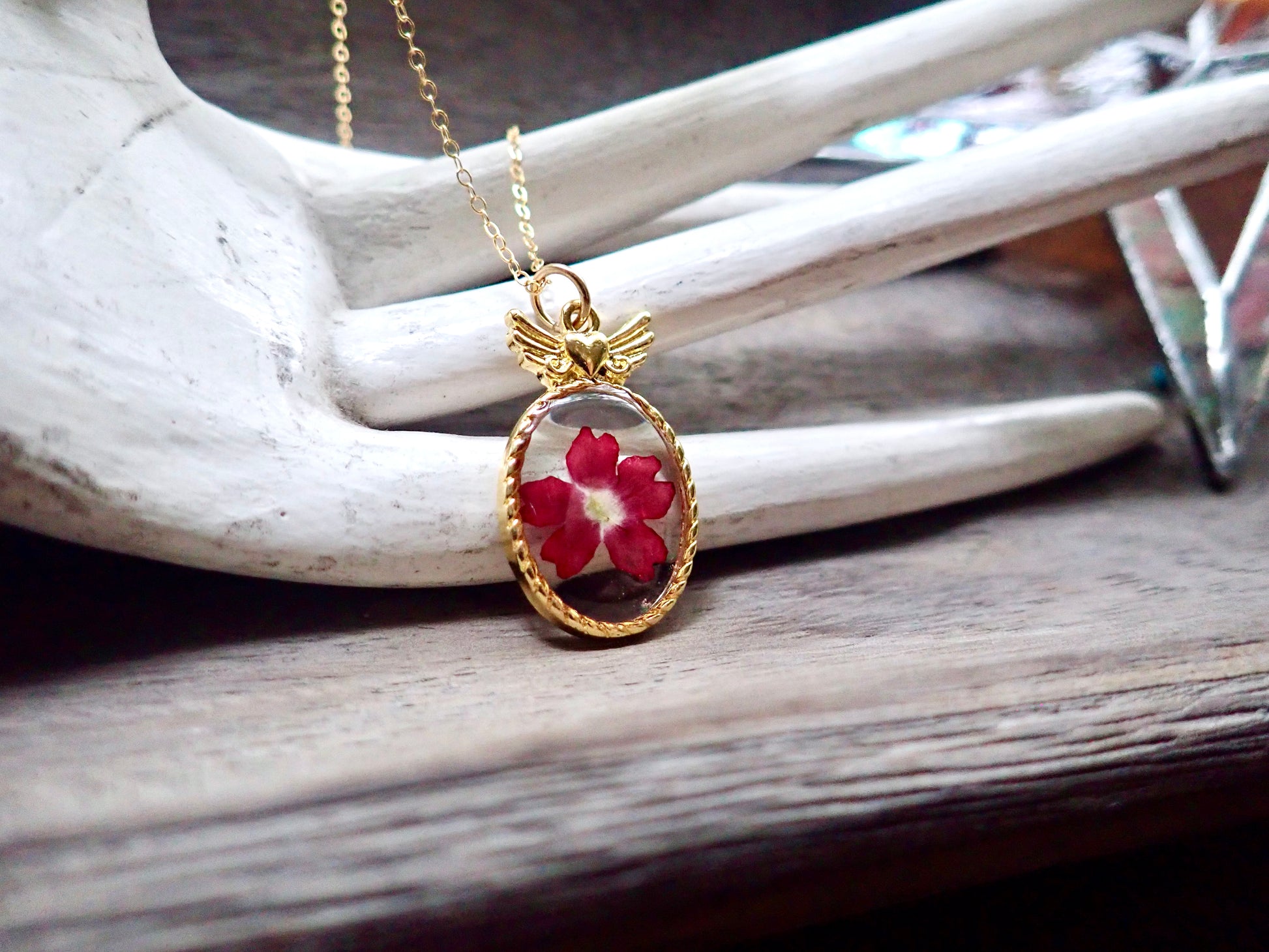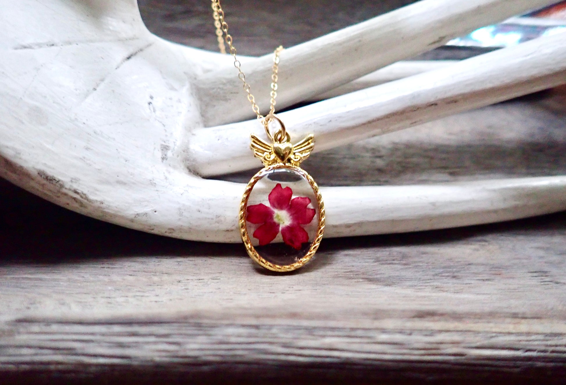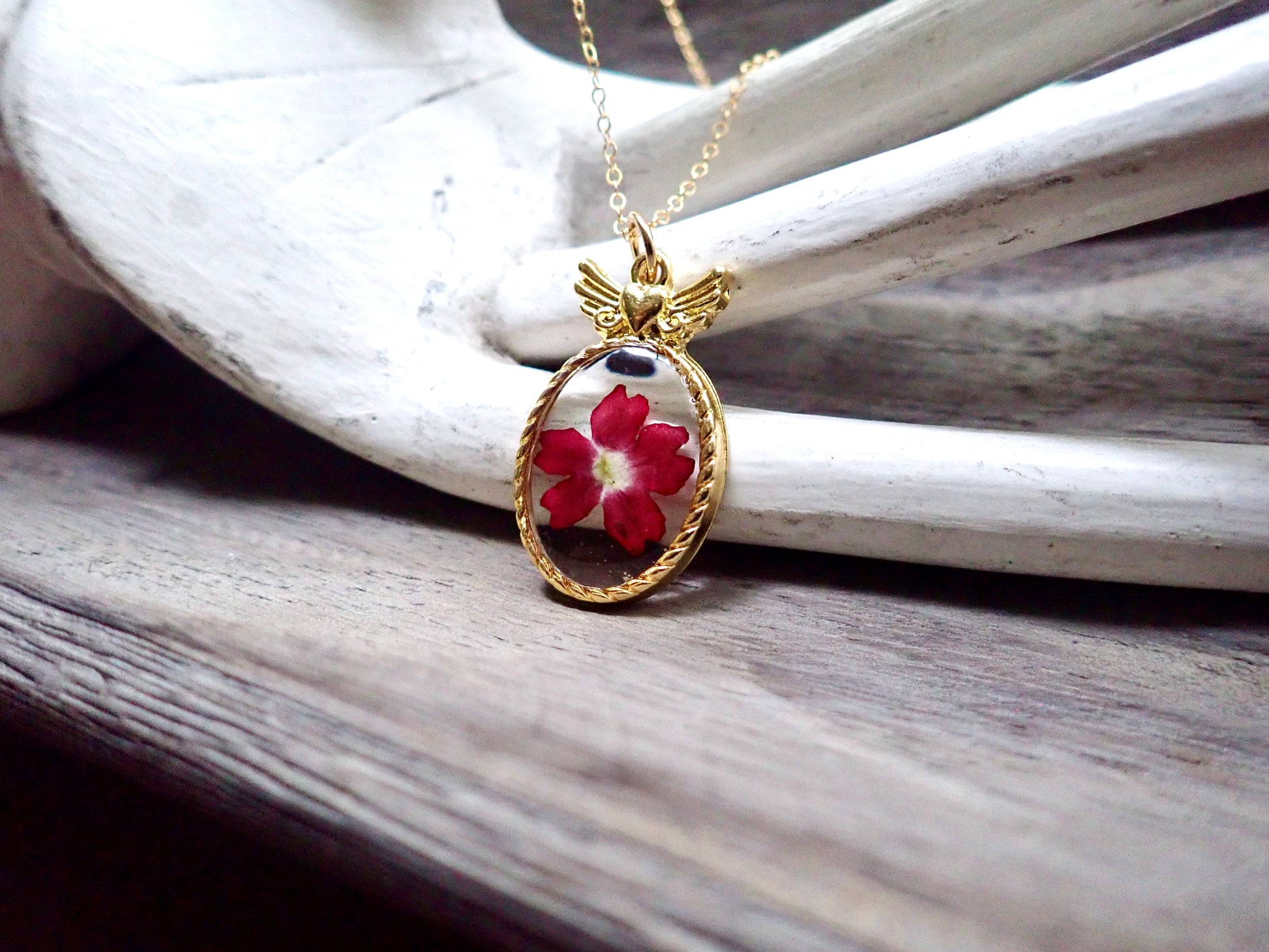 Capture the fleeting beauty of these lovely blooms forever in these sweet little winged heart pendant necklaces. Genuine pressed flowers are set in a delicate gold plated bezel and preserved in resin. Each pendant will be 100% unique since all flowers, just like people, are different and that is part of what makes us all so beautiful.
